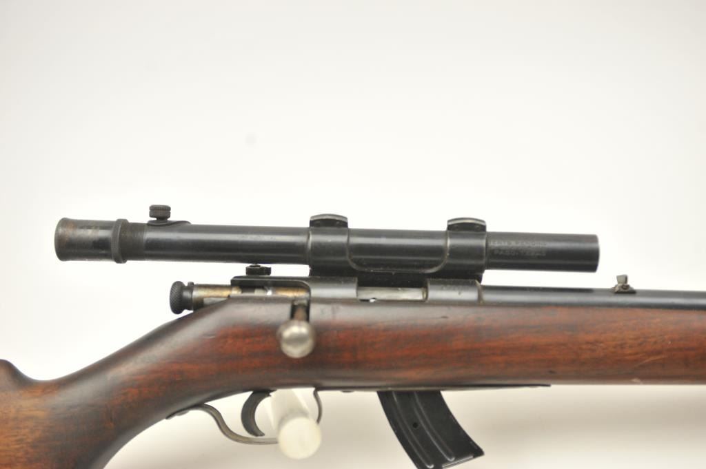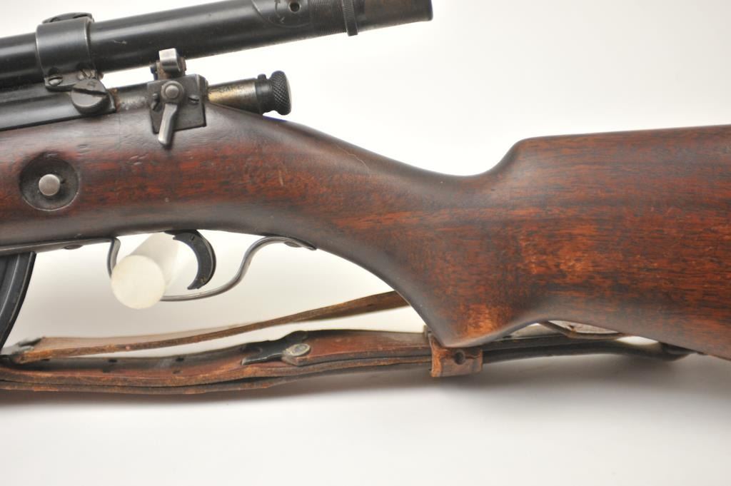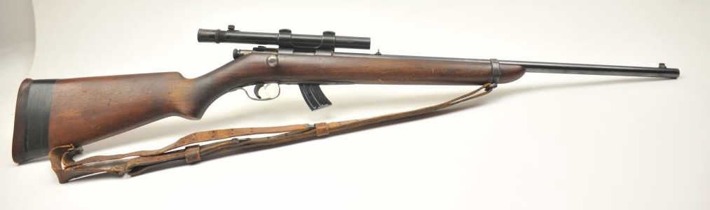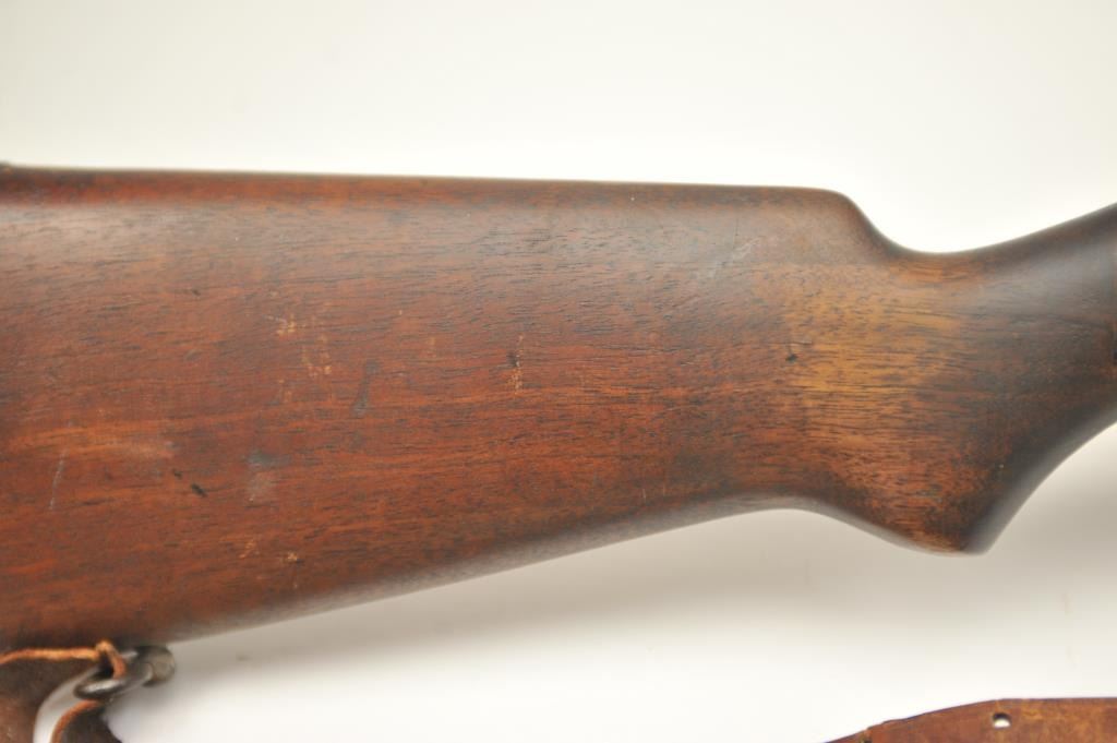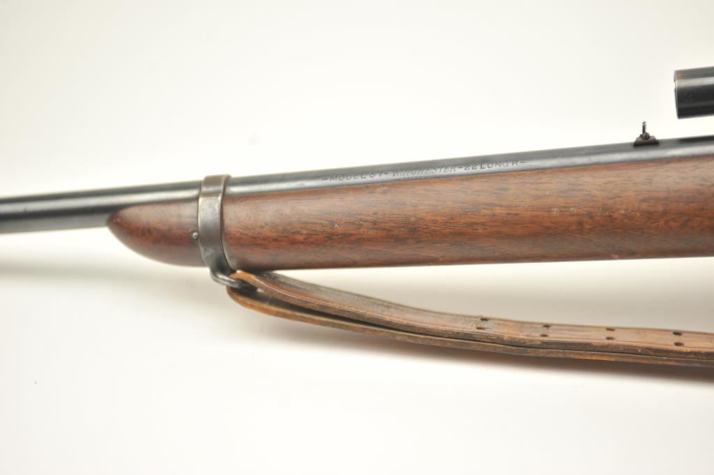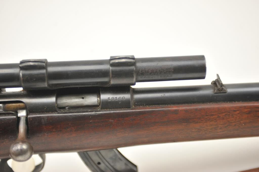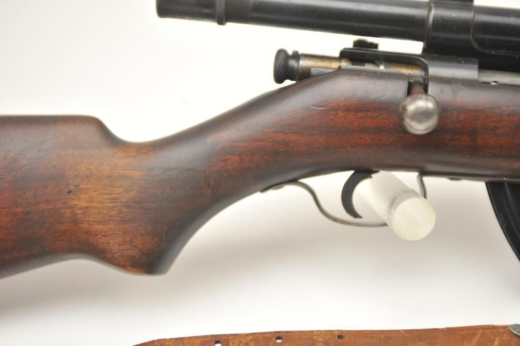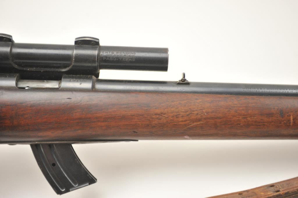 Winchester Model 57 bolt action rifle, .22 Long Rifle caliber, Serial #19100. The rifle is in good overall condition with a 22” barrel. The rifle retains the majority of the original blue finish with wear consistent with field use. The rifle is topped with a vintage side mount and Weaver Model 29S scope. The smooth wood stock shows heavy use with mars, dents and the butt stock has been extended with a plastic spacer anddeteriorating pad providing a 14” LOP. The bore is dirty and may clean to fair and the action works well. The rifle includes sling swivels, a leather military style sling and one correct magazine. A seldom seenWinchester circa 1930. Est.: $100-$200. (C+R).