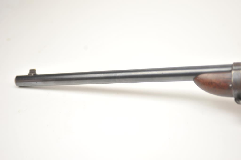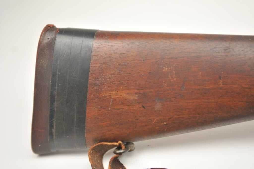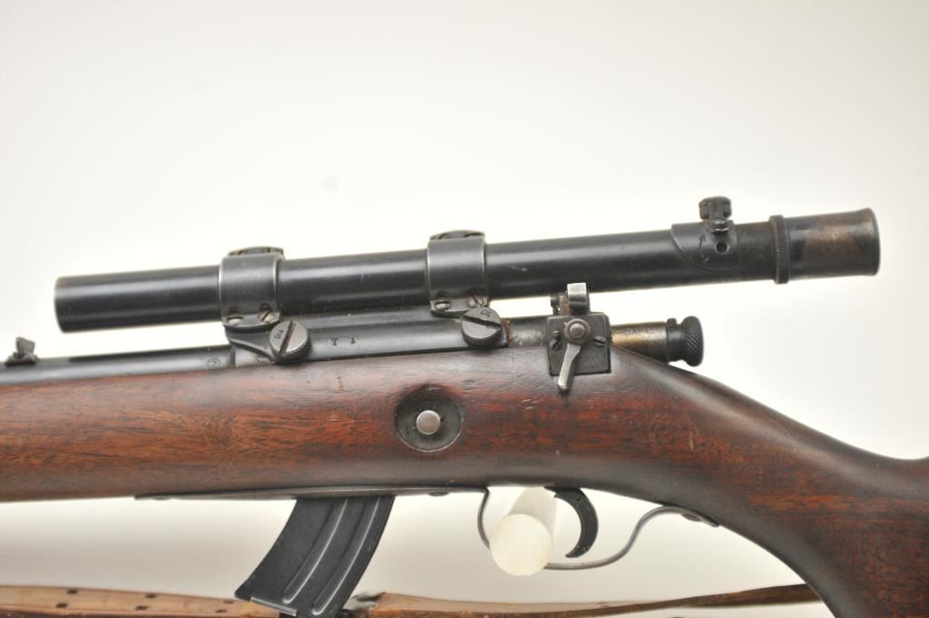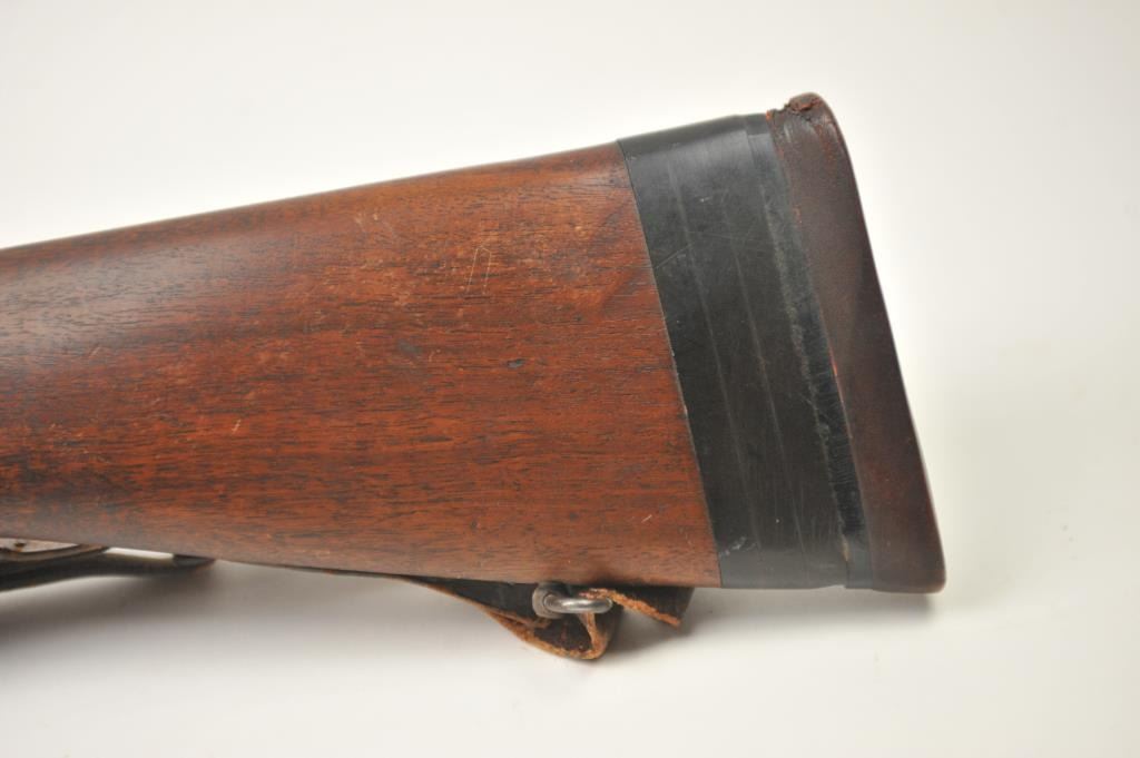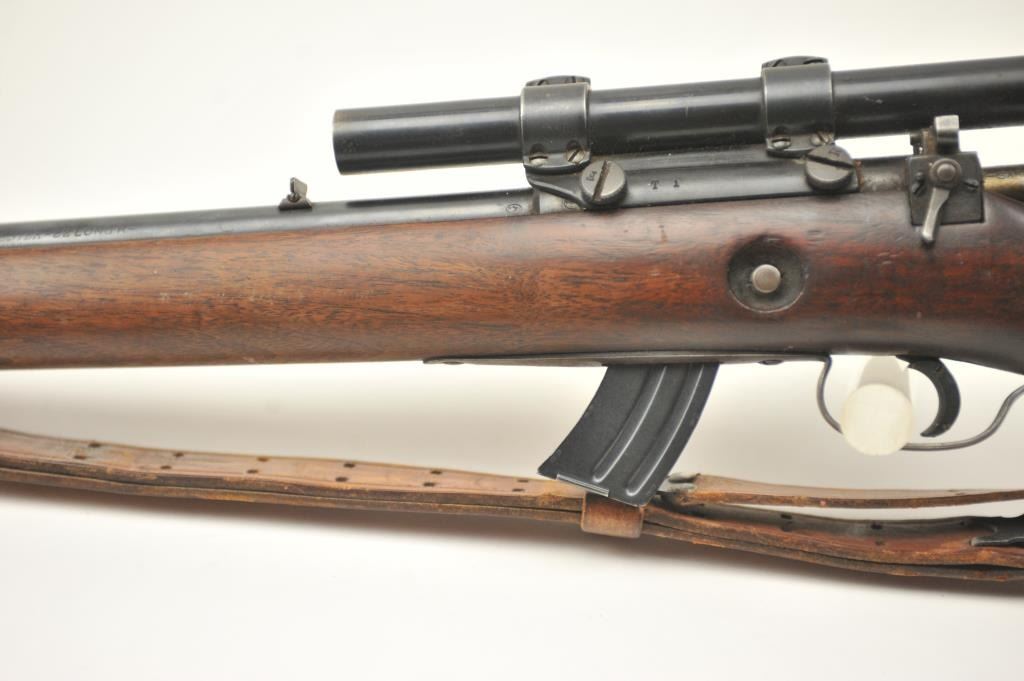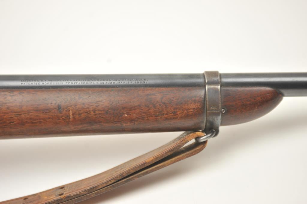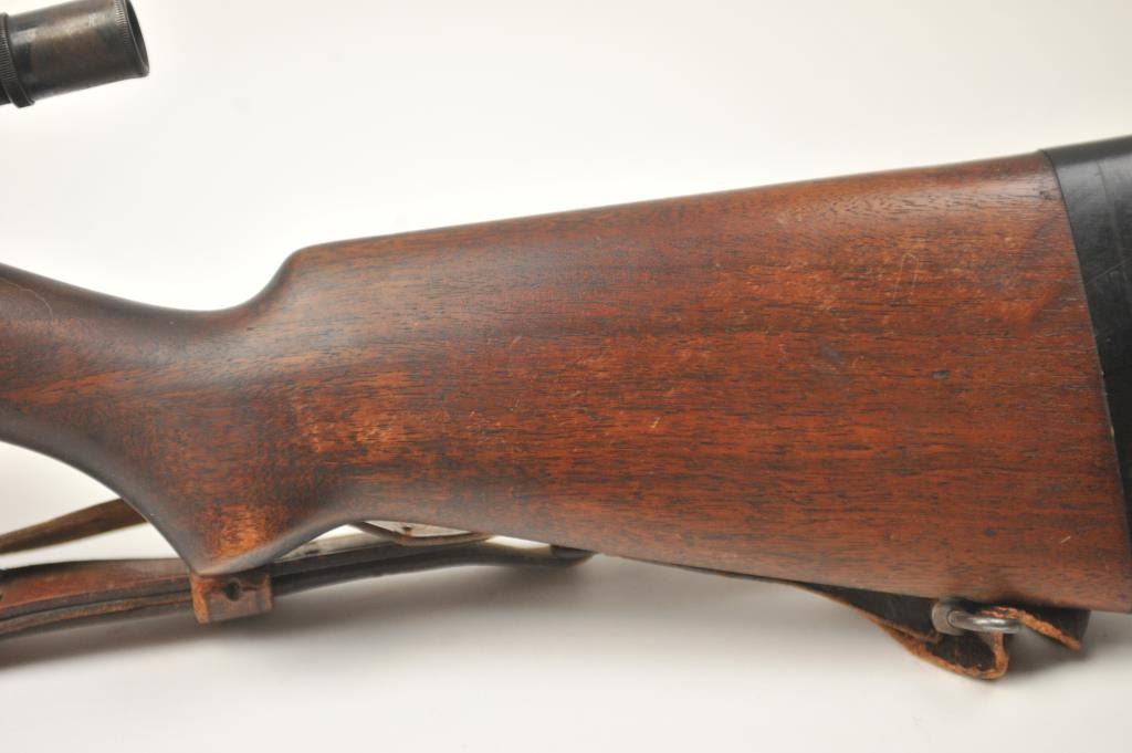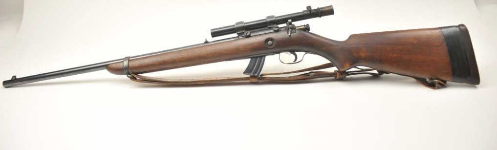 Winchester Model 57 bolt action rifle, .22 Long Rifle caliber, Serial #19100. The rifle is in good overall condition with a 22” barrel. The rifle retains the majority of the original blue finish with wear consistent with field use. The rifle is topped with a vintage side mount and Weaver Model 29S scope. The smooth wood stock shows heavy use with mars, dents and the butt stock has been extended with a plastic spacer anddeteriorating pad providing a 14” LOP. The bore is dirty and may clean to fair and the action works well. The rifle includes sling swivels, a leather military style sling and one correct magazine. A seldom seenWinchester circa 1930. Est.: $100-$200. (C+R).