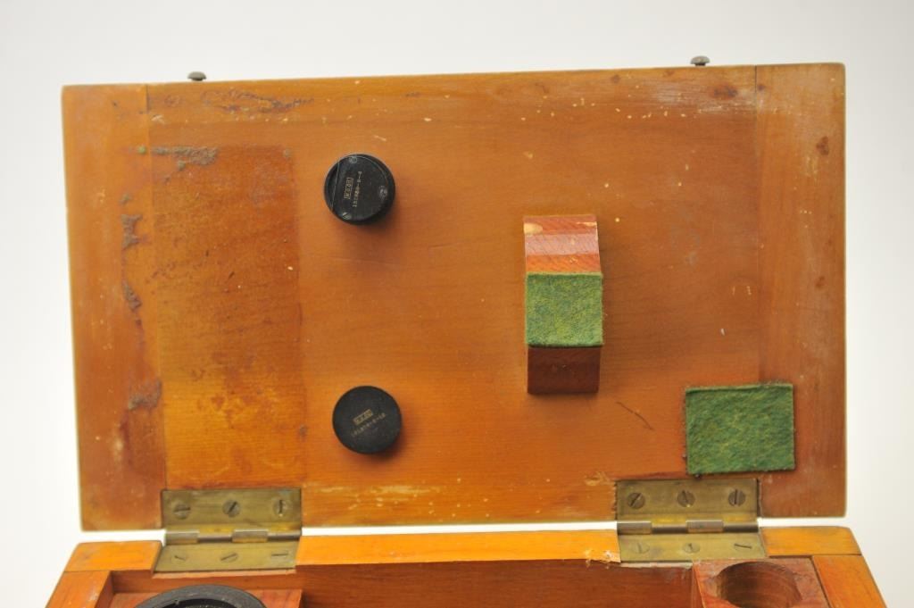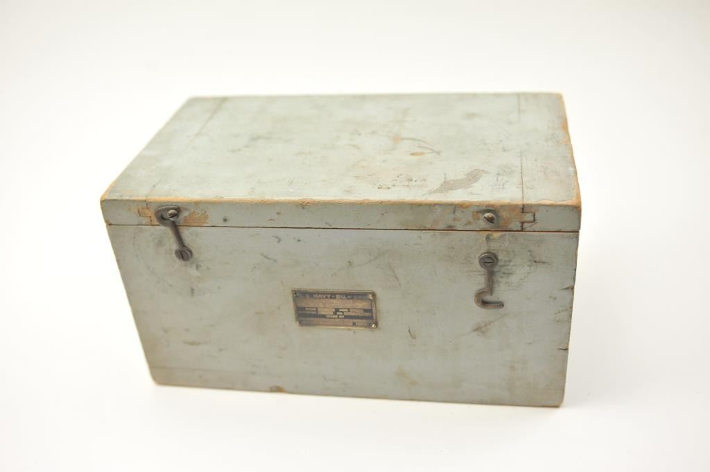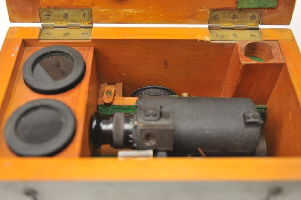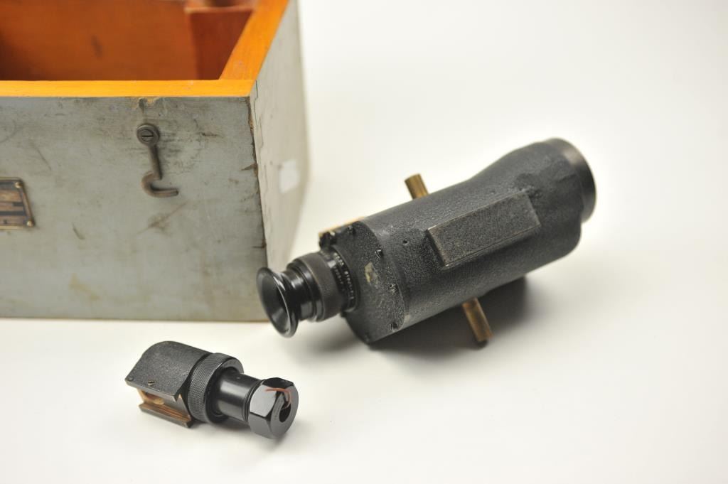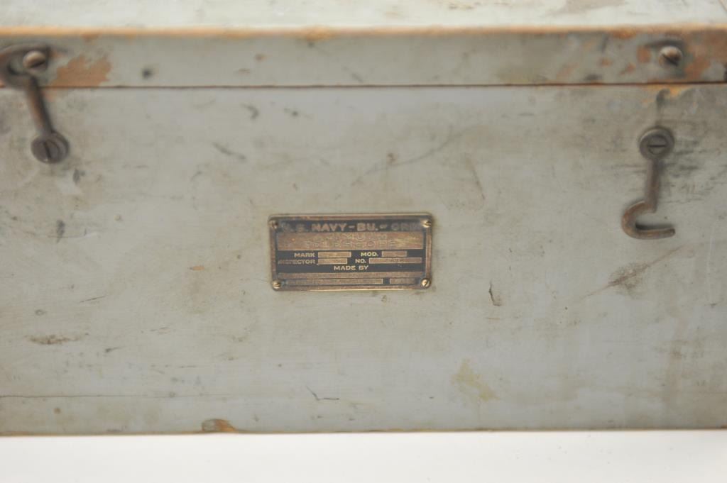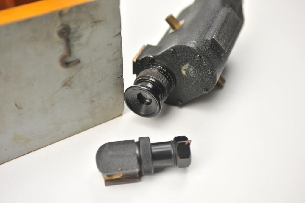 WWII Navy Azimuth Telescope by the Wollensak Optical Company in the original 1943 dated wooden case. The lot includes all filters and a light in the lid of the case. A great WWII item in very good to near fine originalcondition. Est.: $150-$300.