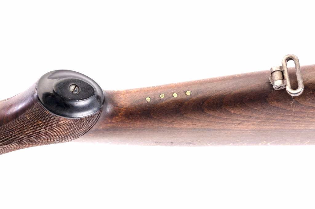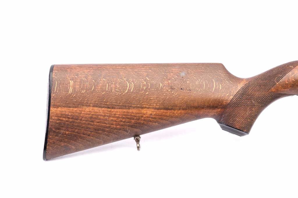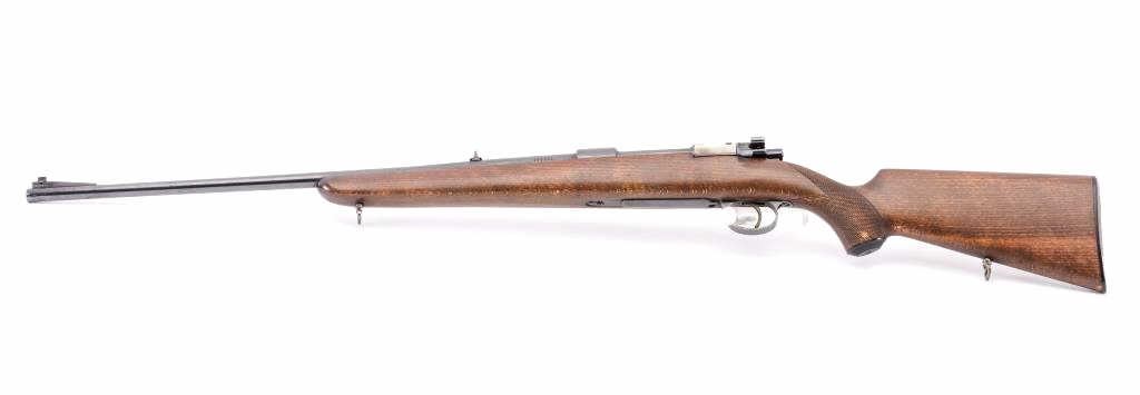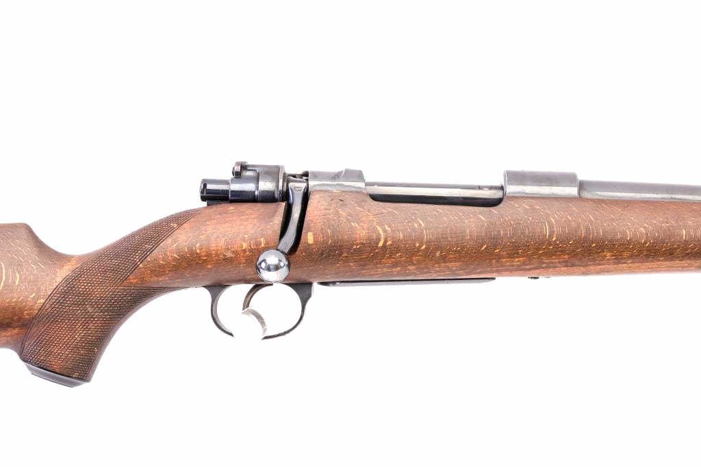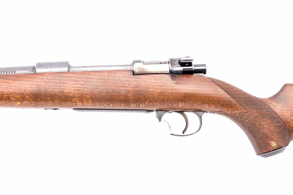 Husqvarna Commercial Model 98 Mauser bolt action sporting rifle, 8 x 57 caliber, Serial #102550. The rifle is in very good overall condition with a 24” barrel with a hooded blade front and standing leaf rear sights. The barrel retains the majority of its blue finish with a sling swivel added. The barrel address reads, “HUSQVARNA VAPENFABRIKS A.B. KAL. 8 x 57.” The receiver retains a significant amount of factory blue finish with bright niter blue on the bolt release. The custom checkered Walnut stock is in good condition with fine figure and finish. The stock is a replacement with a beaded cheek piece and upgraded wood. The butt stock retains the sling swivels, leather sling and ends with a solid rubber recoil pad. The bore is good, the action is crisp and the markings are sharp on this Husqvarna built on an FN action. Est.: $600-$1,200. (C+R).