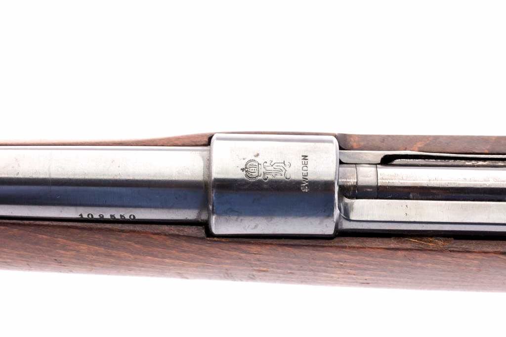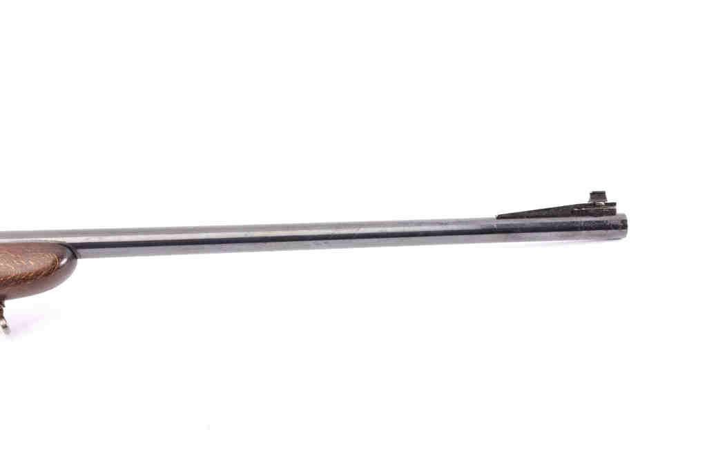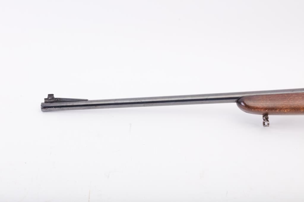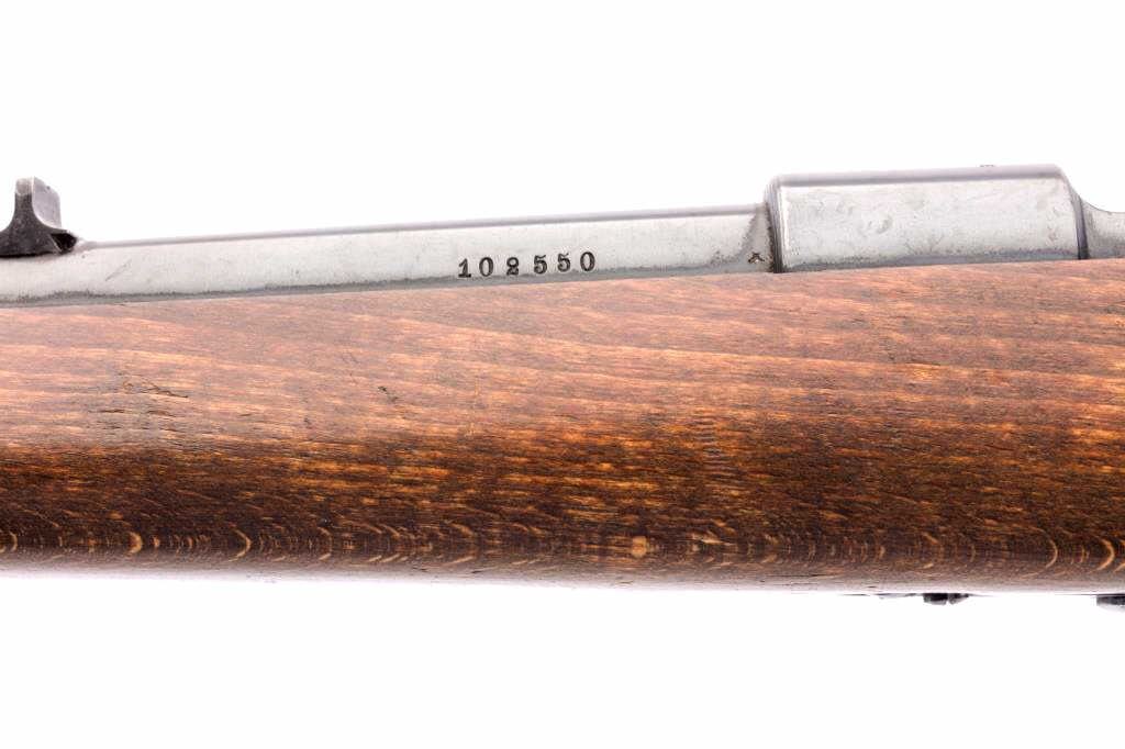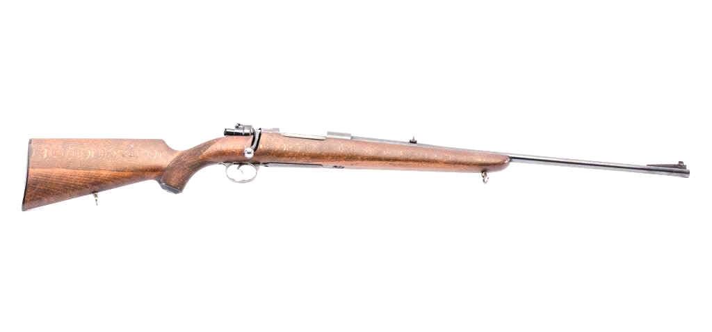 Husqvarna Commercial Model 98 Mauser bolt action sporting rifle, 8 x 57 caliber, Serial #102550. The rifle is in very good overall condition with a 24” barrel with a hooded blade front and standing leaf rear sights. The barrel retains the majority of its blue finish with a sling swivel added. The barrel address reads, “HUSQVARNA VAPENFABRIKS A.B. KAL. 8 x 57.” The receiver retains a significant amount of factory blue finish with bright niter blue on the bolt release. The custom checkered Walnut stock is in good condition with fine figure and finish. The stock is a replacement with a beaded cheek piece and upgraded wood. The butt stock retains the sling swivels, leather sling and ends with a solid rubber recoil pad. The bore is good, the action is crisp and the markings are sharp on this Husqvarna built on an FN action. Est.: $600-$1,200. (C+R).