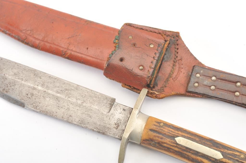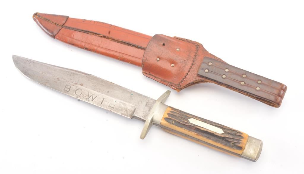 F.A. Bower Solingen, Germany marked Bowie knife with stag grip, 8” blade, 12 ½” overall length. The blades shows minor pitting with the #68, with scabbard. The knife is 1890’s to 1930’s. Est.: $100-200