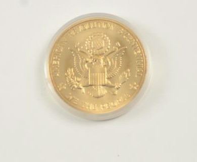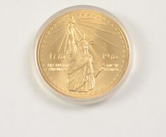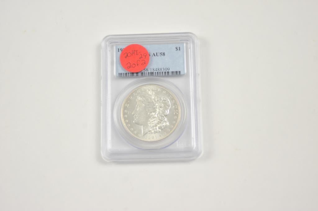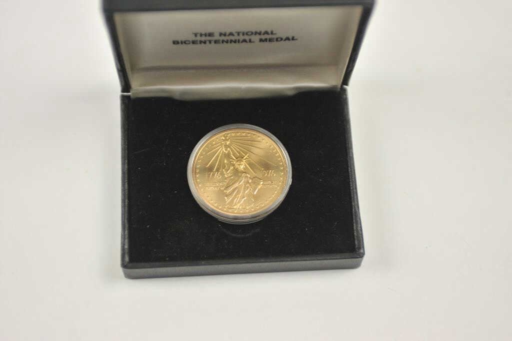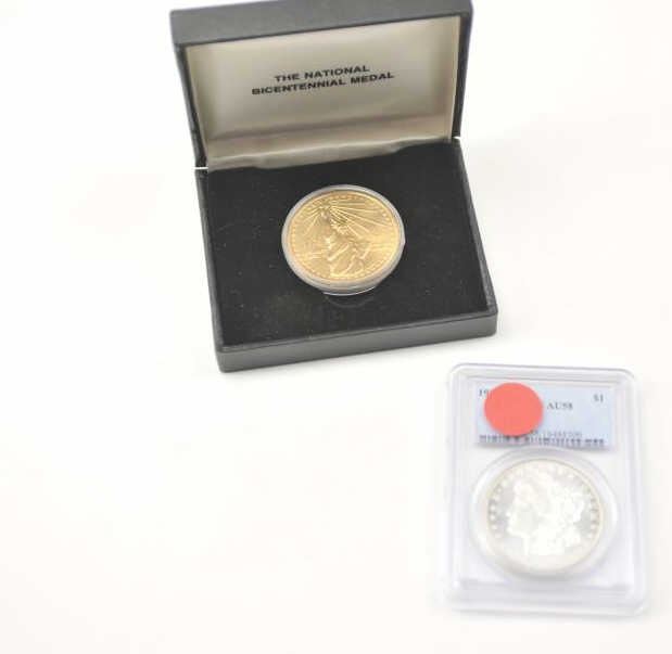 1921-S Morgan silver dollar, PCGS graded AU-58 with a gold plated U.S. Bi-Centennial medal in the original case. Est.: $50-$100.
