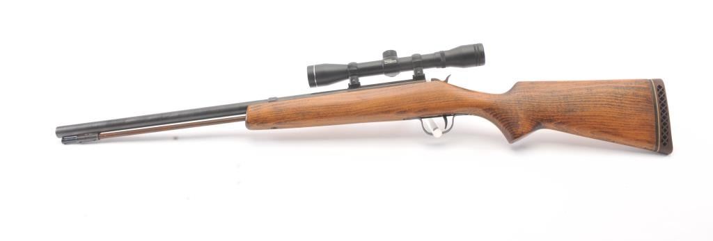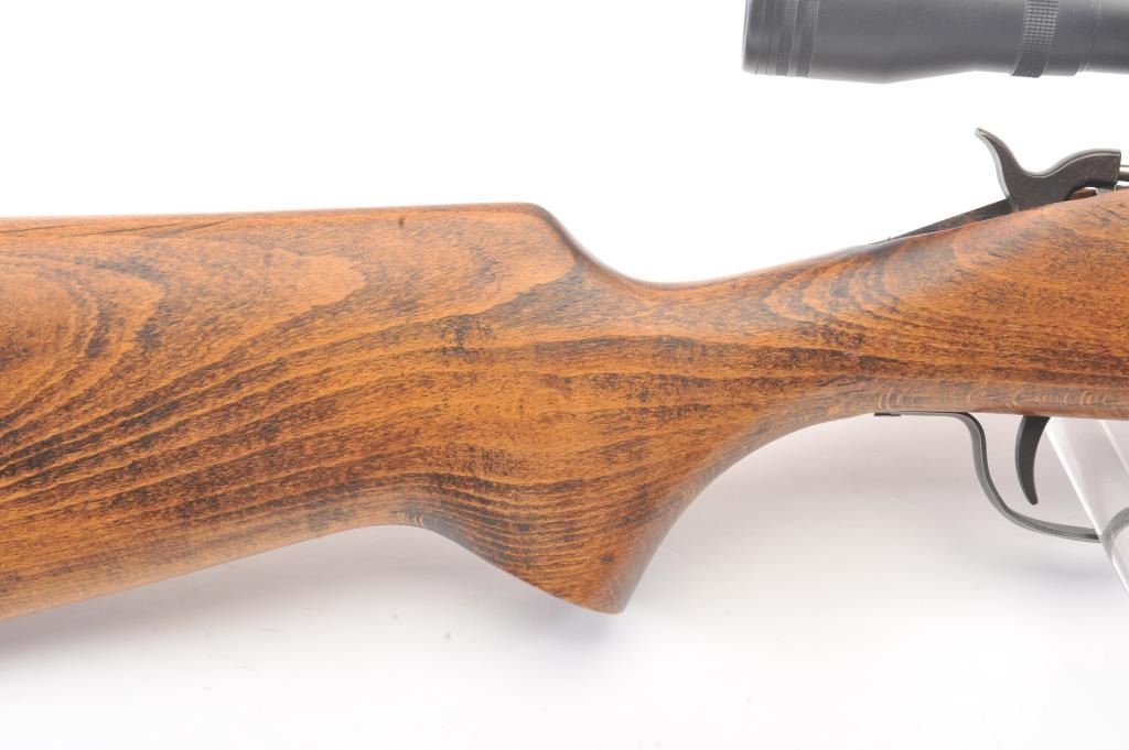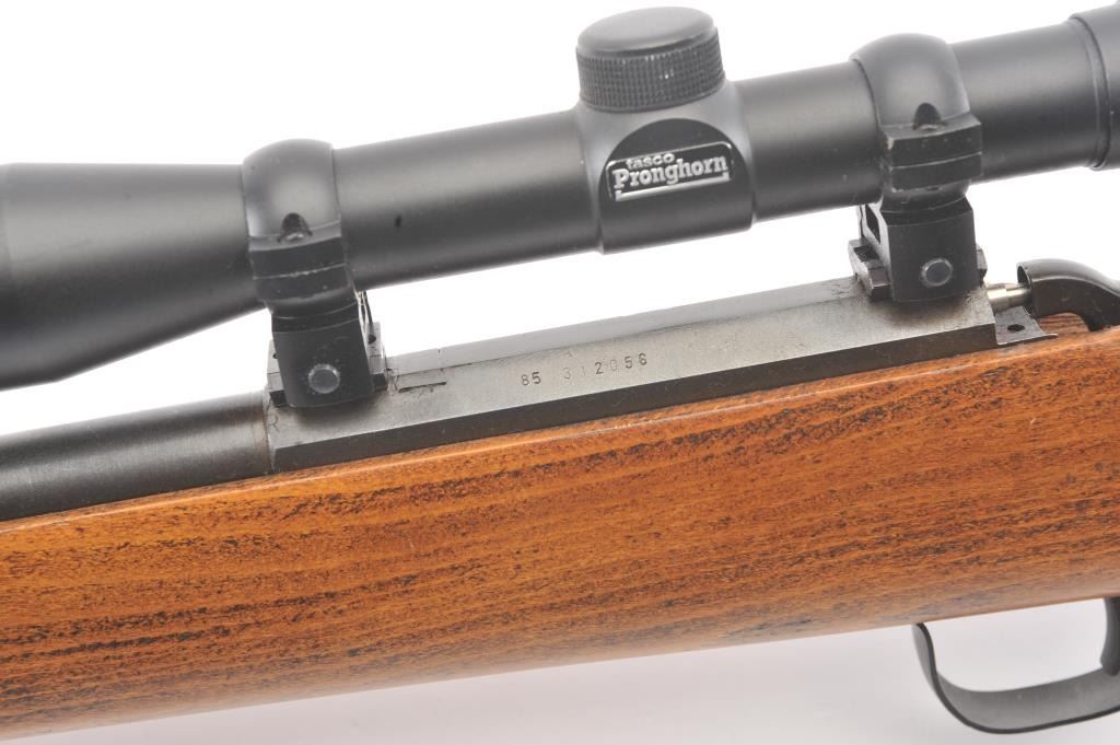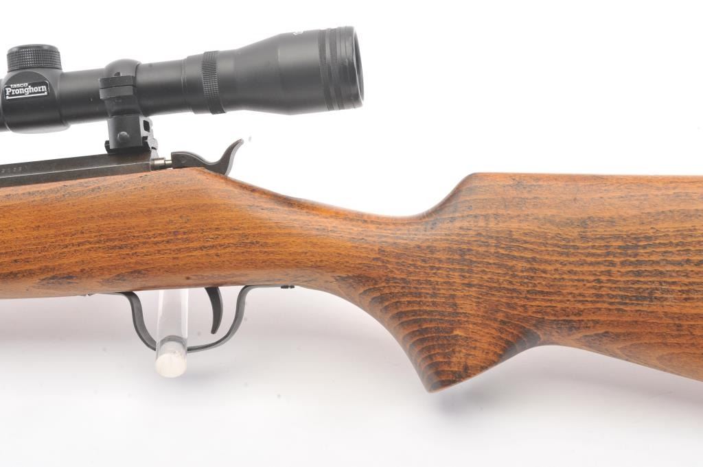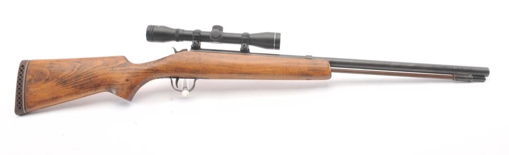 Inline Black Powder single shot rifle, .50 caliber, Serial #312056. The rifle is in good overall condition with a 25” round barrel with ramrod. The metal surfaces have gone to a dark patina. The smooth wood stock is in good condition and ends with a ventilated rubber pad. The rifle is topped with a Tasco Pronghorn fixed power scope. Est.: $150-$300. (Modern).