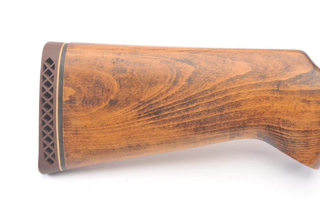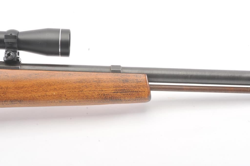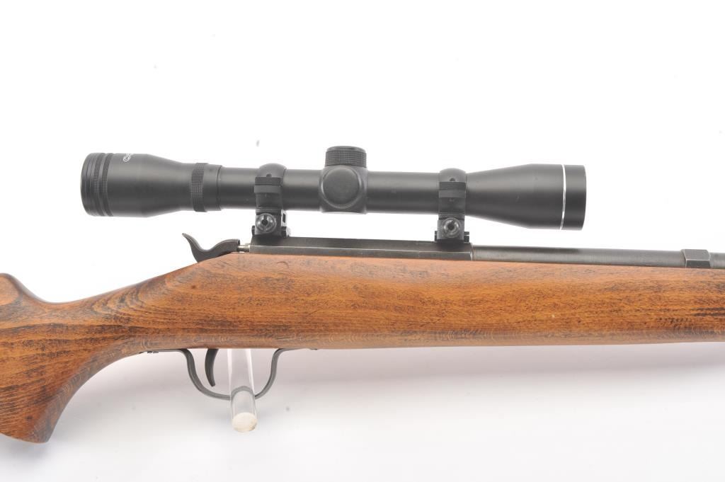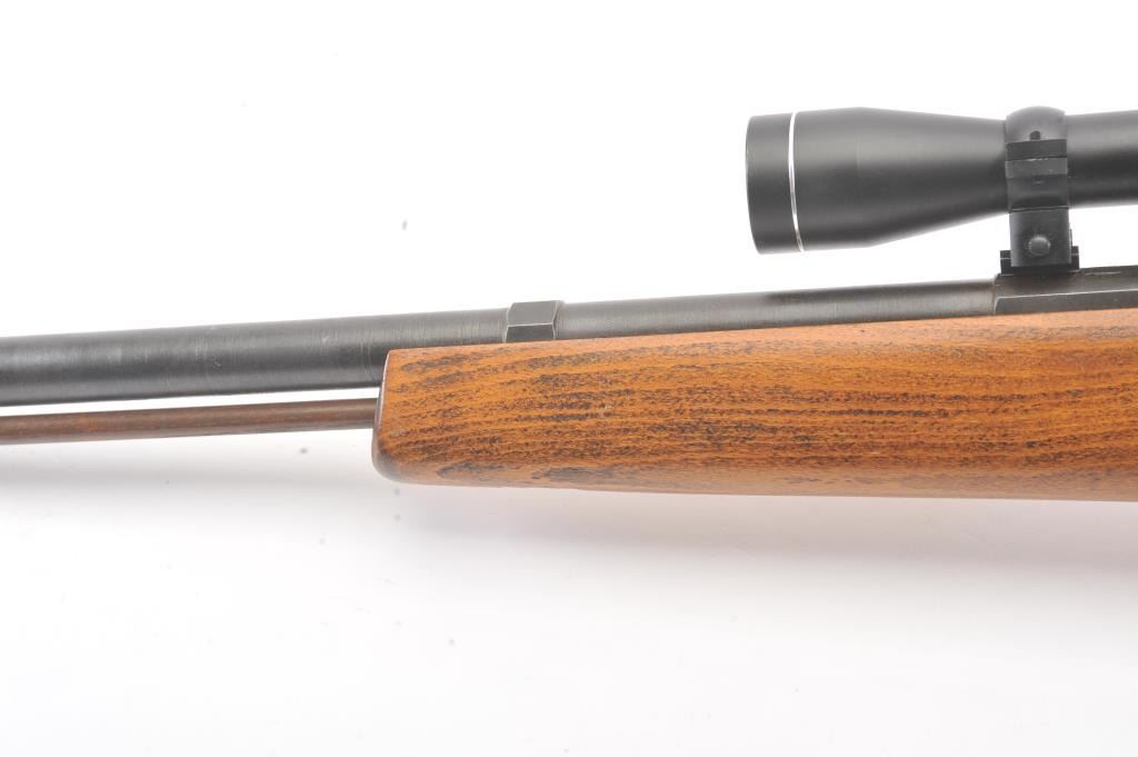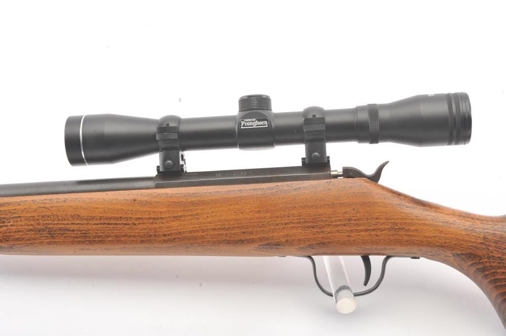 Inline Black Powder single shot rifle, .50 caliber, Serial #312056. The rifle is in good overall condition with a 25” round barrel with ramrod. The metal surfaces have gone to a dark patina. The smooth wood stock is in good condition and ends with a ventilated rubber pad. The rifle is topped with a Tasco Pronghorn fixed power scope. Est.: $150-$300. (Modern).