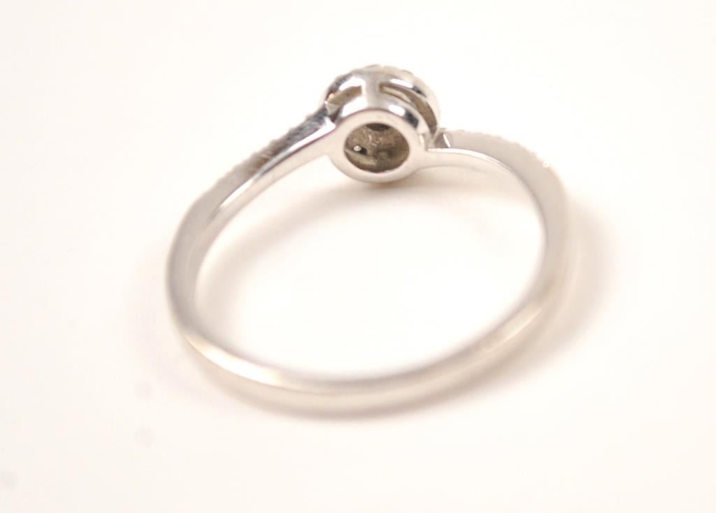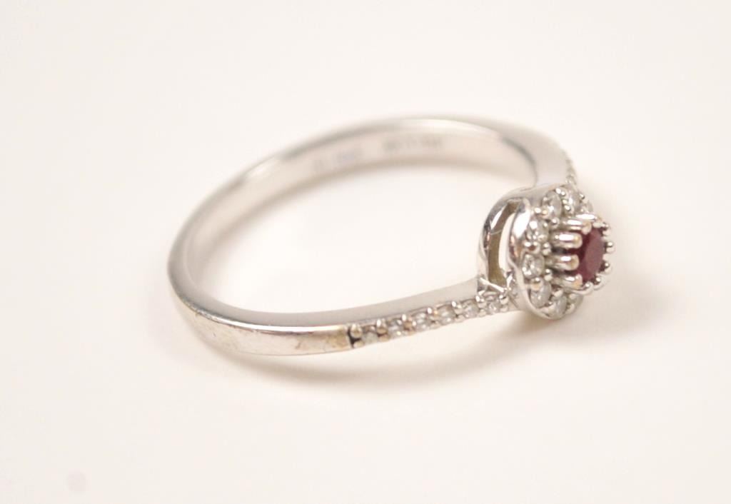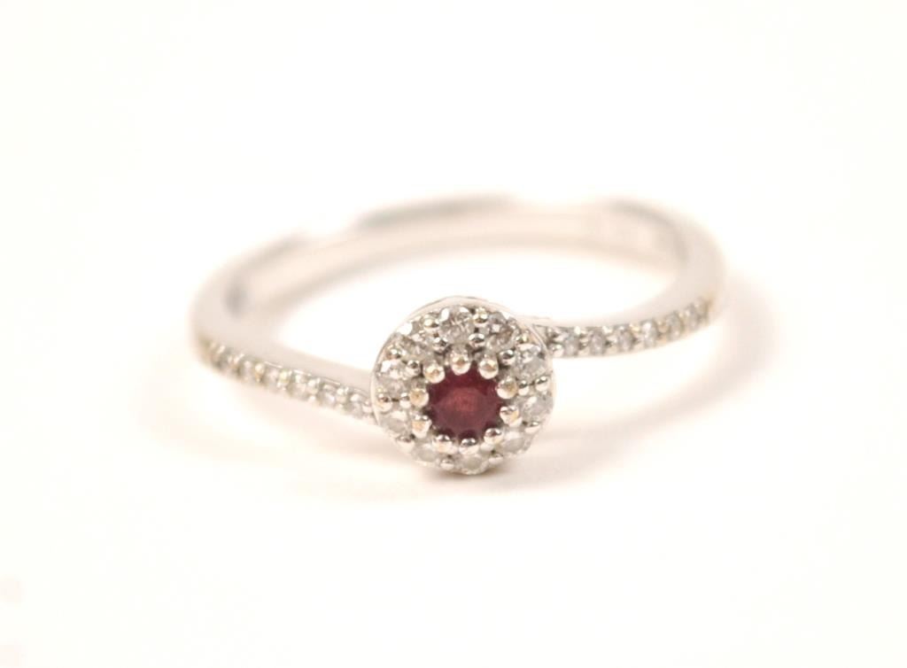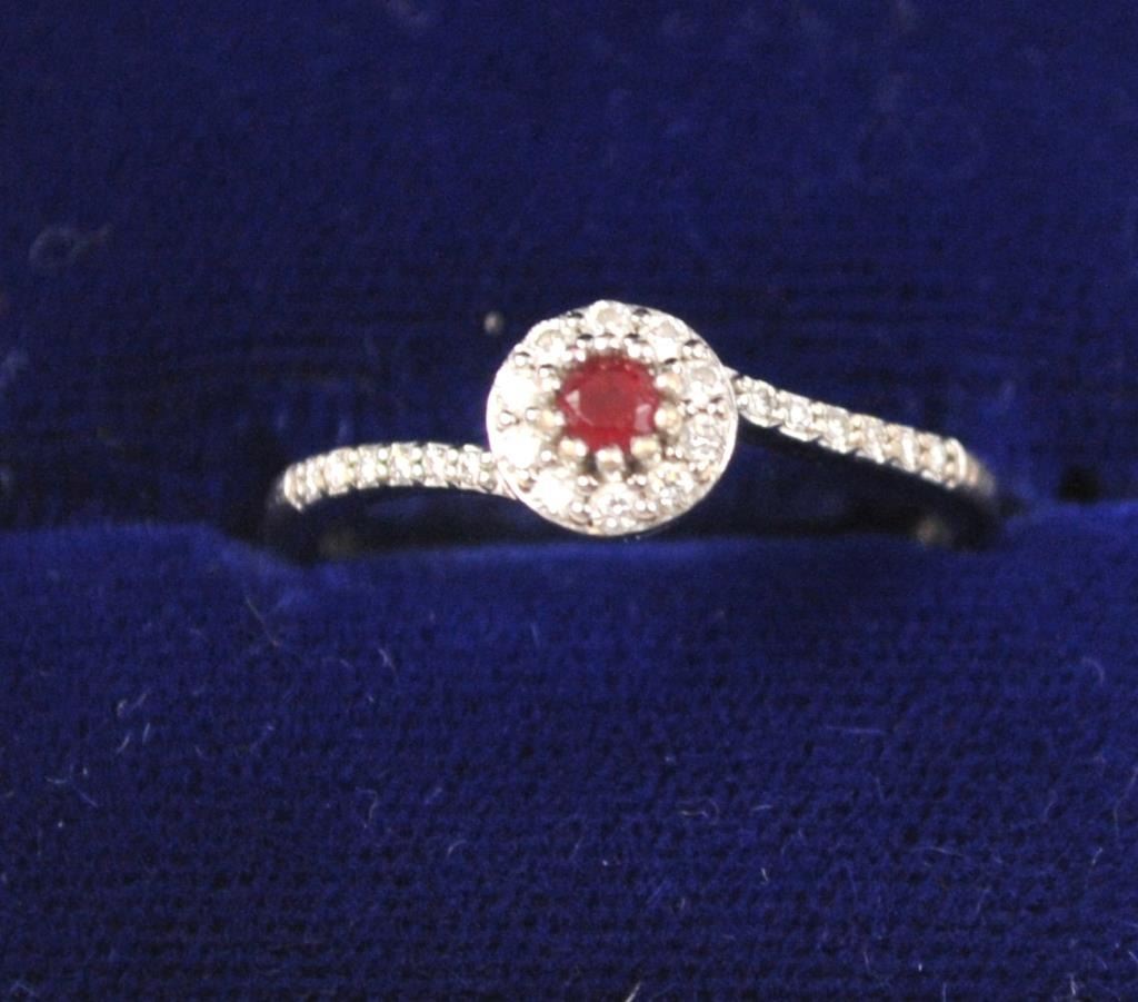 Lot 800e One petite ruby diamond halo ring made in 18 k white gold Est:$150-300