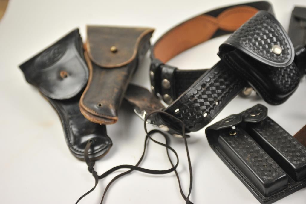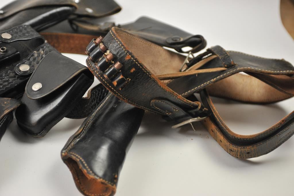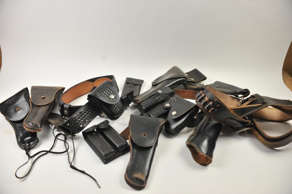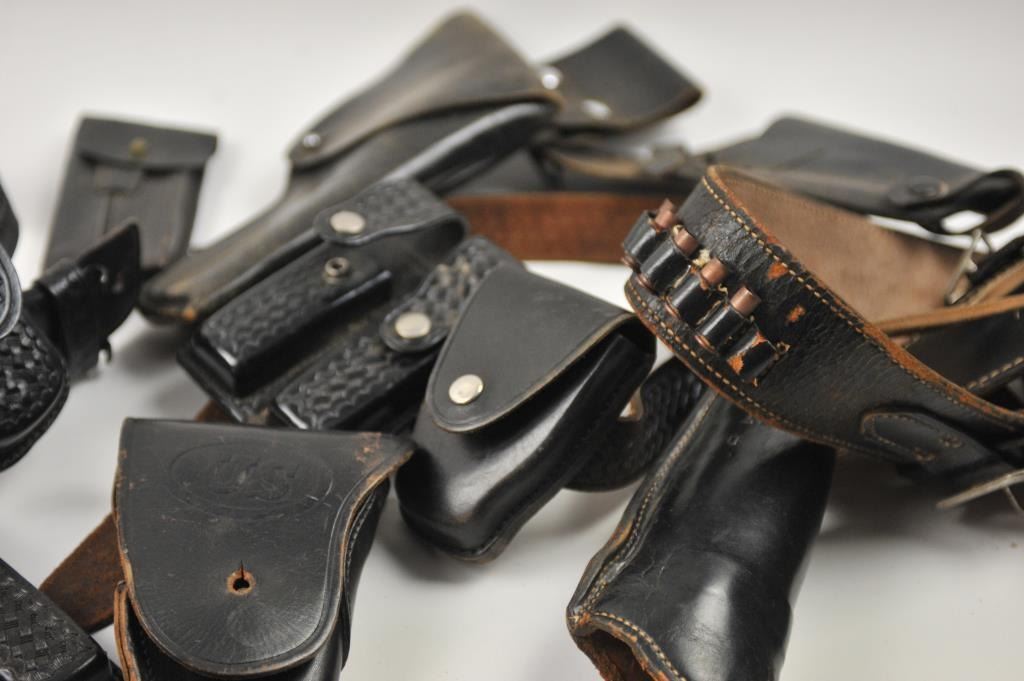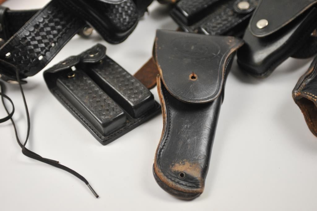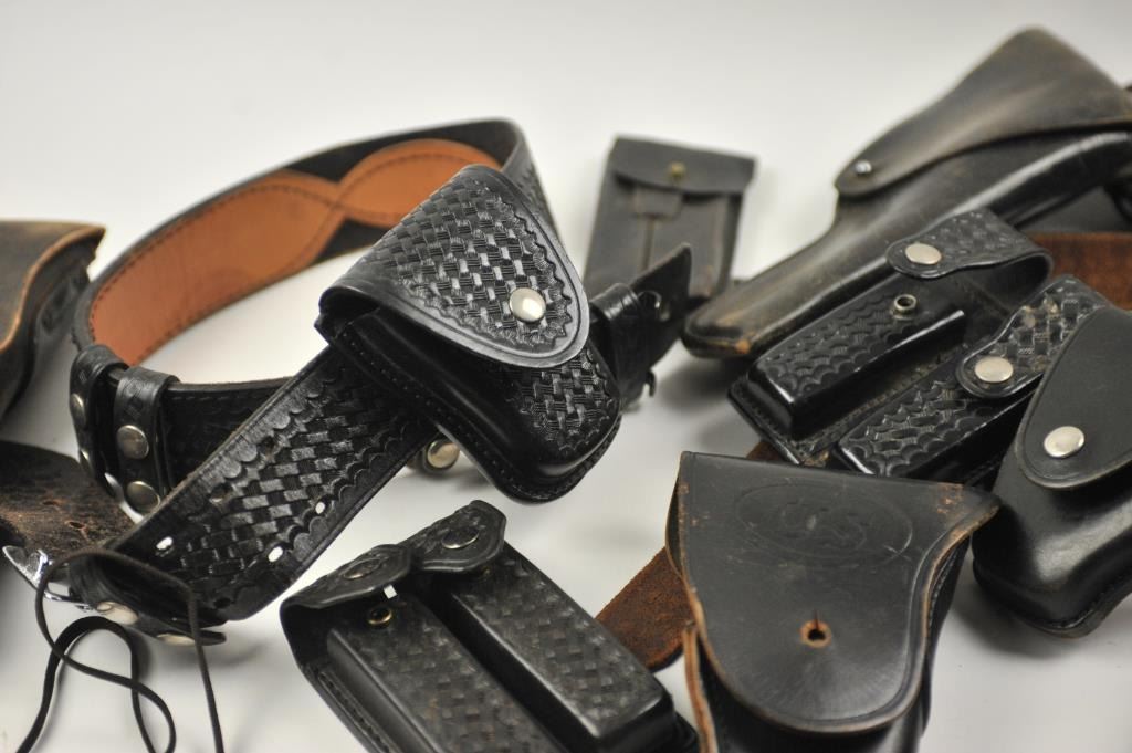 Leather lot of 2 basket weave gun belts, 6 leather flap duty holsters and 2 leather magazine pouches, all in good condition. Est.: $100-$300.