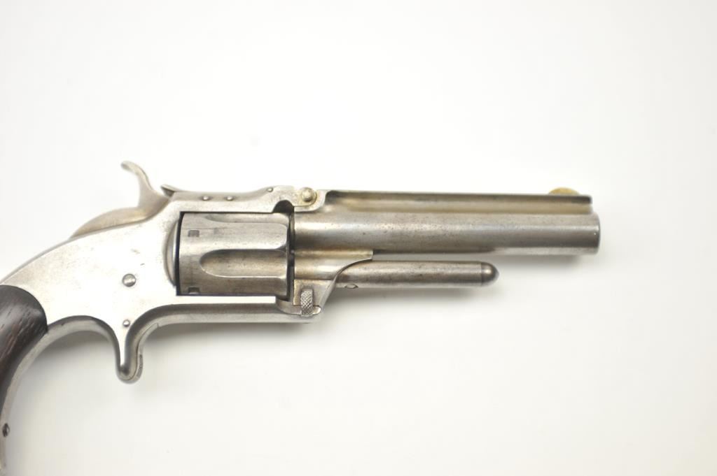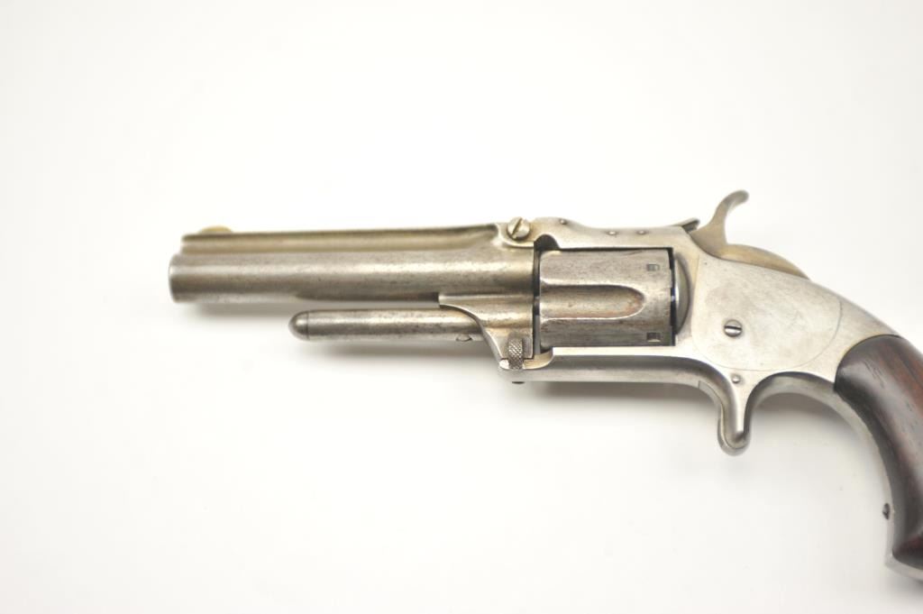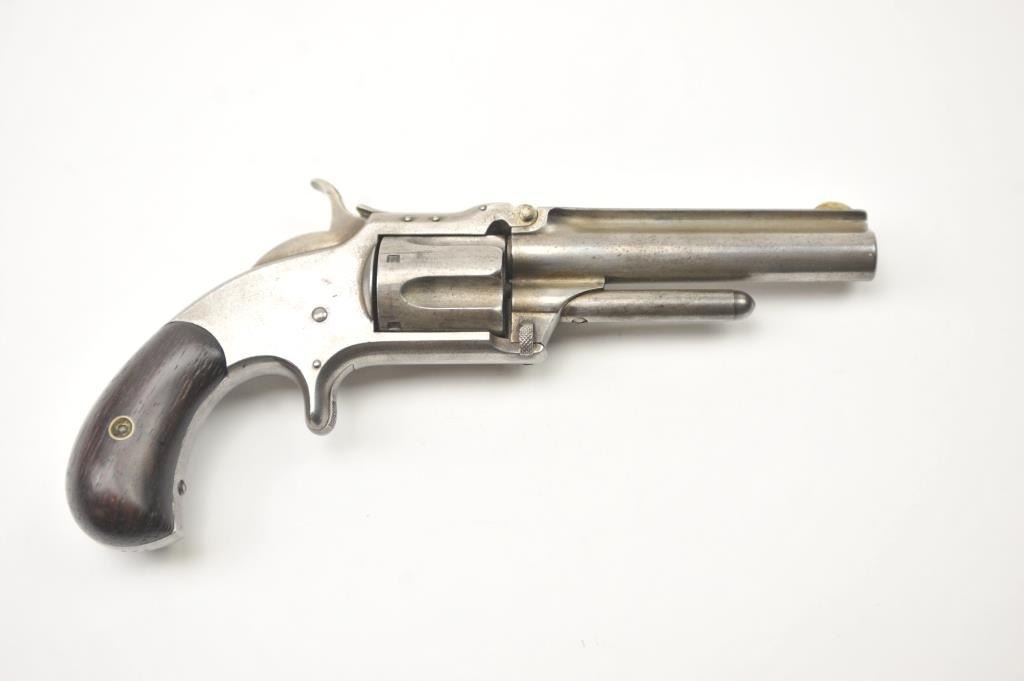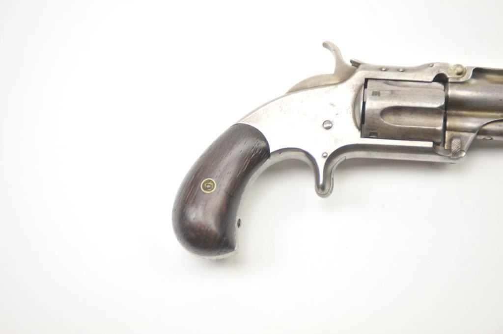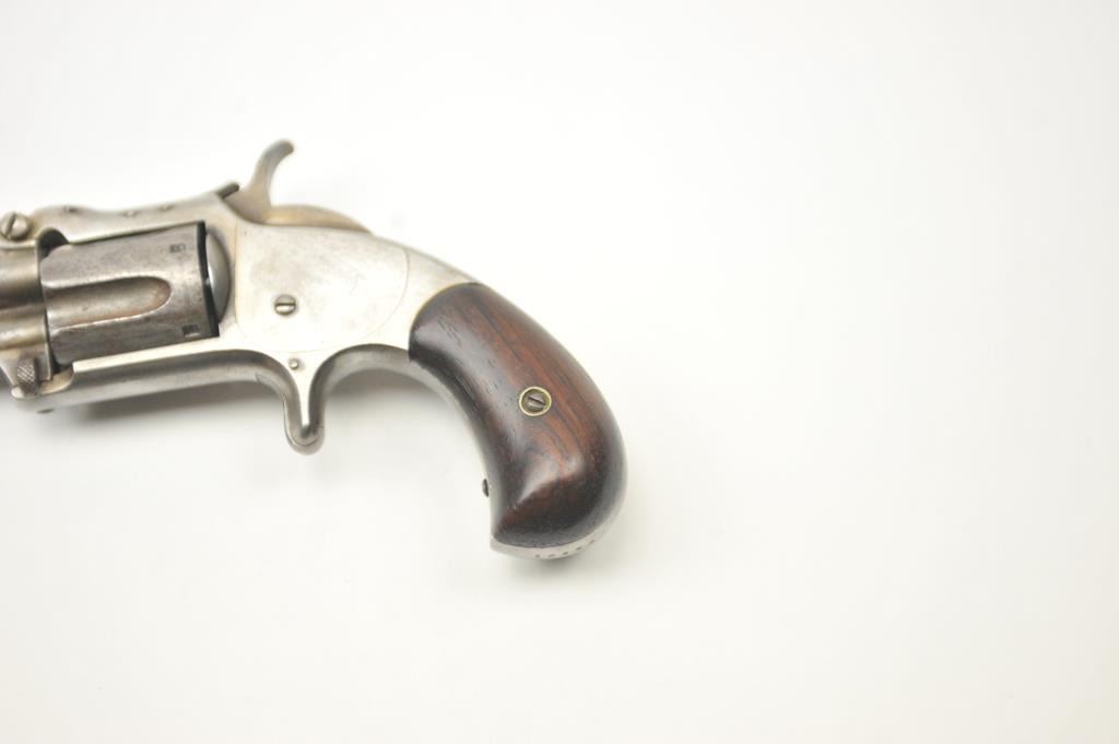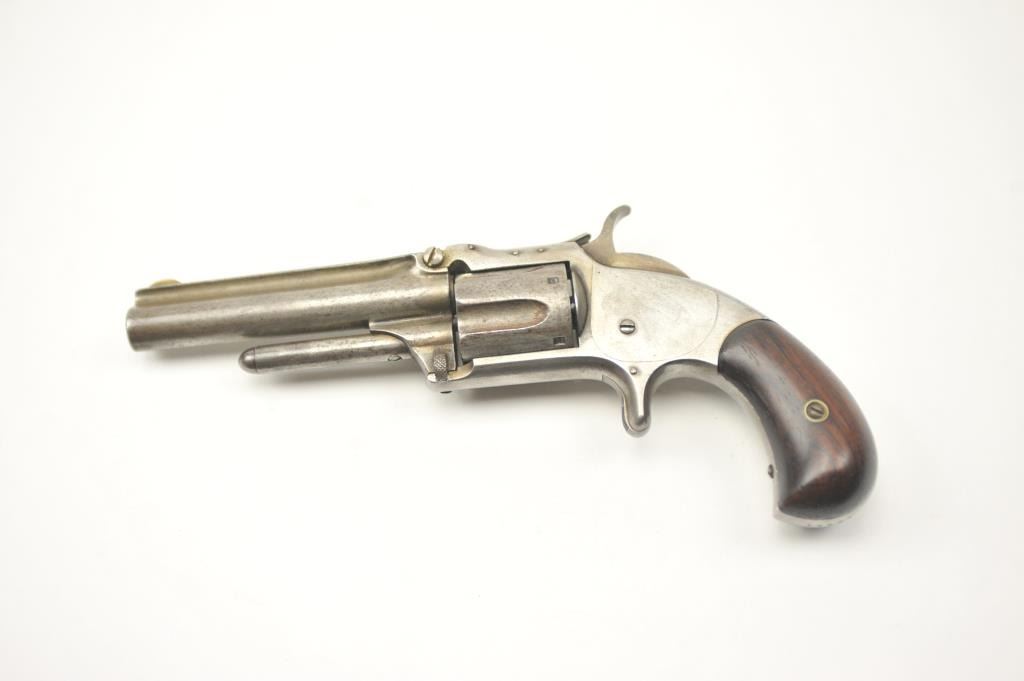 Smith & Wesson Model 1 ½ spur trigger SA revolver, .32 caliber, Serial #95291. The pistol is in good overall condition with a 3 ½” barrel. The pistol has gone to an overall grey patina with light surface rust. Thesmooth wood grips are in very good condition and fit well. The bore is fair and the action functions. Est.: $150-$300. (Antique).