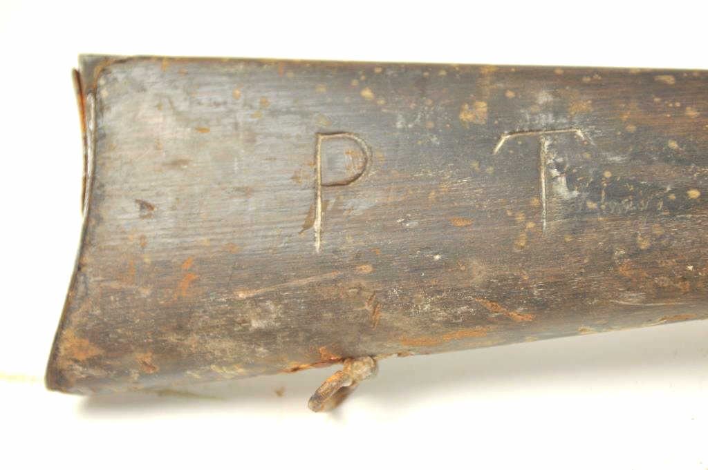 Spencer Saddle Ring Carbine, .52 caliber, Serial #NSNV. The rifle is water damaged and rusted, needing restoration. The rifle is sold as is, where is, with no warranty made or implied. The carbine appears completewith the saddle ring retained and a 22” barrel. The initials, “PT” are carved into the right buttstock. Est.: $200-$400. (Antique).