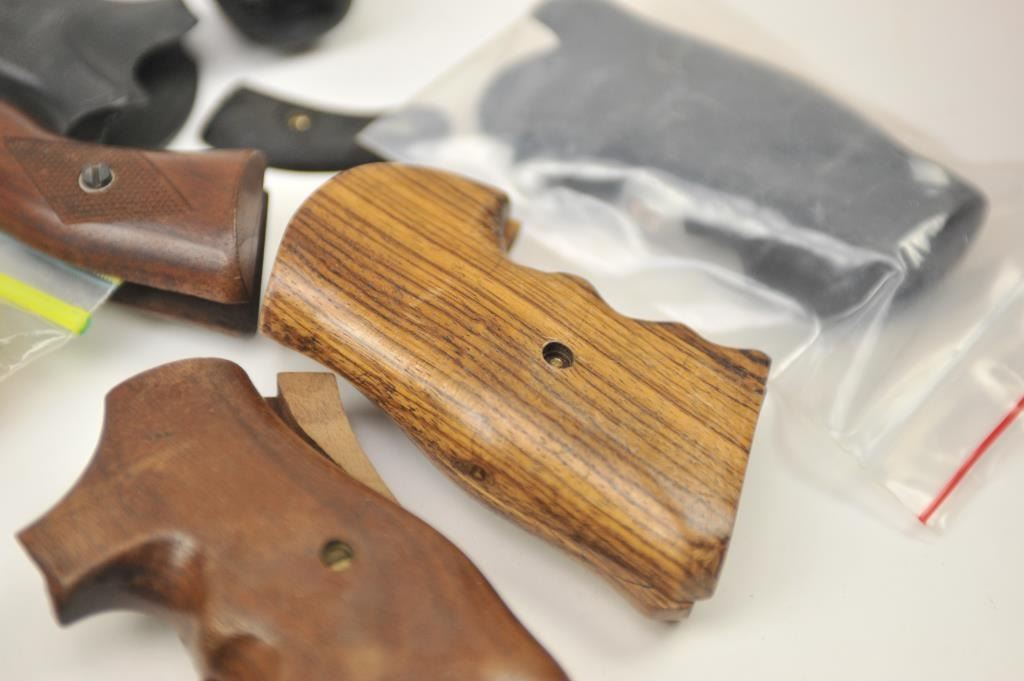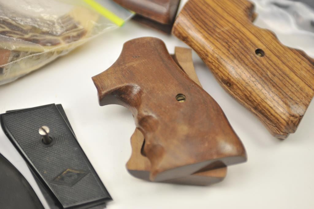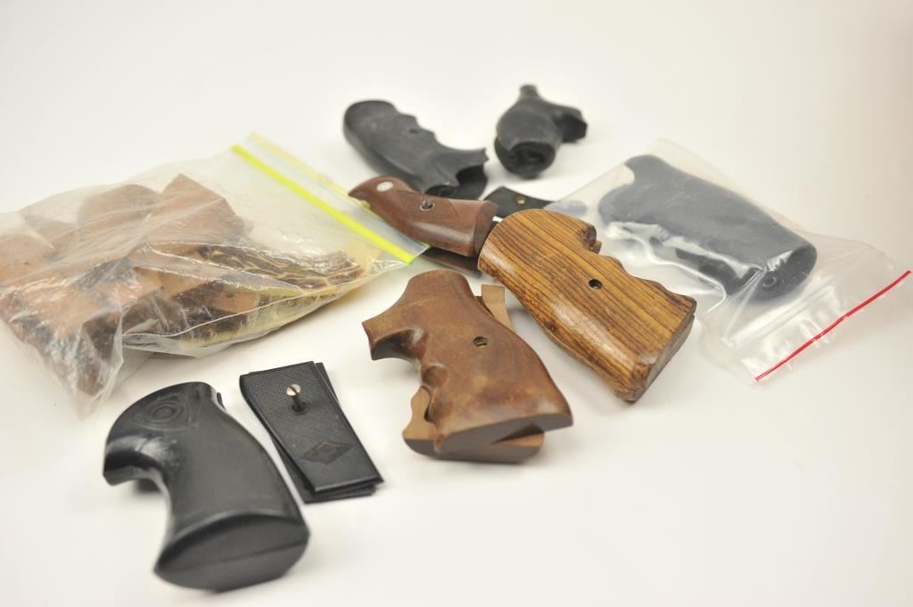 Large grip lot including six pair of partially finished wooden grips for a Single Six revolver, S&W small revolver rubber grip, Ruger checkered wood medallion grips, 2 sets of large revolver wooden combat grips, onetextured rubber Hogue Monogram, a Pachmayr Gripper and a Mershon 10 Point among others. Over fourteen pairs of different pistol grips. Est.: $150-$300.