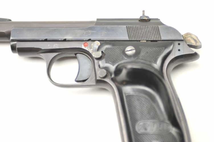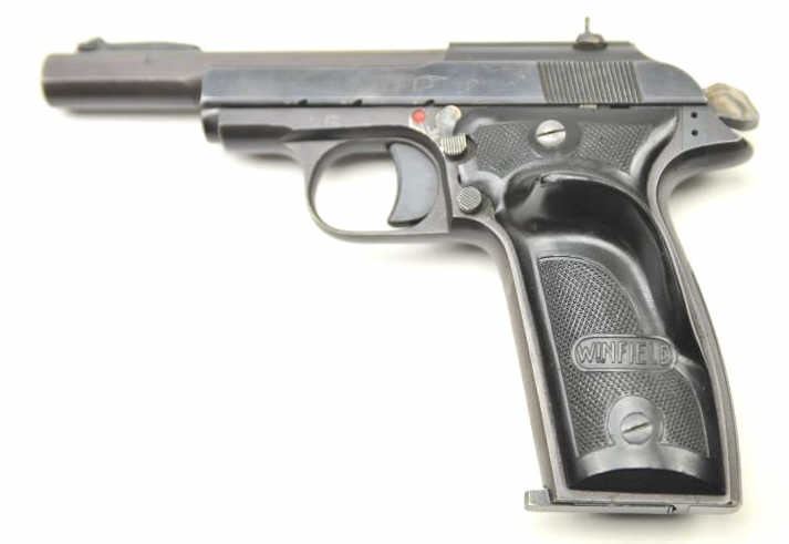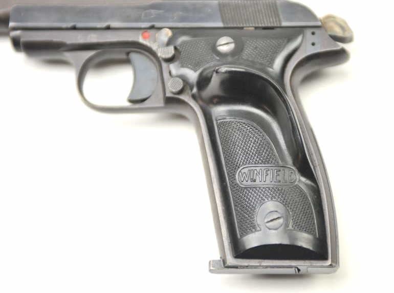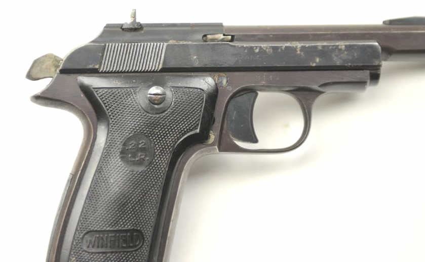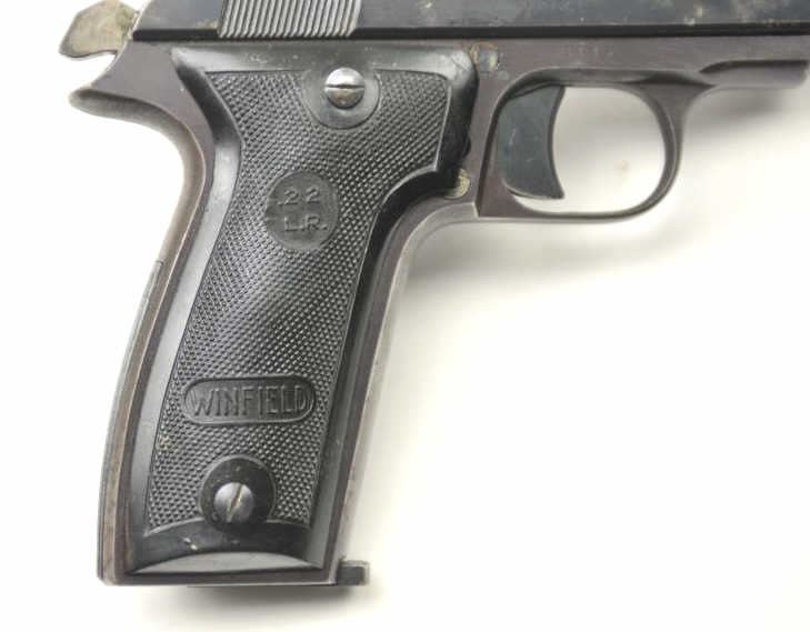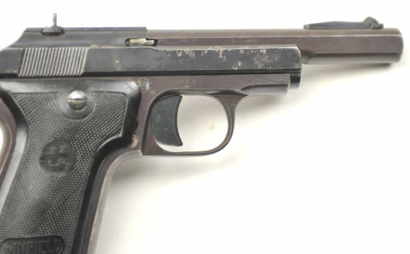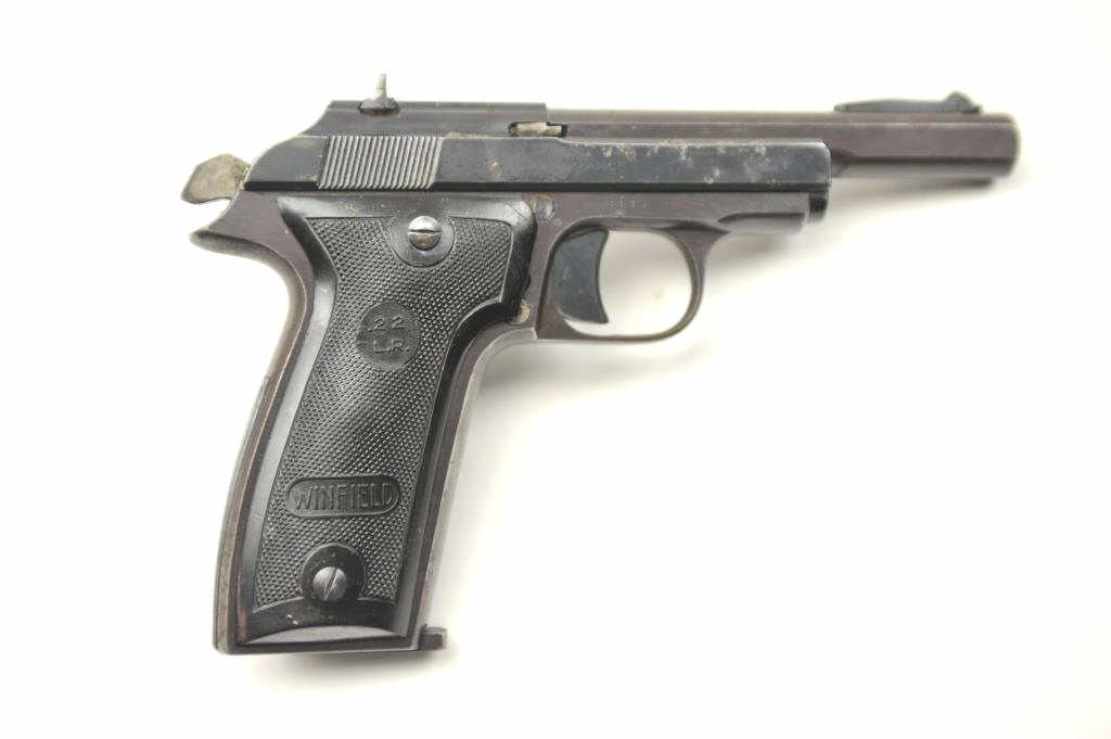 M.A.B. (France) Semi-Auto pistol with exposed hammer and 4 ½” round to octagon barrel, Winfield Arms Co. in composite grips who were gun dealers in the 1950s-60s, S/N 8145. Good condition with 50%-70% toning original blueshowing some minor pitting, scratches, and loss. Good action, good bore, and 1 original mag. Two small tap holes at rear of the frame for part that has been removed (Sight or Slide stop?). (C&R/PPT) Est.: $250-$500