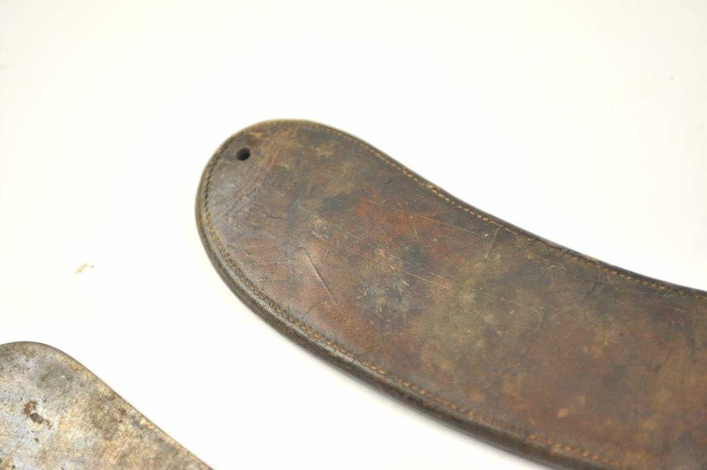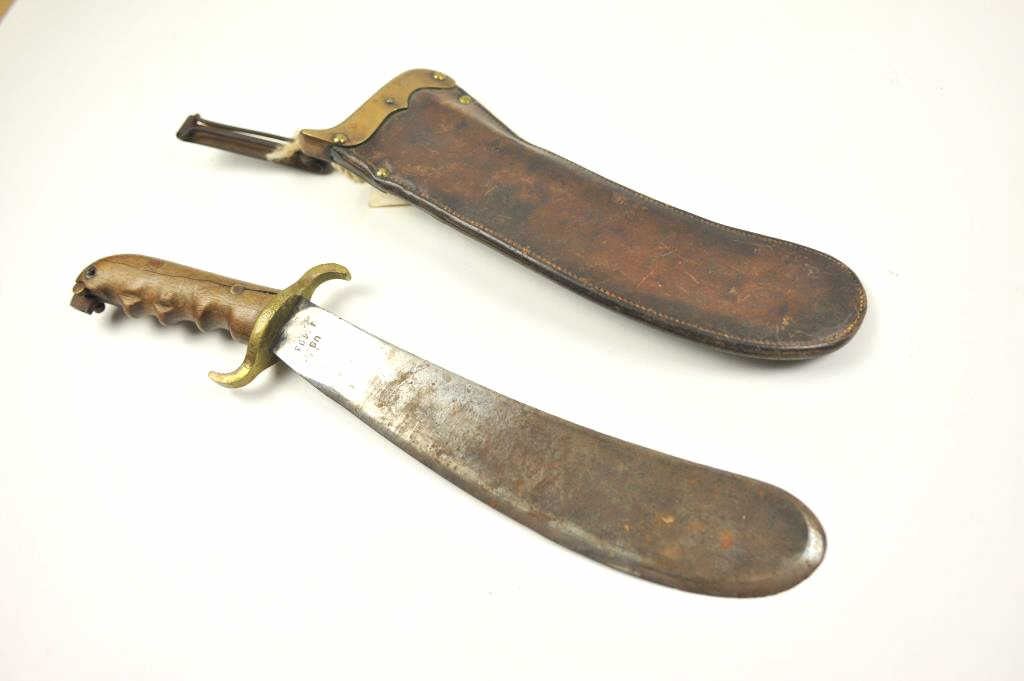 U.S. Hospital Corps Bolo knife with scabbard dated 1910 and S.A. marked. The scabbard is also dated 1910 with R.I. marking. The grip is broken with pieces missing. The scabbard is good, the knife is fair to good overall.Est.: $150-$300.
