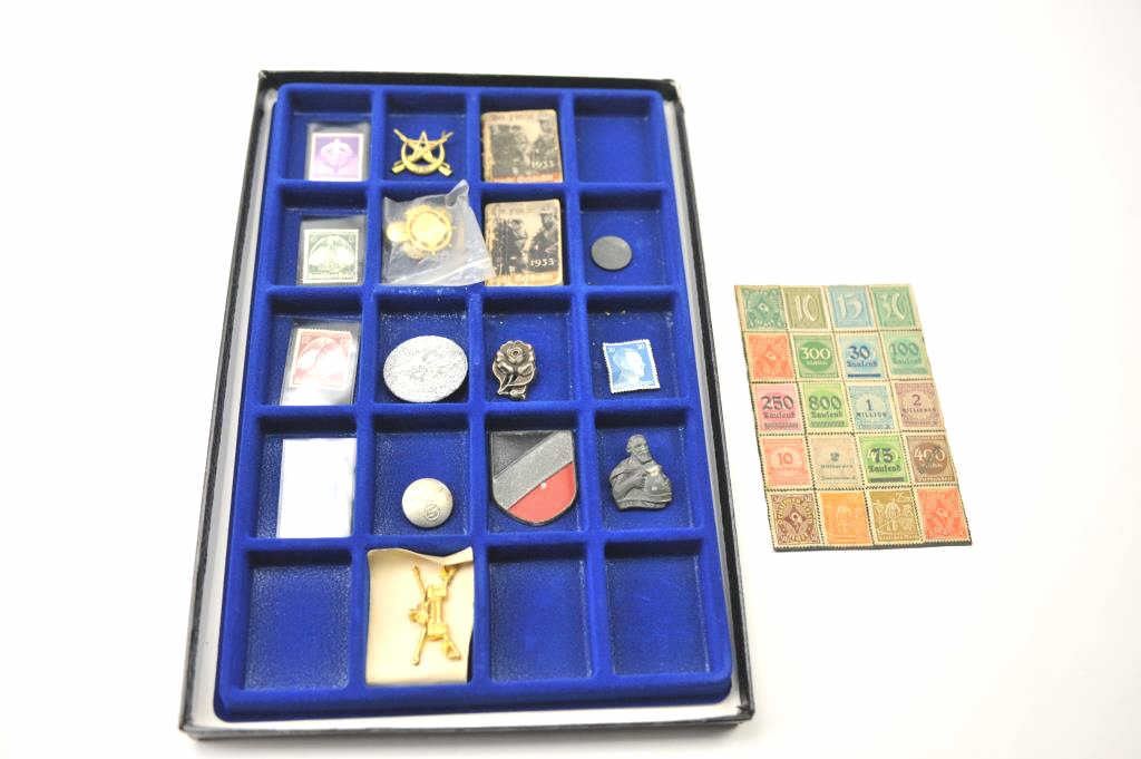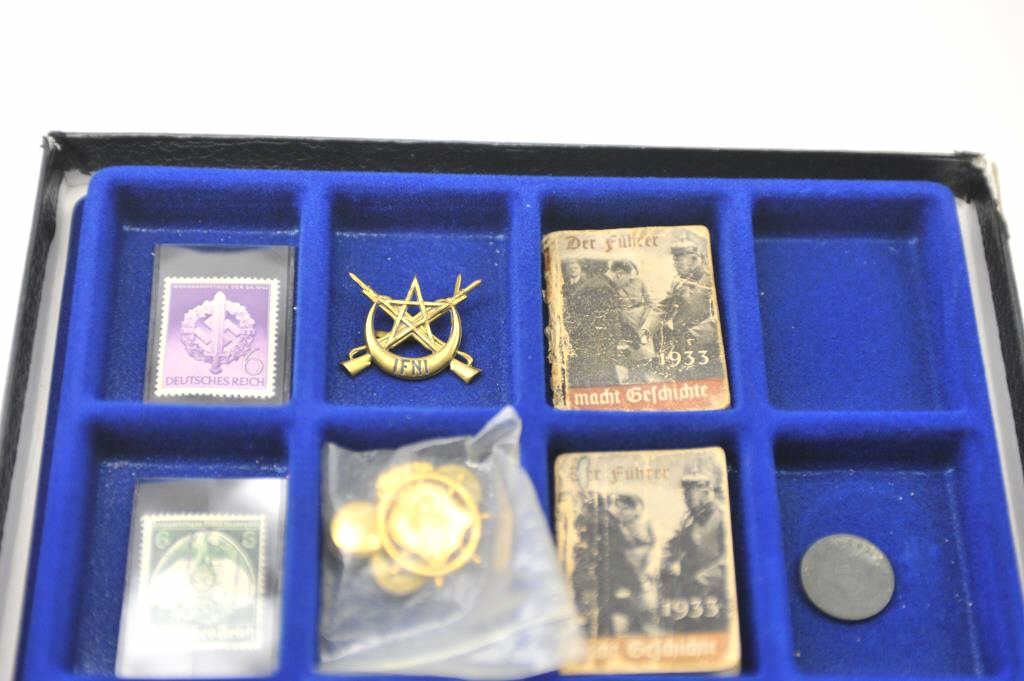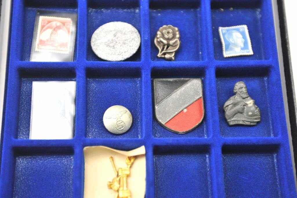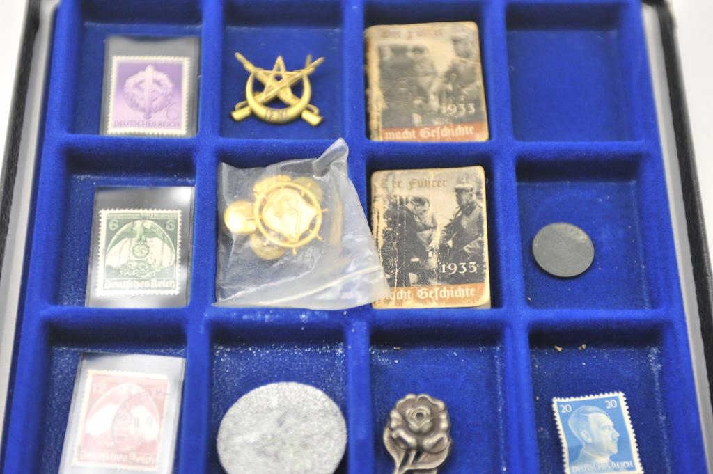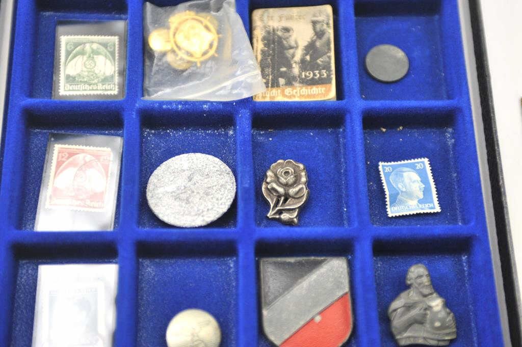 Lot of 18 WWII collectible pieces from an old collector’s estate, valued at $5 to $35 each. A bonanza lot for the gun show or collector show. In a large Riker’s case. Est.: $150-$300.