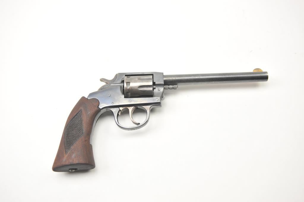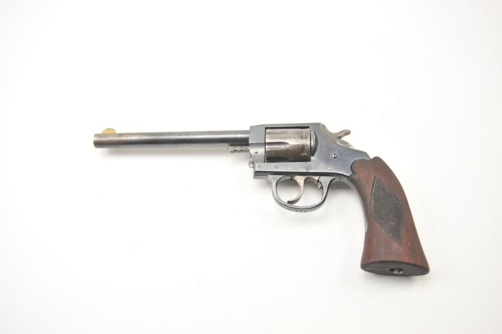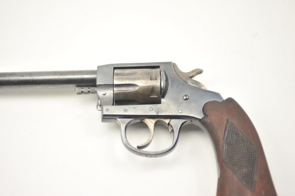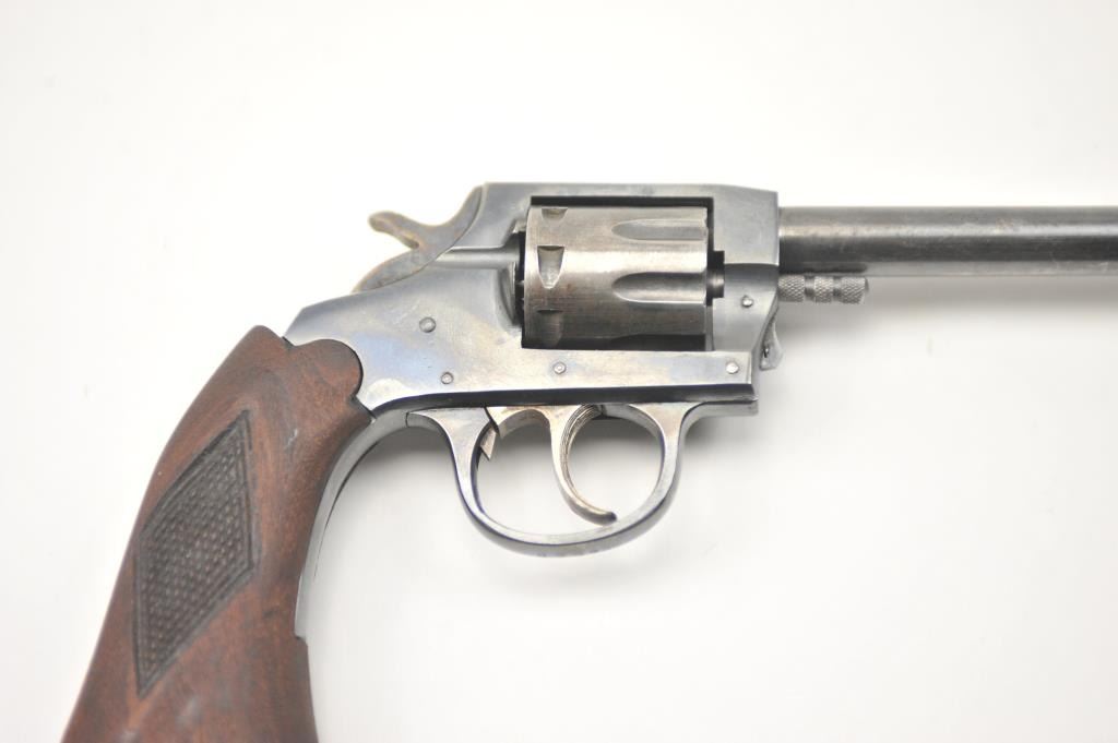 Iver Johnson Target Sealed 8 DA revolver, .22 caliber, Serial #M52588. The pistol is in very good overall condition with a 6” barrel. The pistol retains the majority of the blue finish with wear on the barrel and areas oflight surface erosion. The cylinder has gone to silver patina while the hammer and trigger show muted case hardening. The checkered wood grips are in good condition. The bore is fair, the action functions andthe markings are legible. Est.: $75-$150. (C+R/PPT).