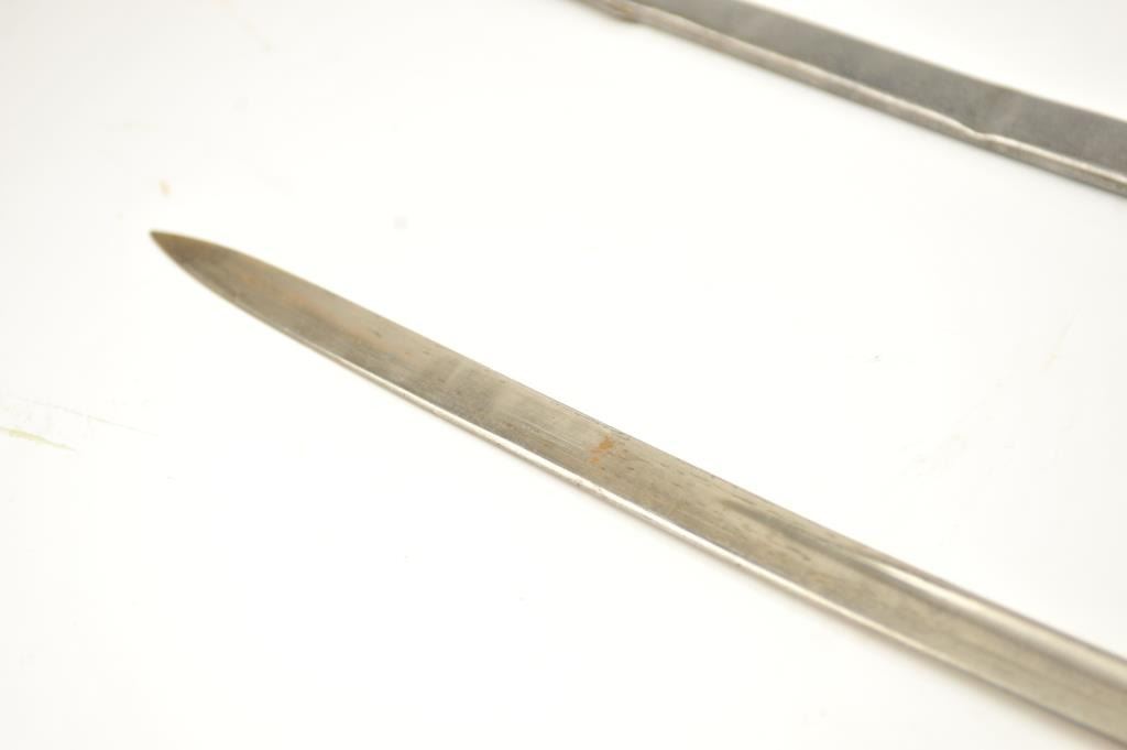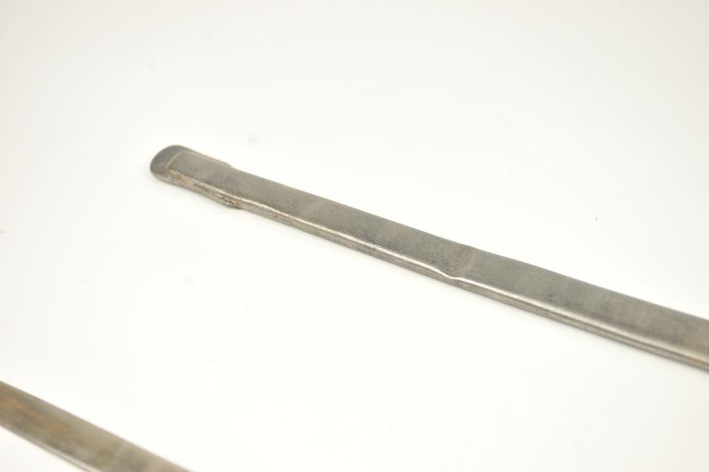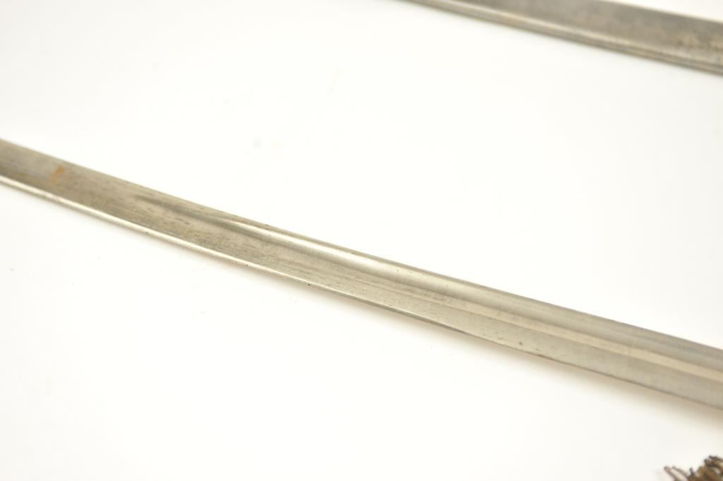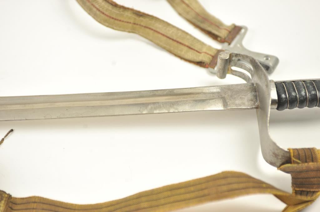 Late 19th to early 20th century D guard cavalry style sword in Austrian style with no maker’s or I.D. marks on the blade or hilt. Fancy original embroidered sword knot with “K”. Also fancy embroidered hanger genuine to this sword. Lightly cleaned gray metal and good overall. Indecipherable mark on the Ferrell. Some pitting on the scabbard. Est.: $100-$200