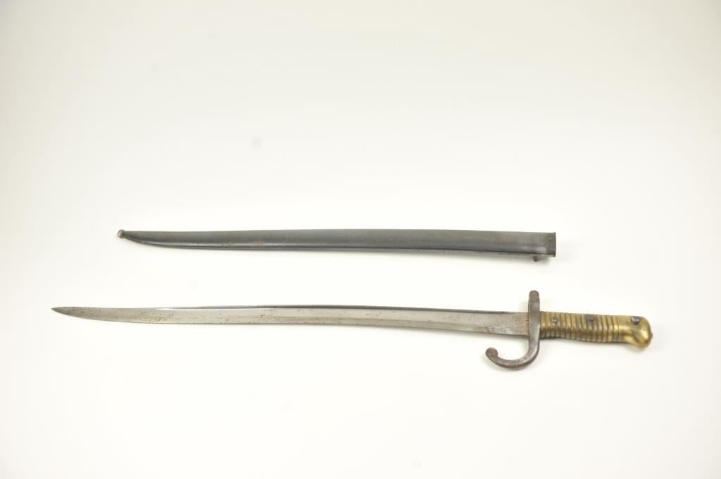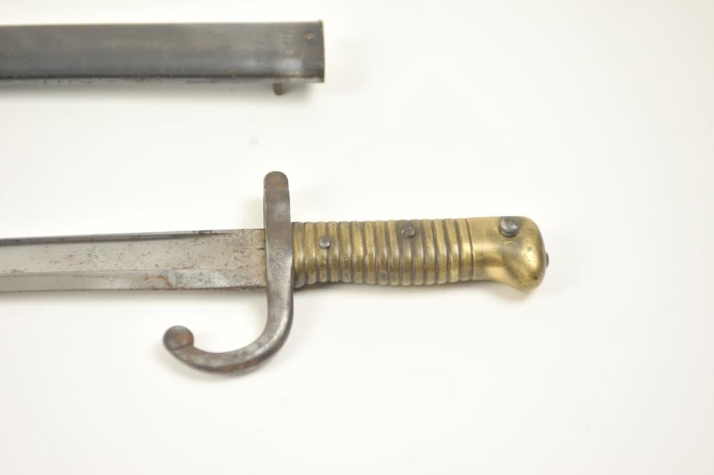 Lot 959 “St. Etienne Arsenal” marked and 1873 dated French sword bayonet and scabbard. Numbered L-3664 on