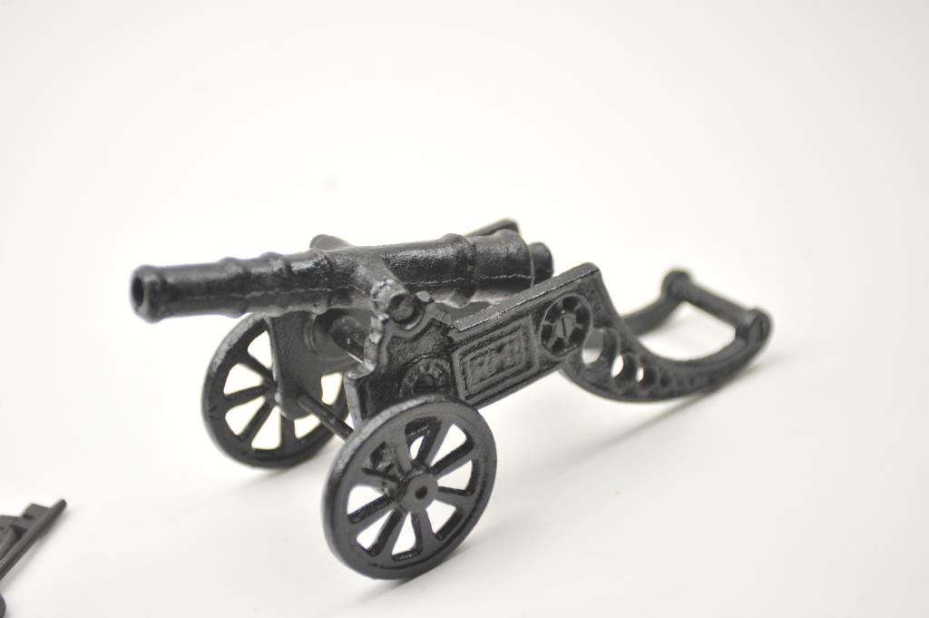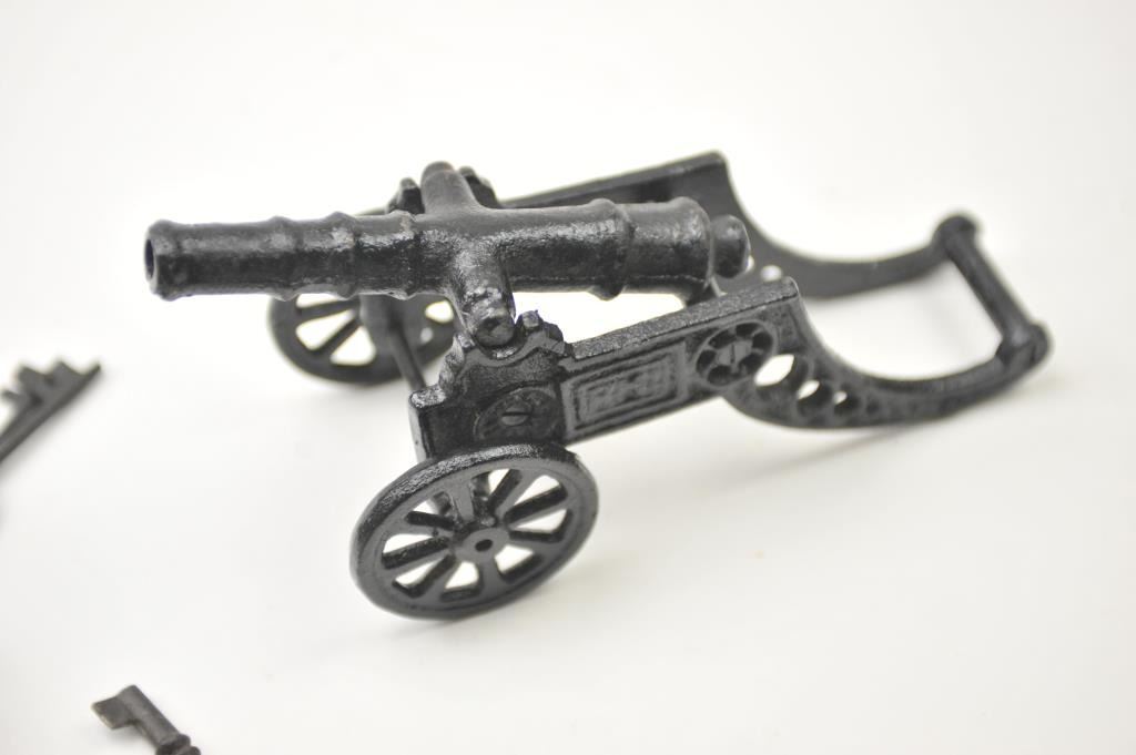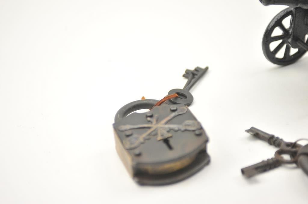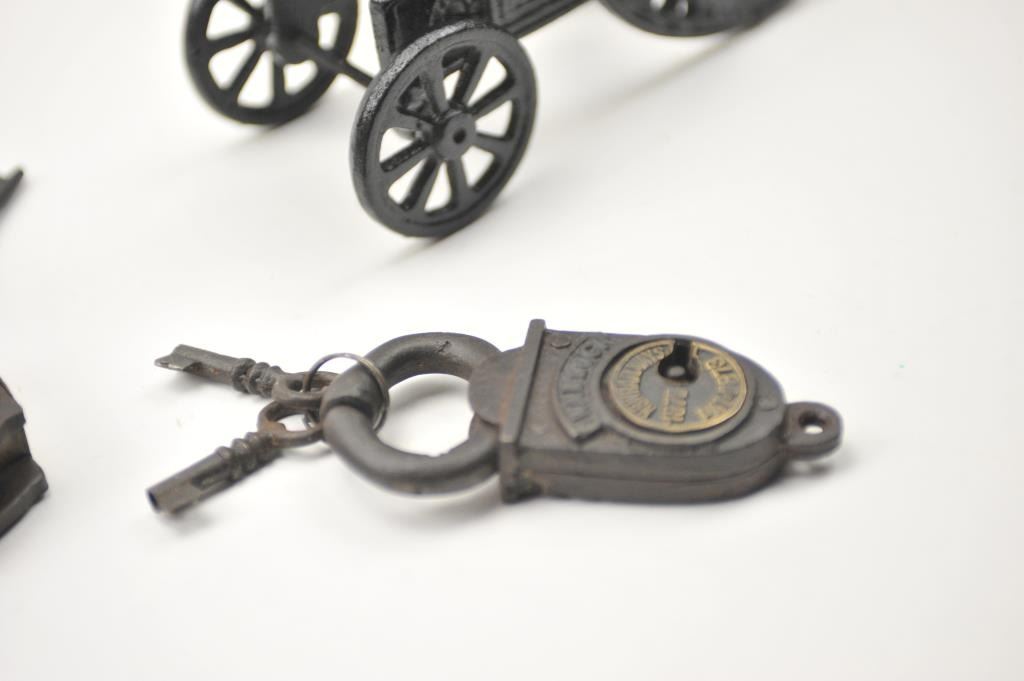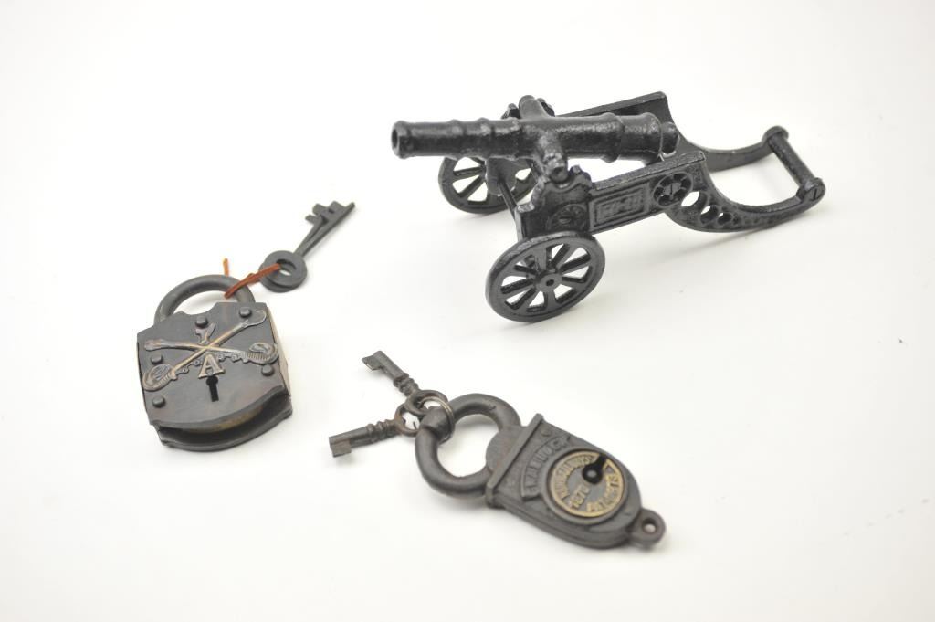 Lot 990 Lot of two vintage padlocks and a cast iron cannon with carriage. One padlock has crossed cavalry