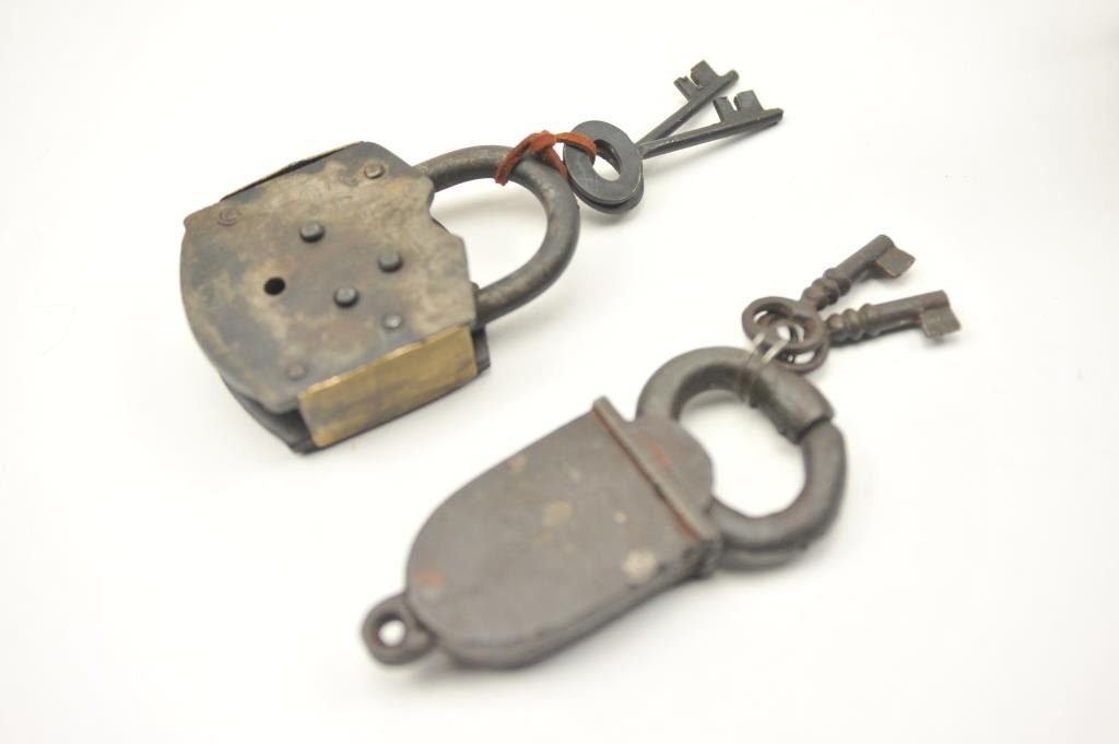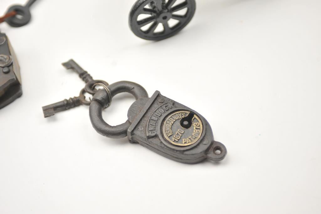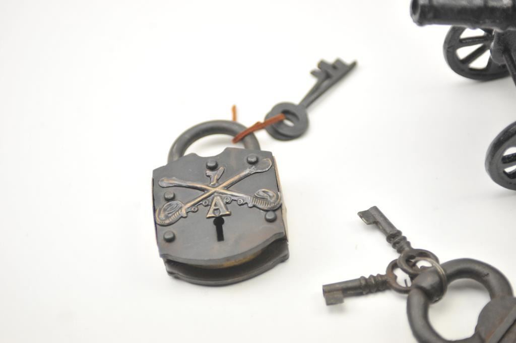 Lot of two vintage padlocks and a cast iron cannon with carriage. One padlock has crossed cavalry swords with a “7” over an “A”. The second is marked, “GRABLOCK NSWRAILWAYS 1870 PAT-0873”. Est:$35-70