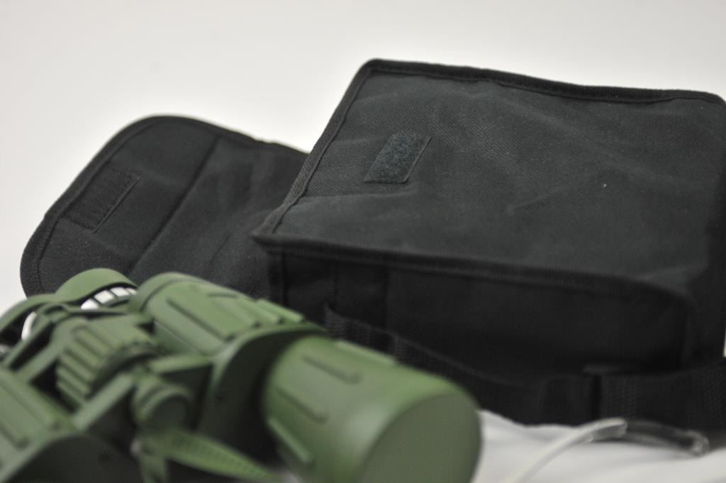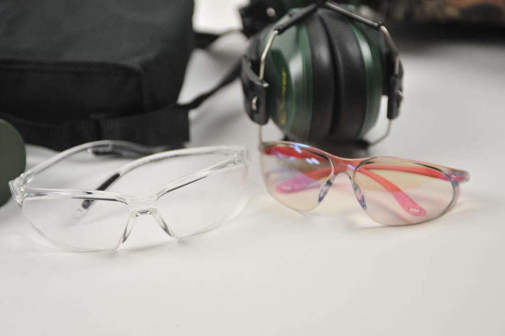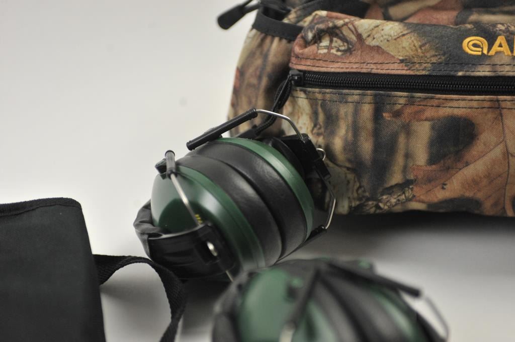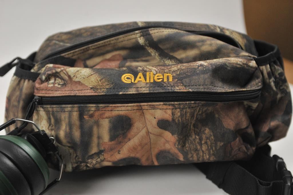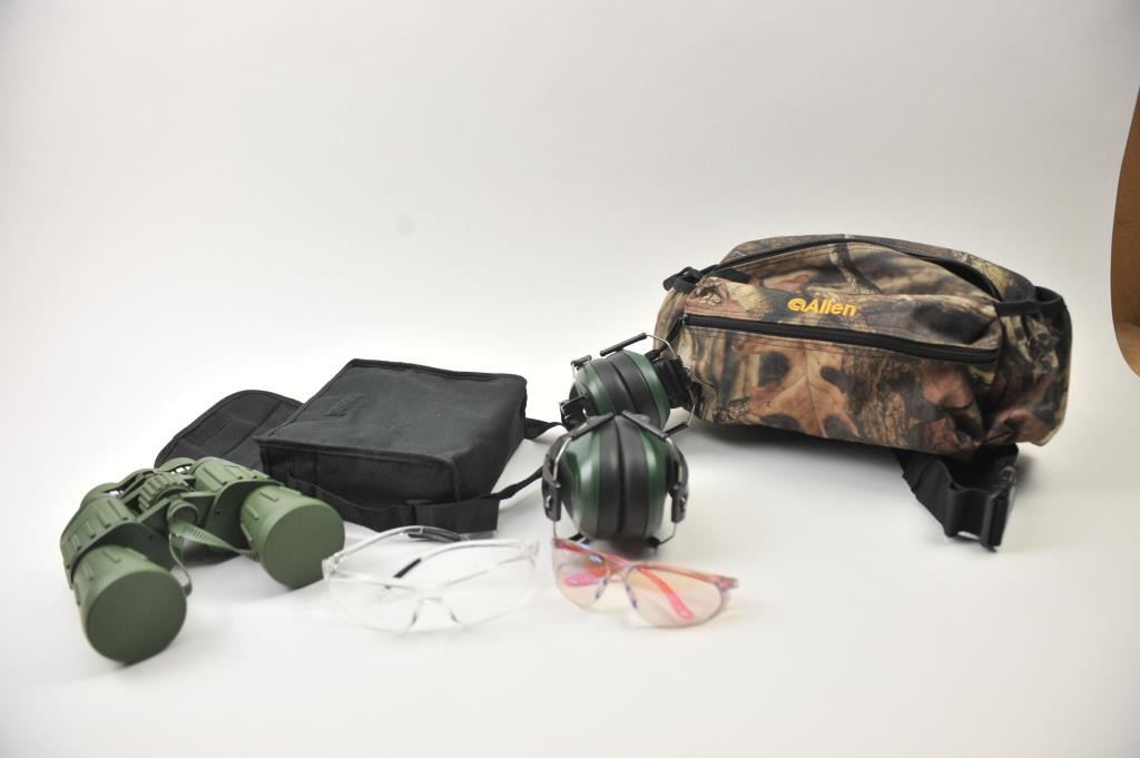 Lot of optics and shooting supplies. The lot includes a set of Perrini Night Prism 60 x 50mm armored binoculars in very good condition with nylon case. The lot additionally contains an Allen camo huntingpouch with 2 sets of Caldwell hearing protection devices and 2 pair of Uncle Mike’s shooting glasses. Est.: $35-$70.
