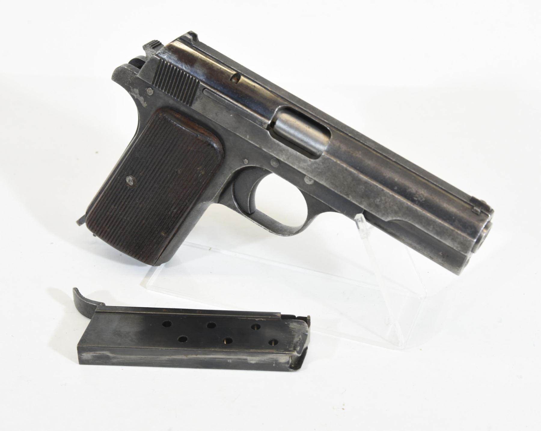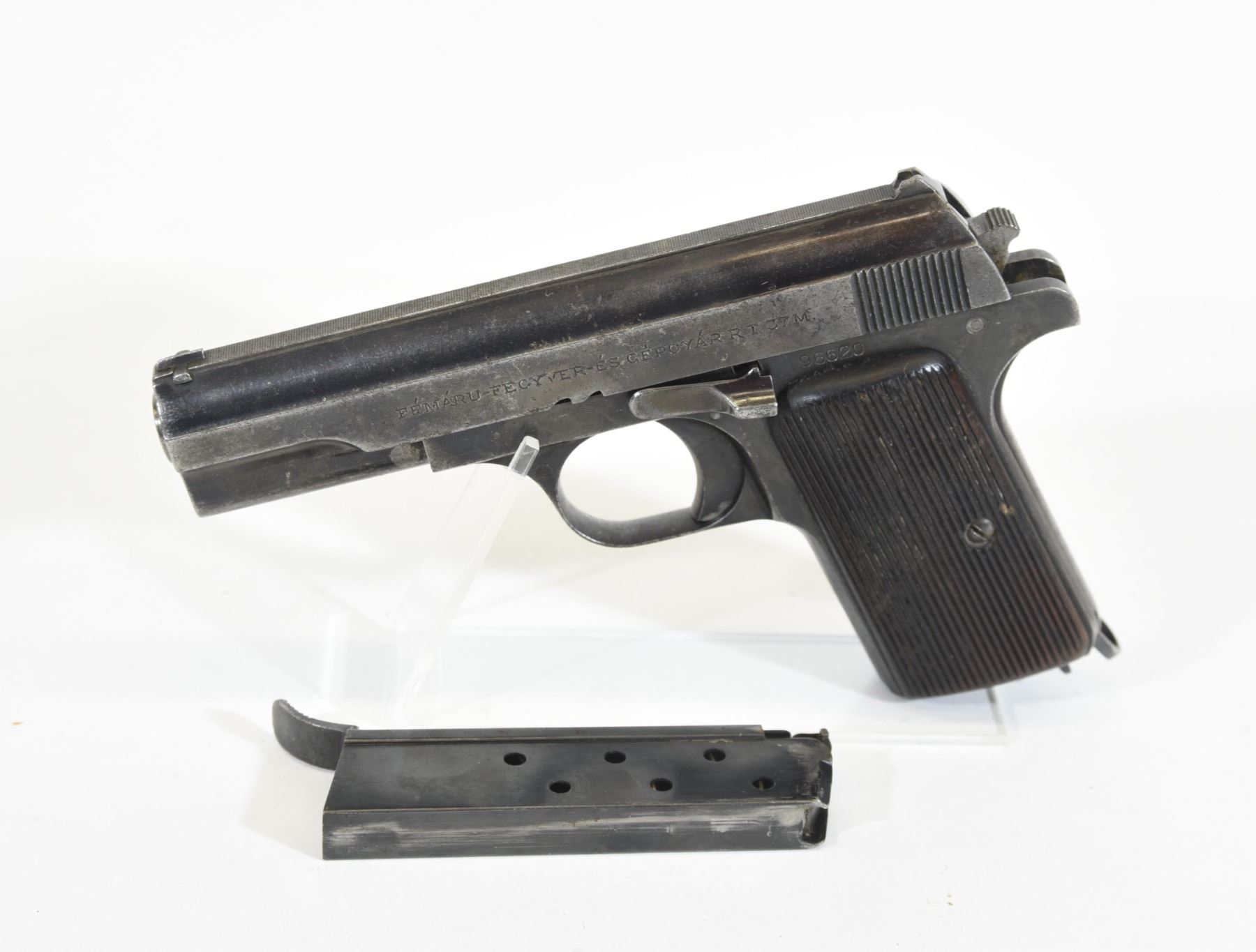 Restricted, 380 auto, 110 mm barrel, SN 96620. Bluing is turning grey with some light corrosion. Grips are fair. Bore is good. Has one magazine.