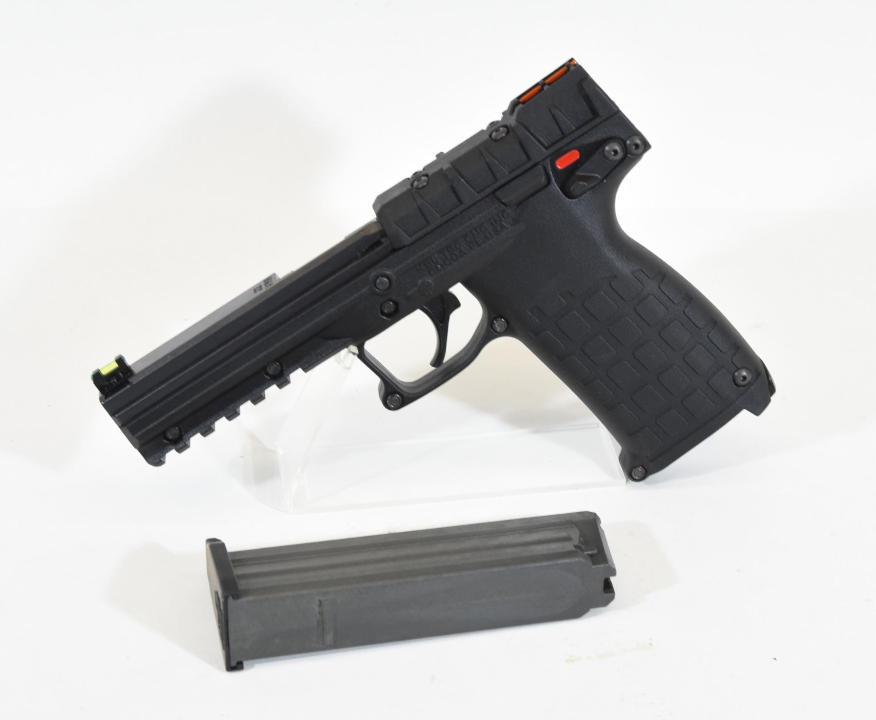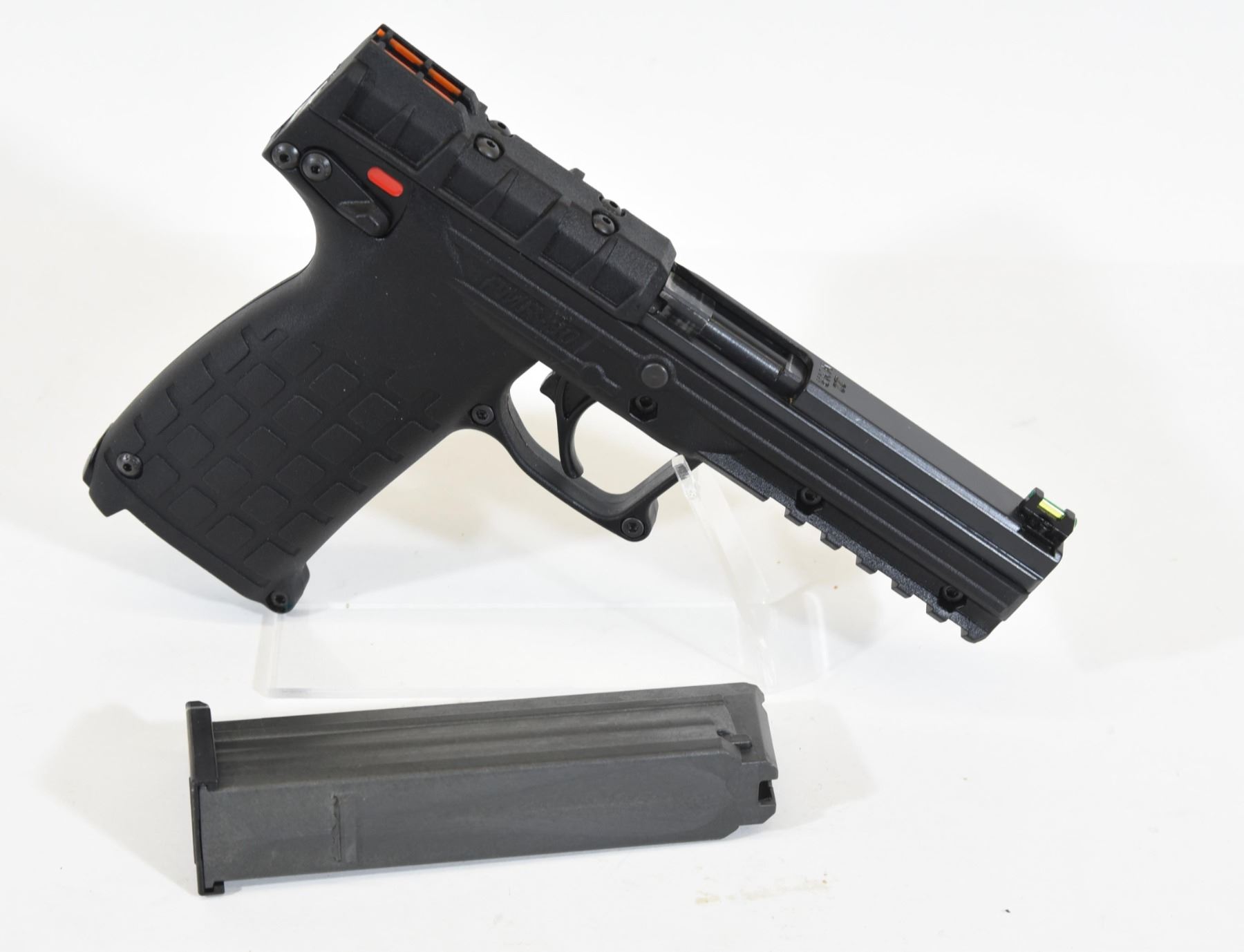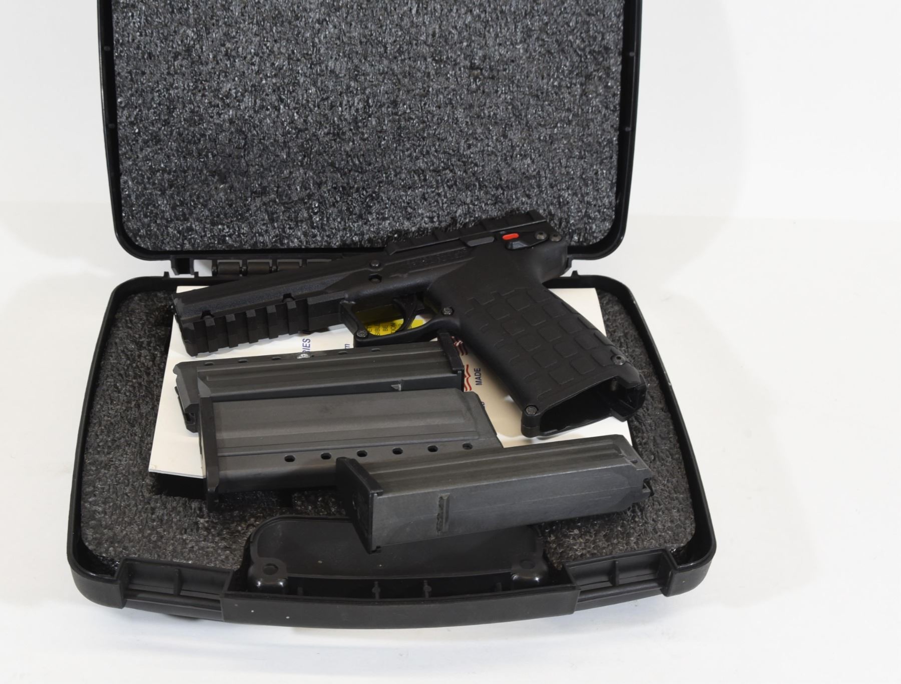 Restricted, semi-automatic, 22 WMR, 110 mm barrel, SN W6Q25. Bluing is excellent. Plastic body and grips are very good. Bore is excellent. Comes with 4 magazines all pinned to 10 rounds, manual and plastic hard case.