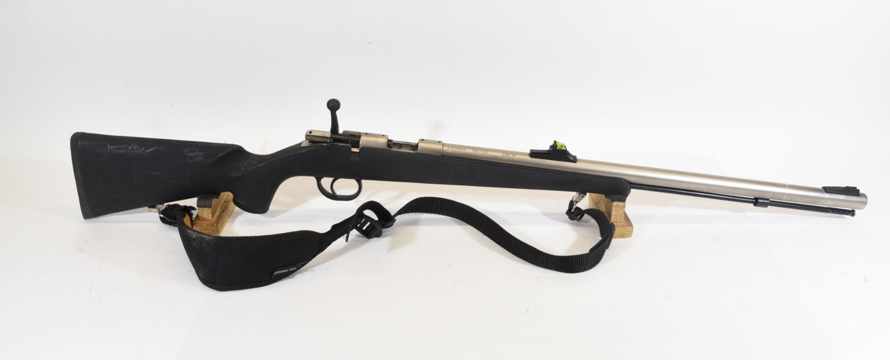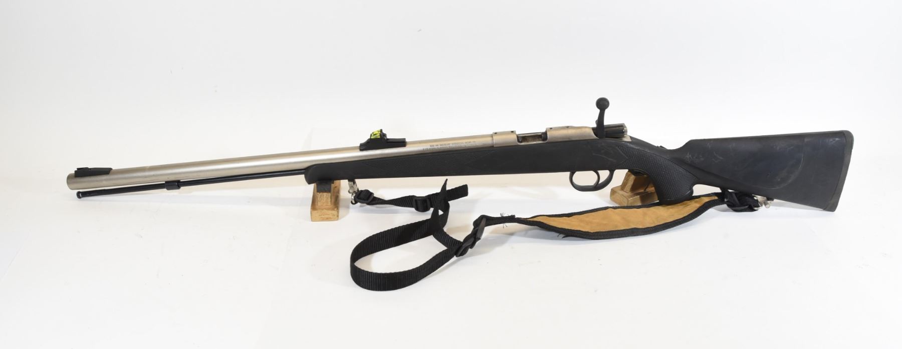 Non-restricted, single shot muzzle loader, 50 caliber, 24" barrel, SN 14-13-076056-02. Synthetic stock has light scratches. Stainless finish on barrel has a few marks. Bore is very good. Includes a sling. Front sight is broken.