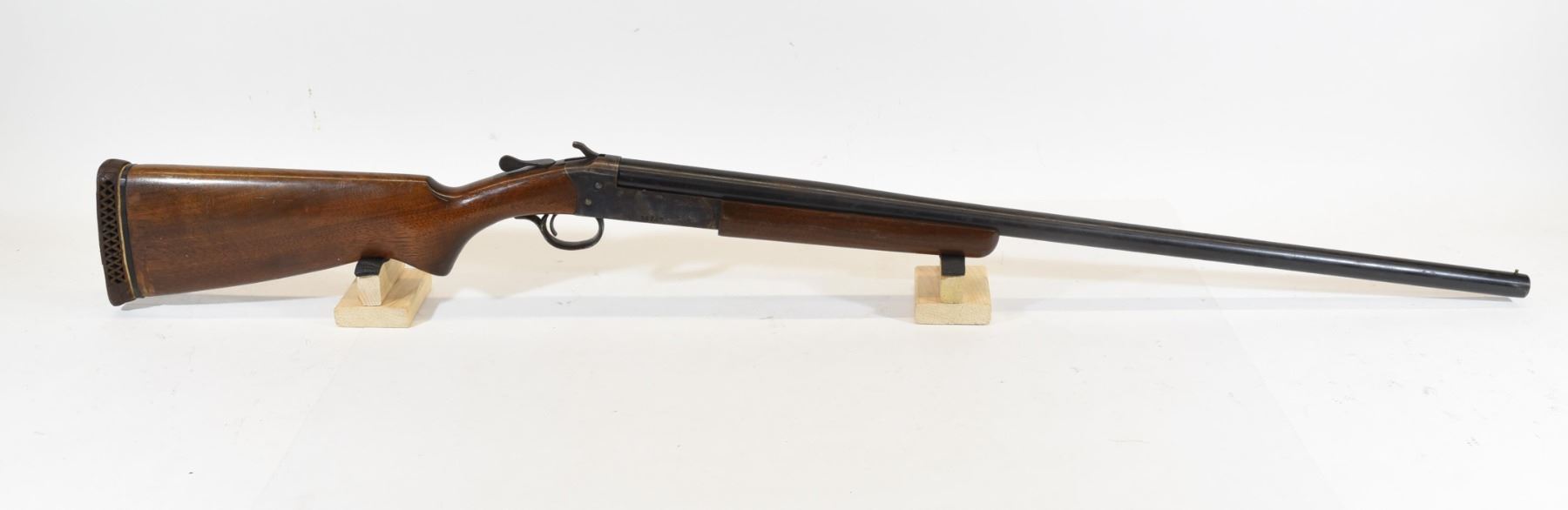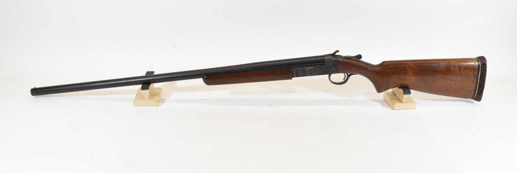 Non-restricted, break action, 12 gauge 2 3/4", 12" smooth bore barrel with full choke, SN 36745. Wood stock has scratches and dents. Bluing on barrel is dark, but rust pitted. Bore is good.