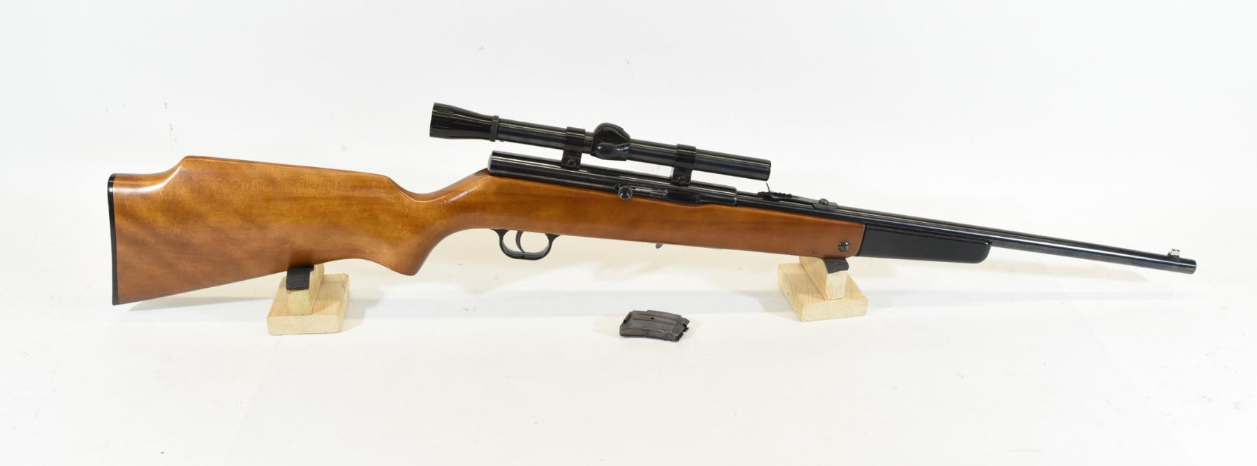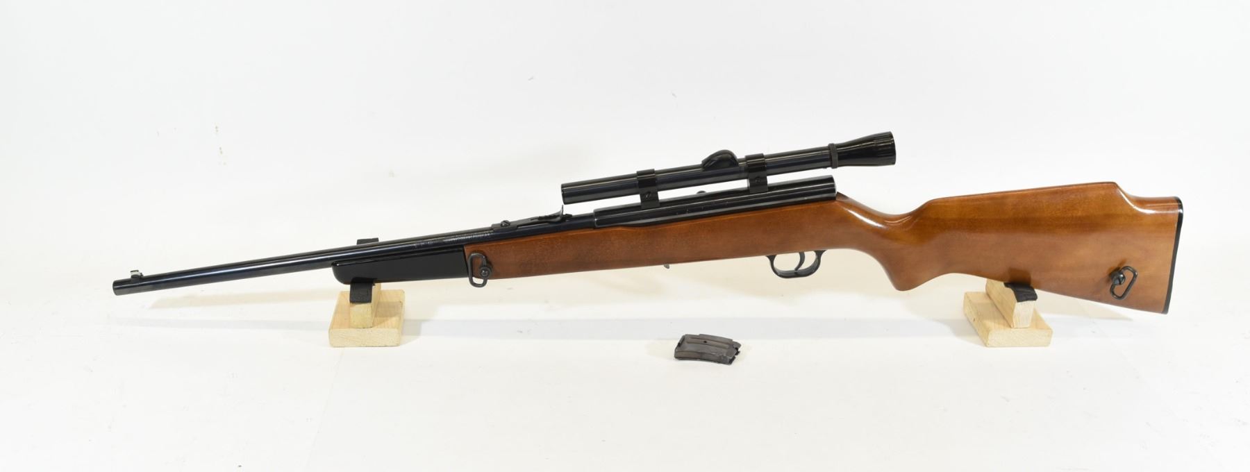 Non-restricted, 22LR, semi-auto, SN none. Wood is good. Bore is very good. Bluing is good. Some marks on the receiver. Comes with 1 magazine and a Weaver Marksman 4x optic.