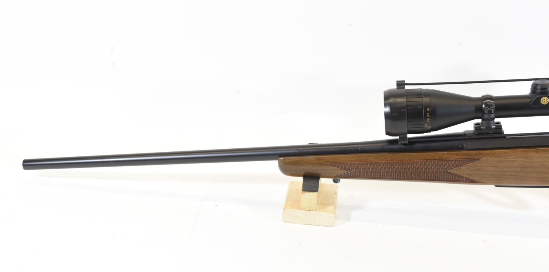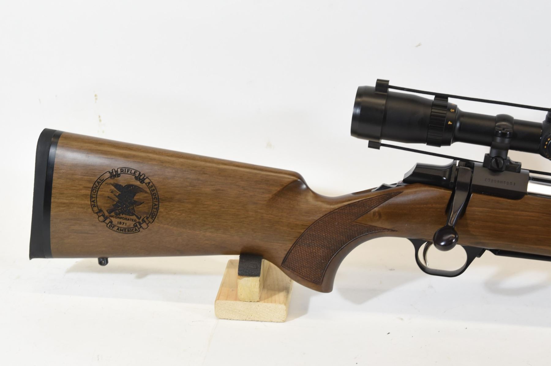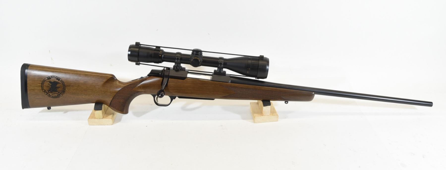 Non-restricted National Rifle Association of America commemorative bolt action rifle, 243 Win, with hinged floor and internal detachable magazine. SN 87209MT351. Included is a Bushnell Elite 3200 4 - 12X 50 MM scope with adjustable focus. The stock has a couple of light handling marks, otherwise in excellent condition. Bluing is excellent. Bore is excellent.