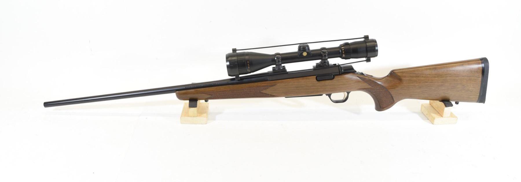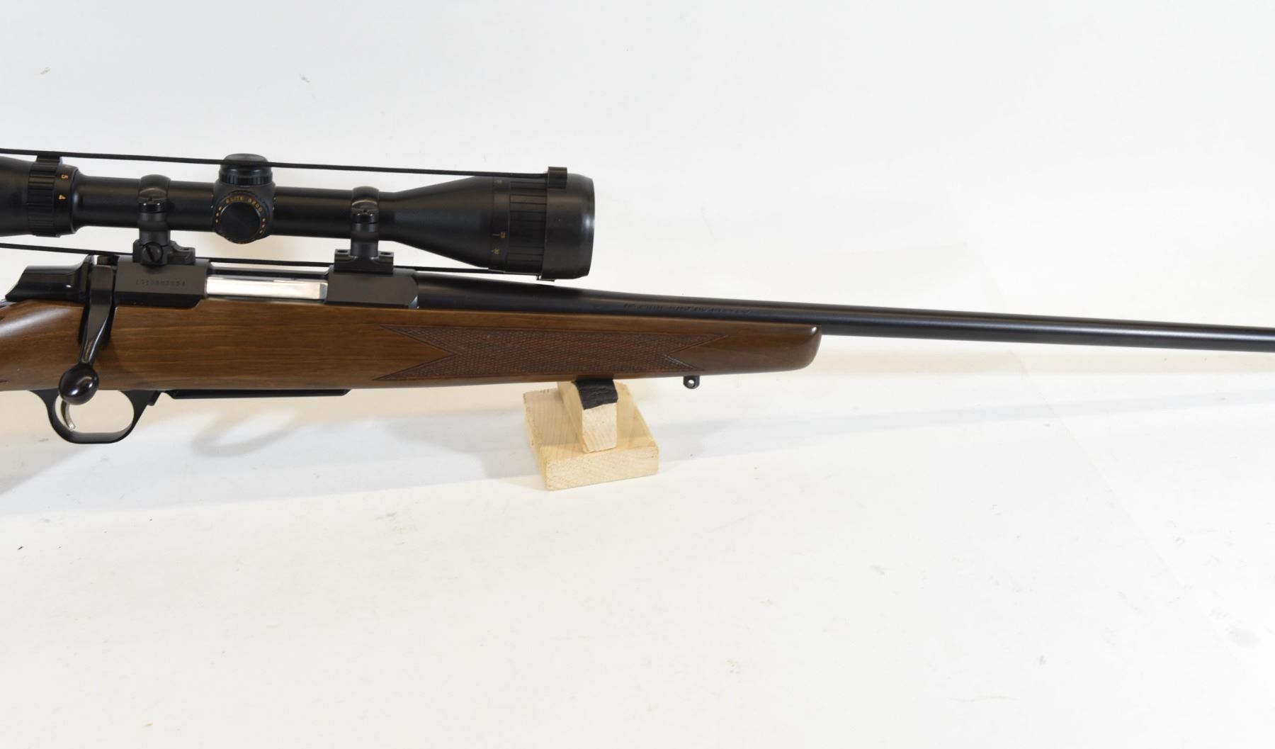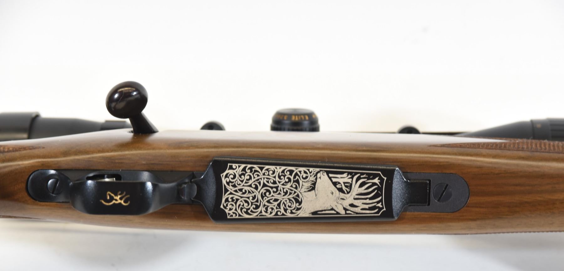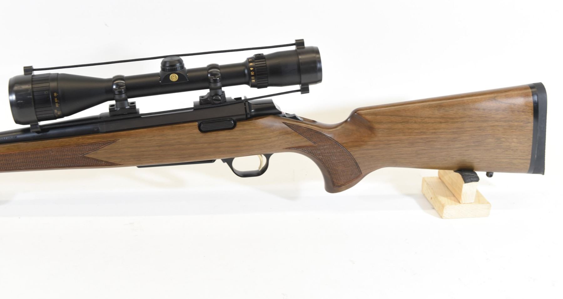 Non-restricted National Rifle Association of America commemorative bolt action rifle, 243 Win, with hinged floor and internal detachable magazine. SN 87209MT351. Included is a Bushnell Elite 3200 4 - 12X 50 MM scope with adjustable focus. The stock has a couple of light handling marks, otherwise in excellent condition. Bluing is excellent. Bore is excellent.