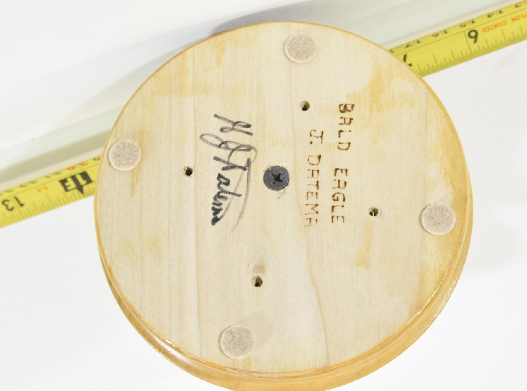 Hand carved bald eagle by J. Datema and signed. 11" in height.