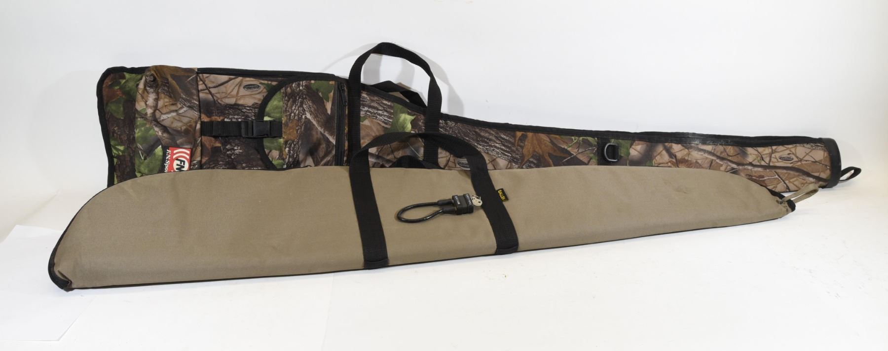 1) F.N. Sports camo soft case 56" long. 2) Tan Allen soft case 48" long. 3) Cable lock with keys.