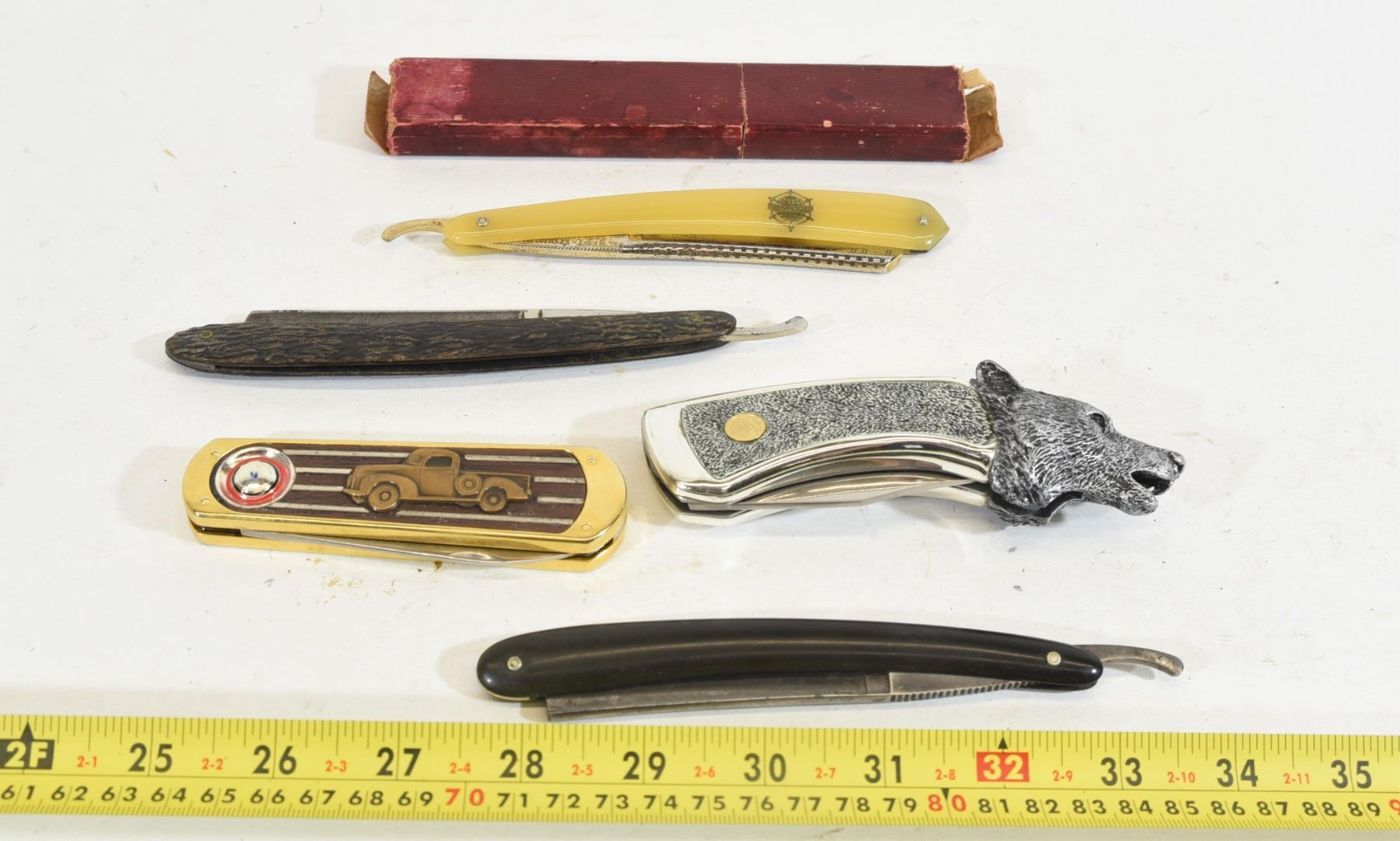 1) Franklin Mint wolf knife. 2) Franklin Mint Ford 1940 half-ton knife. 3) Challenge Cutlery straight razor. 4) H. Boker King Cutter straight razor. 5) Tuckmar Weltruf 350 straight razor with box.