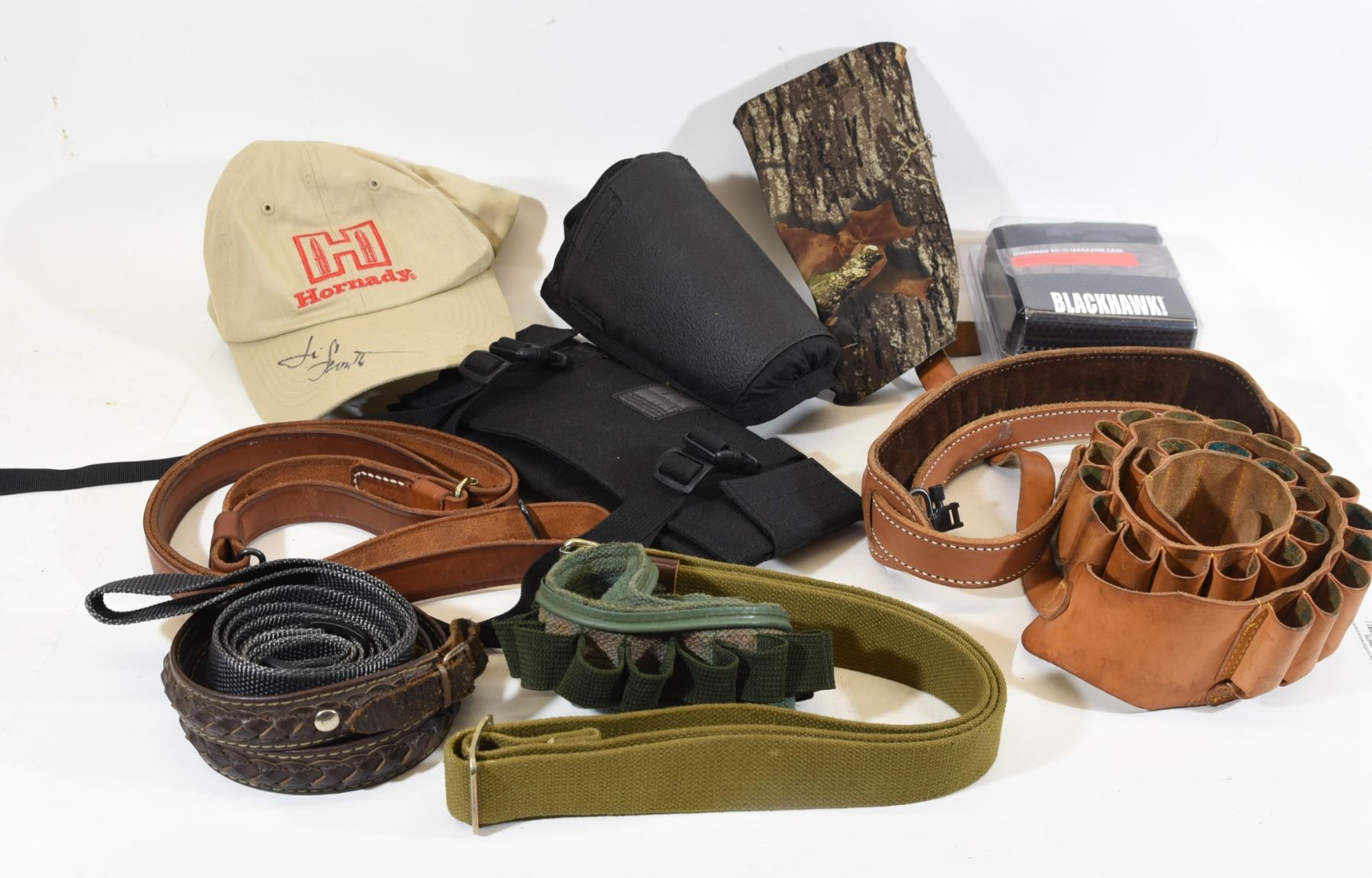 1) Levy's leather rifle strap. 2) Leather shotgun shell belt. 3) Green canvas rifle strap. 4) Green canvas shotgun shell belt. 5) Hunter leather 230 x 1" rifle strap. 6) Leather braided rifle strap. 7) Black nylon strap. 8) Black leather butt stock check pad. 9) Beartooth butt stock ammo holder. 10) Blackhawk Quickmod AR-15 magazine case. 11) Blackhawk reversable butt pad. 12) Hornady tan hat, had unknown autograph.