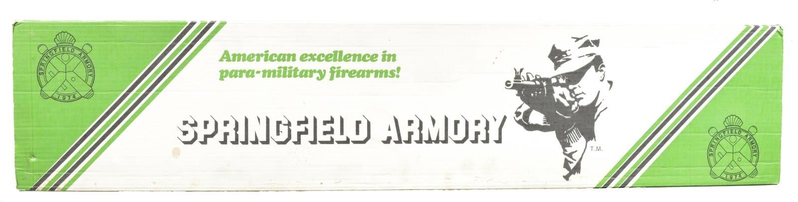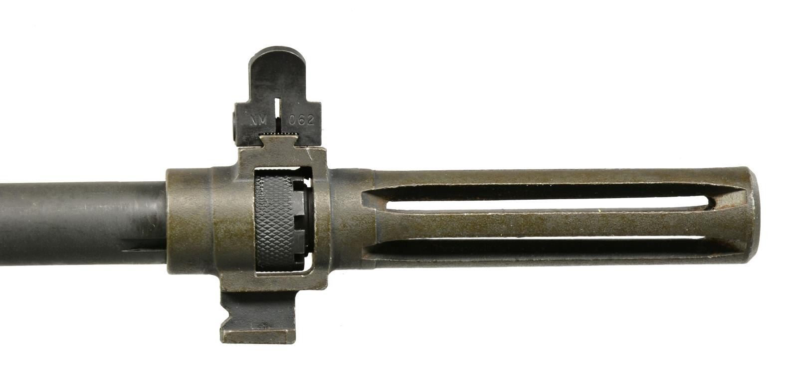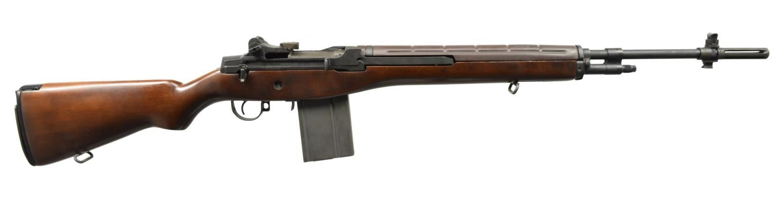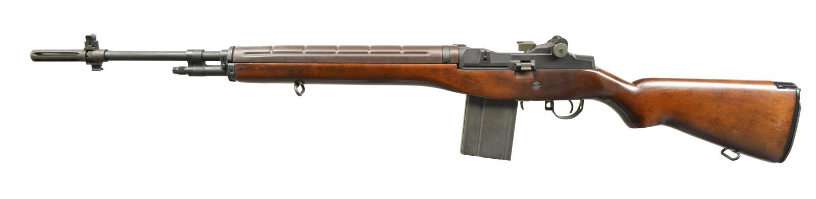 RIFLE. Cal. 308. S# 25119. Bbl. 22". The M14 was developed through a series of testing with an overly ambitious set of requirements. Its earliest roots can be traced to a post WWII study by the “Army Ground Forces Equipment Review Board” w/ the lofty goal of replacing the M1 Garand, the M1918A2 BAR & any currently used sniper rifles. Making things even more difficult, the requirement was even altered to include use that typically called for Carbine & SMG. After extensive testing & numerous design alterations/adaptations, the US Rifle, 7.62 mm, M14 was adopted on May 1st 1957. Shortly after the US Army Infantry Board issued requirements for this new Wonder Rifle to address three specific areas, including accuracy enhancement & reduction of recoil & muzzle climb. After several improvements & exhaustive amount of testing, in the end it was determined that this system was simply too light to be utilized as a suitable replacement for the BAR. This particular rifle stated life as a Springfield Armory semi-auto M1A then was later converted to its current M14 configuration by Rock Island Armory. All exposed metal surfaces are finished in a deep rich parkerizing. Bbl. is terminated w/ traditional flash hider/muzzle break, including bayonet lug & protected blade front sight. Rear sight is windage & elevation adj. protected peep. Attractive hardwood stock w/ flip up buttplate which reveals the trap door beneath it. Receiver markings on rear, behind sight include: “RIA / U.S. Rifle / 7.62 – mm M1A / Springfield / Armory”. Selector is located on rear right of receiver. Safety in front of trigger guard. Sling swivels on bottom of stock, front & rear. Attractive dark brown plastic handguard. MAGS: 1-20 rd. UNATTACHED ACCESSORIES: 1 factory Springfield box. CONDITION: exposed parkerized metal finish is complete throughout w/ few extremely light thin spots at areas of mechanical intervention. Stock is dark brown w/ few light impressions & handling/storage marks. Lightly struck proof mark on stock inside grip & circular DoD proof mark on left side of stock at cheek. Fire control mechanism appears to function correctly when cycled by hand. Though bore displays little fouling, rifling is strong. NATIONAL FIREARMS ACT MG REQUIRING BATF TRANSFER BEFORE TAKING POSSESSION. FULLY TRANSFERABLE. (03-1479/JZ). MODERN CLASS III. $7,000-11,000.