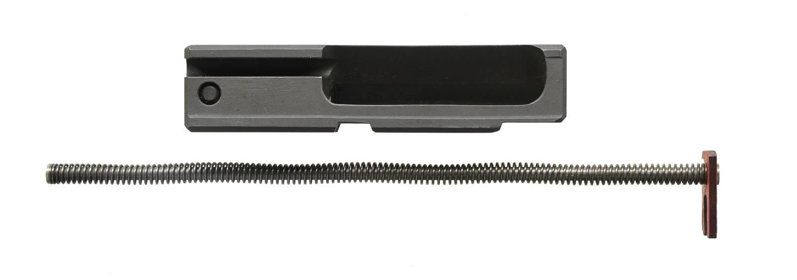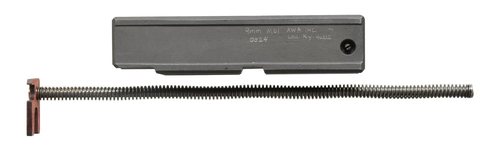 Cal. 9mm. S# 0024. Uzi conversion bolt registered by AWA Inc. & fully transferable to transform your semi auto model A or B Uzi into the SMG it was intended to be. Full auto bolt is slotted to interface w/ the factory semi auto blocking bar. The operating system is converted to open bolt when utilizing this accessory & functions as a select fire model similar to the original. Full length recoil spring is included. No tools or permanent modifications to the host gun are required. A modified semi or full auto trigger group will be necessary to complete conversion. Bolt markings on left hand side are “9mm M01 AWA Inc. / 0024 Lou. KY. 40222”. UNATTACHED ACCESSORIES: recoil rod. CONDITION: bolt appears to have been utilized very little, if any at all, beyond test firing. NATIONAL FIREARMS ACT MG REQUIRING BATF TRANSFER BEFORE TAKING POSSESSION. FULLY TRANSFERABLE. (03-1477/JZ). MODERN CLASS III. $8,000-12,000.