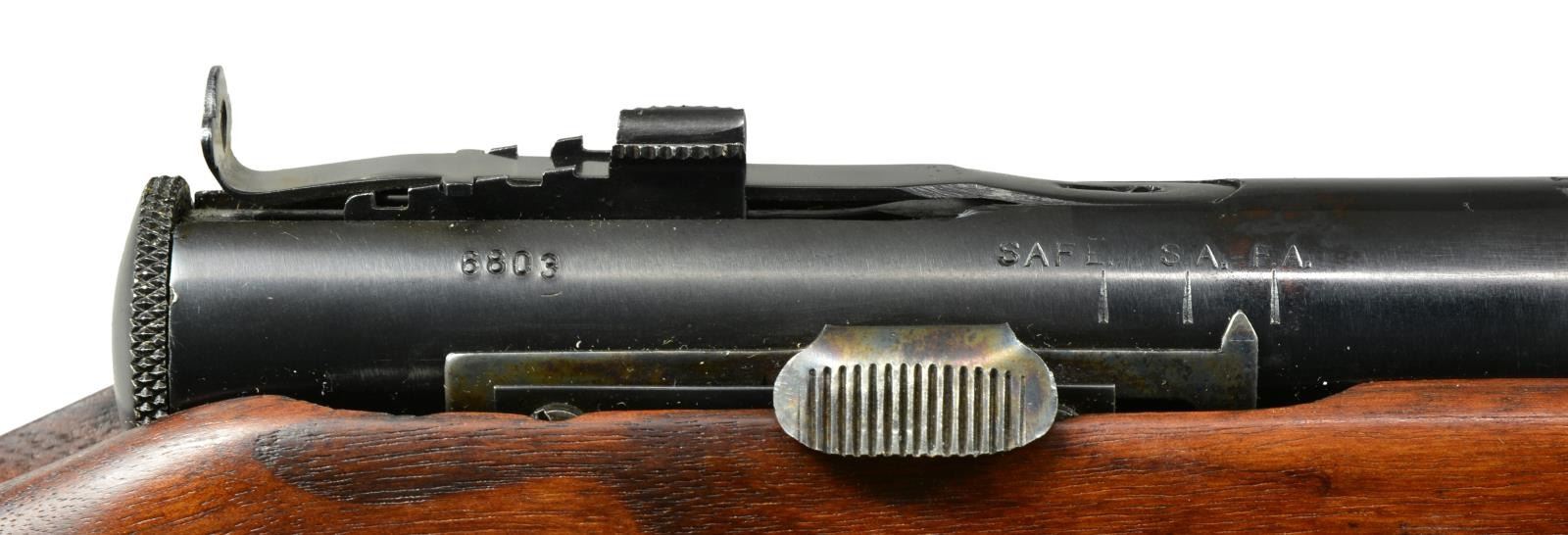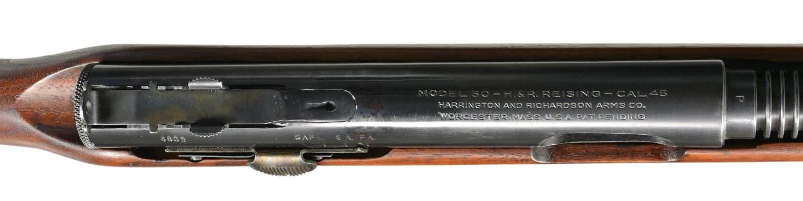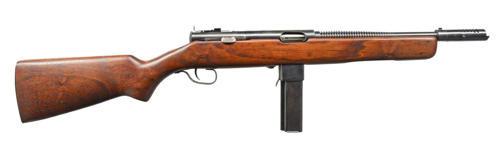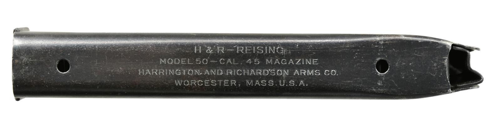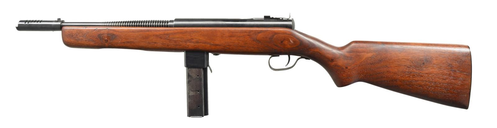Cal. 45. S# 6803. Bbl. 14". Very early, possibly first year production variant of the H&R Reising SMG. There are several features that are indicative of the early guns most often identified as commercial, though H&R has not ever acknowledged any distinction between separate commercial & military models. Deep blue finish on all exposed metal surfaces. 29 Fin tapered bbl. terminating at slotted muzzle brake. Oblong safety/selector which exhibits interesting case coloring. 3.75" oval access slot under stock for action bar. 2 Screw stamped trigger guard. Front sight fixed blade & rear sight elevation adj. peep. Markings on top of receiver (read from right side as opposite to left side oriented stamping on more common models) “MODEL 50-H&R REISING-CAL. 45 / HERRINGTON & RICHARSON ARMS CO. / WORCESTER, MASS. U.S.A. Pat. Pending”. Safety selector markings include “SAFE-S.A.-F.A.”. Blued 20 rd. mag. well. Dark stained hardwood stock & metal buttplate. Take down screw rear of mag. well requires screw driver for disassembly, unlike the more current knurled knob version. MAGS: 1 factory 20 rd. CONDITION: bluing on all exposed metal surfaces is thick & rich, approx. 1.5" area of thinning/scratching at 10 o’clock on receiver. Light staining in finish on receiver in front of rear sight. Stock is exemplary w/ only few light impressions & two hairline fractures that appear to follow the grain on right side. Fire control mechanism appears to function correctly when cycled by hand. Shiny bore w/ strong rifling. NATIONAL FIREARMS ACT MG REQUIRING BATF TRANSFER BEFORE TAKING POSSESSION. FULLY TRANSFERABLE. (03-1480/JZ). CURIO CLASS III. $4,500-6,500.