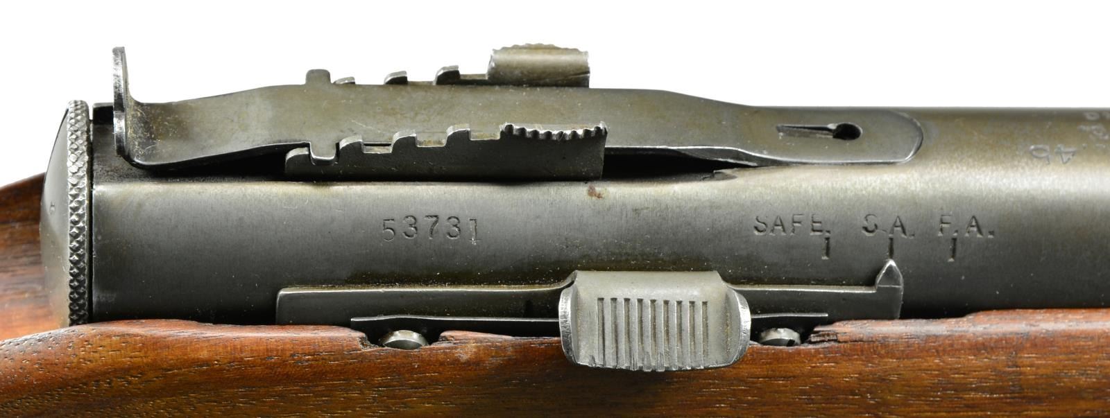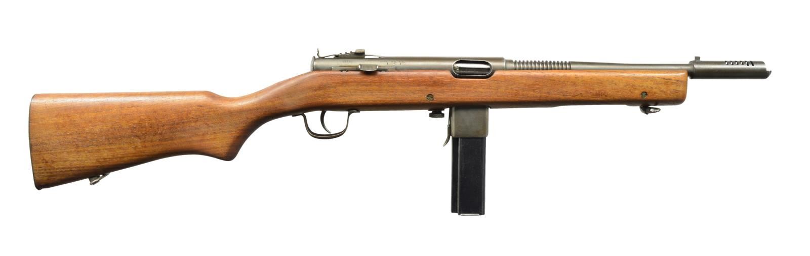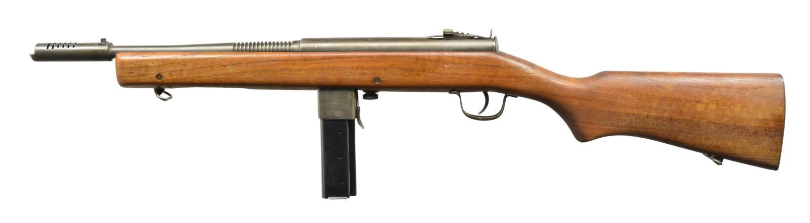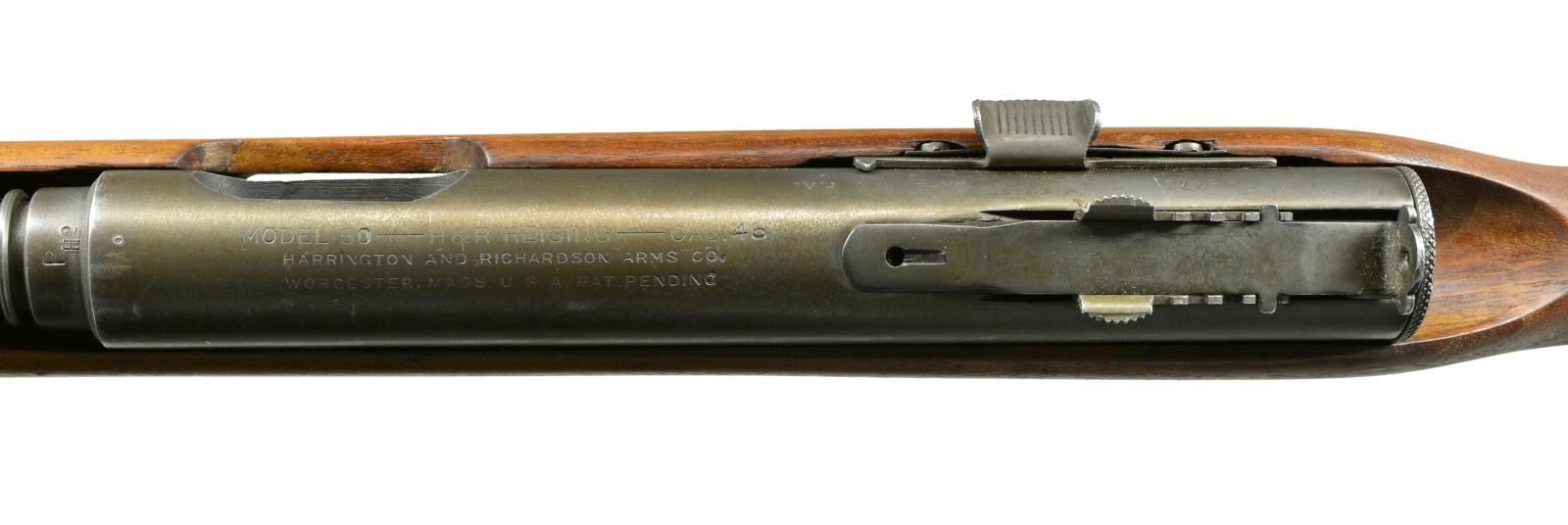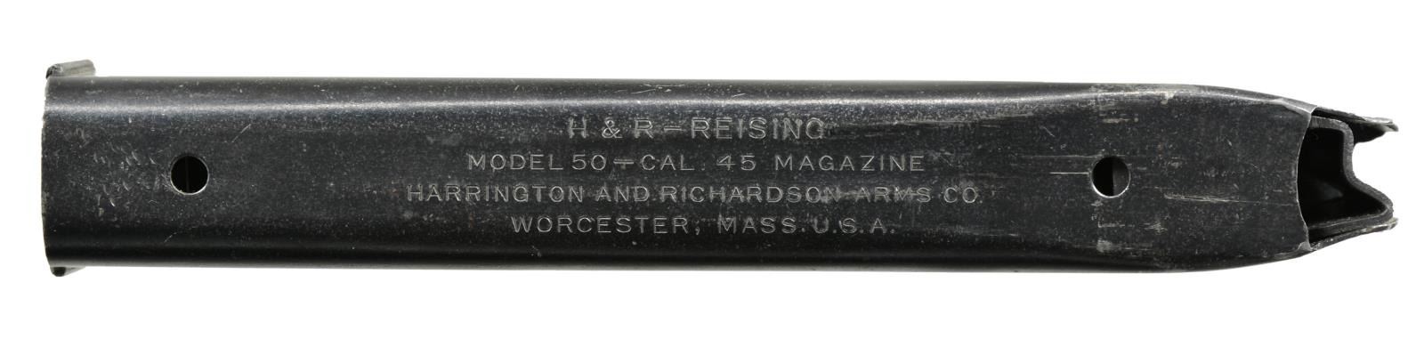 Cal. 45. S# 53731. Bbl. 13". Designed just prior to WWII, the Reising SMG & its variations would be mfg. in numbers upwards of 100,000 by 1945. W/ a primary customer of the USMC they would be eventually found in both military & commercial applications & as far away as Soviet Russia. Being a little ahead of its time, it was mfg. to fire in a closed bolt configuration which would later become common because of its numerous advantages. Though it never received accolades for it, it had potential to be extremely accurate due to its advanced fire control group & locking bolt mechanism. While feeding devices are commonly available in multiple capacities, the Reising was unusual in that the mag. well determined the capacity, available in both 12 rd. & 20 rd. configuration. It was a select fire system, allowing the operator to choose between semi-auto & full-auto. It had a semi finned bbl. & hardwood stock along w/ a slotted muzzle brake. Front sight is drift adj. blade & rear sight is an elevation adj. peep. Charging or cocking is accomplished utilizing a recessed handle below the bbl. Sling swivels attached to the stock front & rear. Metal buttplate. Markings on top of receiver include “MODEL 50-H&R REISING-CAL. 45 / HARRINGTON & RICHARDSON ARMS CO. / WORCESTER, MASS. U.S.A. Pat. Pending”. Safety/Selector markings include “SAFE - S.A. F.A.”. MAGS: 1 factory 20 rd. CONDITION: original finish is complete & thorough on all exposed parts w/ normal thinning typical of storage wear. Bbl. & muzzle brake have a light patina staining, as does mag. well exterior. Stock appears free of any major defects & is void of typical scratches, dents or impressions which are normal for firearms of this era. There is number 8 stamped into tip of forend directly under muzzle brake. Fire control mechanism appears to function correctly when cycled by hand. Shiny bbl. w/ good bore. NATIONAL FIREARMS ACT MG REQUIRING BATF TRANSFER BEFORE TAKING POSSESSION. FULLY TRANSFERABLE. (03-1482/JZ). CURIO CLASS III. $3,500-5,500.