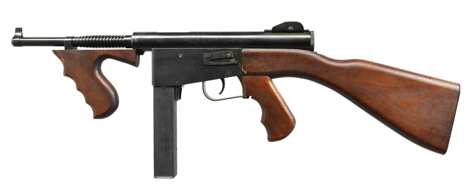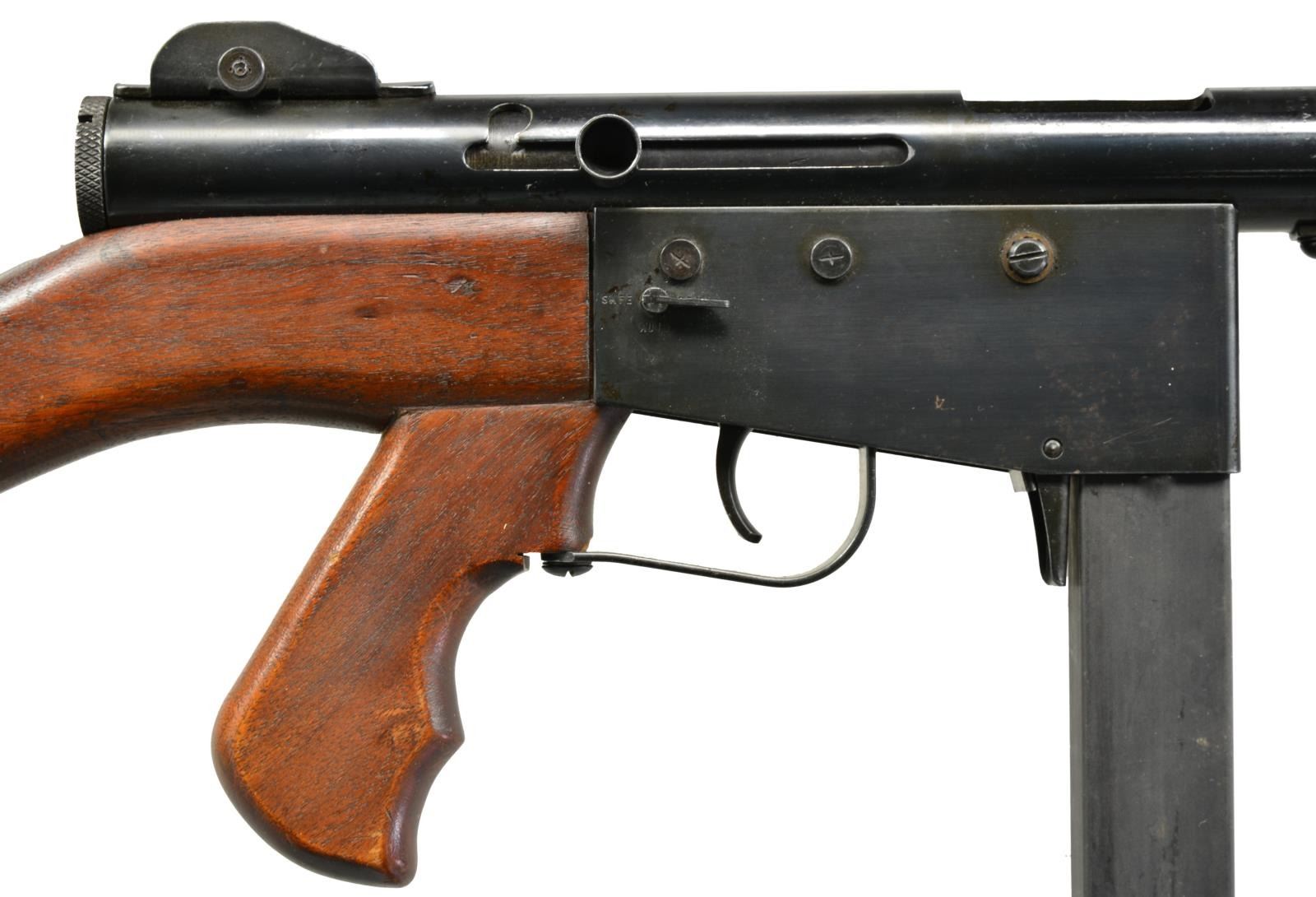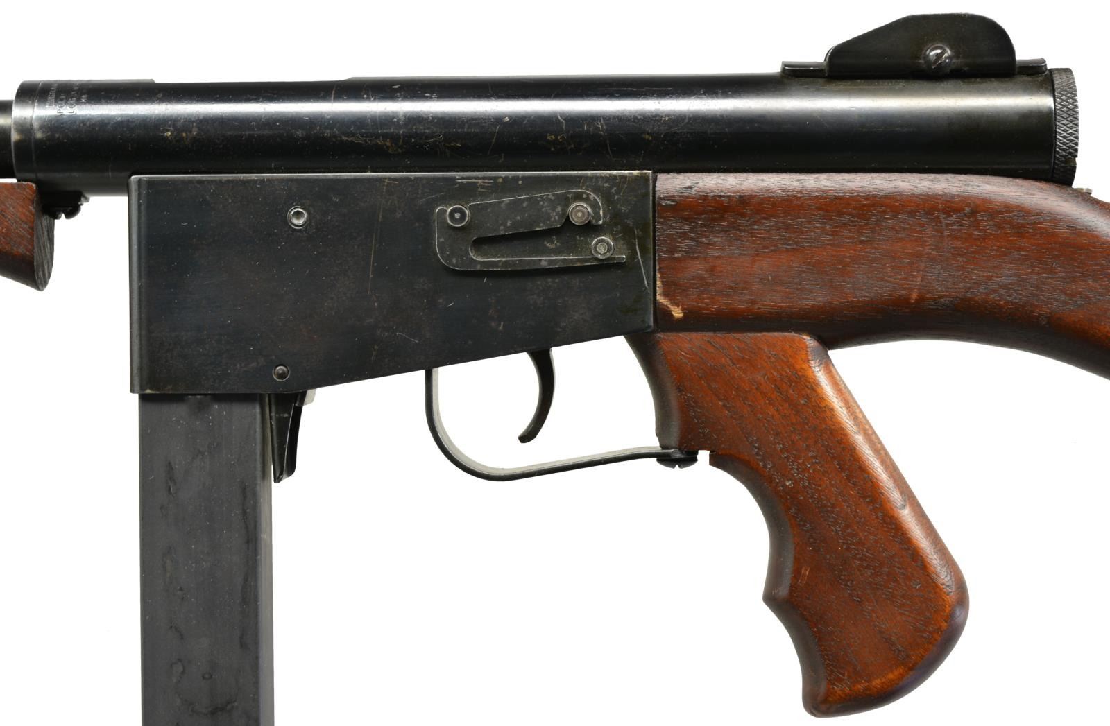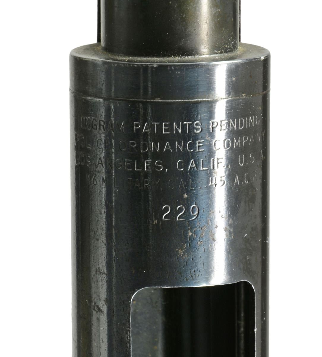 Cal. 45 ACP. S# 1229. Bbl. 9". Gordon Ingram’s second SMG design started life in 1947. Though its outwards appearance shared characteristics of the highly popular Thompson, upon closer inspection it was a very different design all together. Rather than utilizing expensive milled & fitted parts, Ingram took the direction of sheet metal stampings to reduce cost and improve mass production capabilities. The new SMG was originally full auto only, though by the time they went into production they were offered as select fire. An interesting feature of the M6 is that while it has a safety/selector above the trigger on the right side of receiver, if its set to the full auto setting the operator can switch modes of fire simply by pressure utilized on trigger. A short trigger pull functions as semi auto & must be released & squeezed again to fire a following round, where a full pull to the rear achieves full auto fire until the trigger is released. There were 3 models offered, including the Police, the Guard & the Military; each having their own definitive characteristics. This model, the Police model, w/ its vertical fore grip & finned bbl. mostly resemble the Thompson SMG. The receiver is a rnd., tubular design & trigger group is protected by a lg. rectangular metal guard. Charging is accomplished utilizing the handle on the right side of the receiver where a safety slot is incorporated towards the rear. Front sight is fixed blade & rear sight is windage adj. protected peep. There are 15 fins on bbl. above the vertical front grip. Rear grip is incorporated into the stock & all are a reddish dark stained hardwood. Right side of stock exhibits what appears to be department inventory number 2. Steel buttplate. MAGS: 3-30 rd. CONDITION: all exposed metal surfaces are finished in a deep, dark blue which has gently patinaed over the years in the receiver trigger group area. Bbl. appears not to have been as affected by the environment. Front vertical grip & shoulder stock both exhibit some impressions & gouging, though nothing apparently affecting integrity or performance is outwardly visible. Fire control mechanism appears to function correctly when cycled by hand. Bore is shiny w/ sharp rifling. NATIONAL FIREARMS ACT MG REQUIRING BATF TRANSFER BEFORE TAKING POSSESSION. FULLY TRANSFERABLE. (03-1472/JZ). CURIO CLASS III. $3,500-4,500.