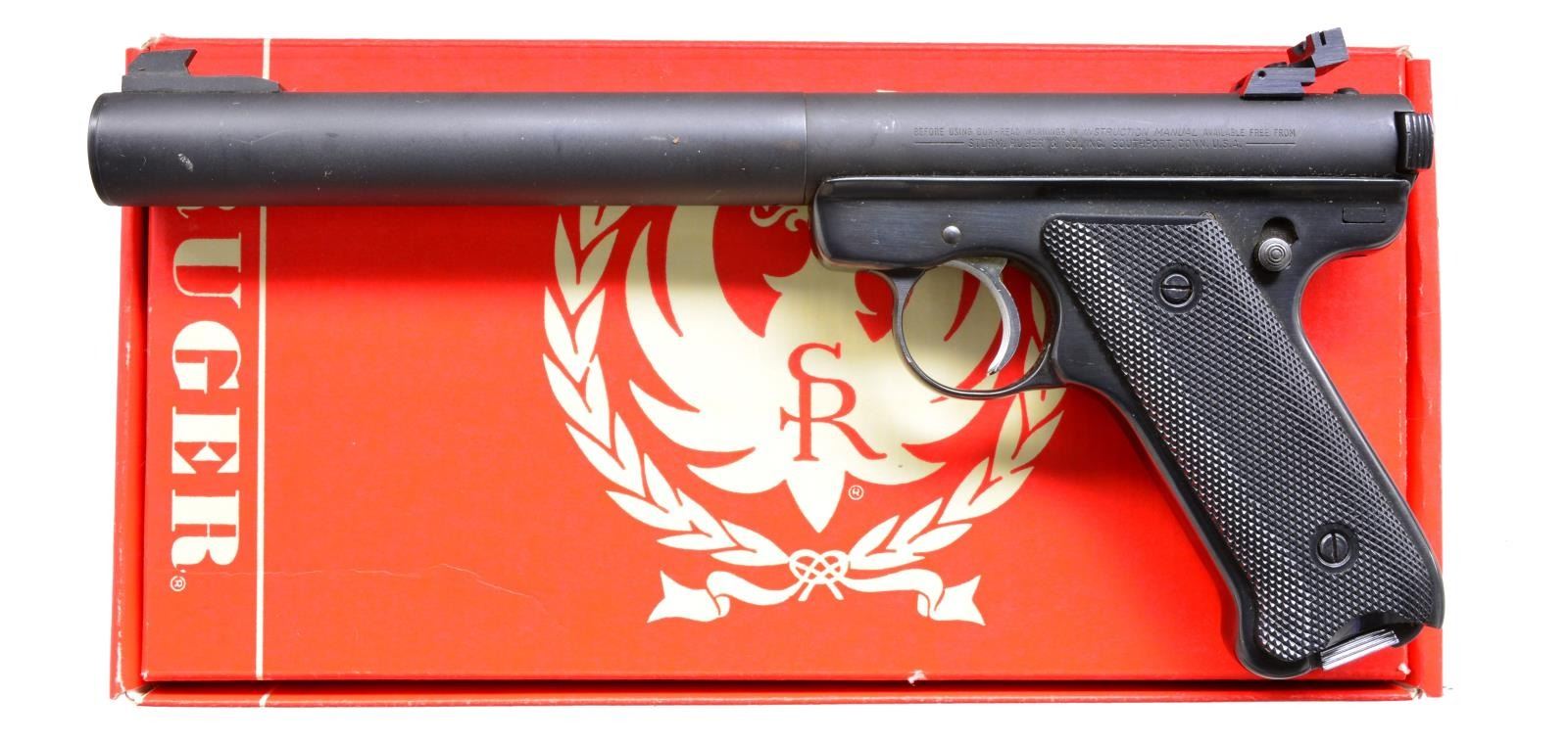 Cal. 22 LR. S# 15-40261 (pistol). S# S-RST-0016 (suppressor). Bbl. 7 1/2". An early original Phil Dater, M.D. design under the banner of AWC. The integrally suppressed Ruger pistol was a benchmark for both recreational shooters & professionals. The design at first glance appears to be a traditional bull bbl. target pistol alleviating the necessity for anything of additional circumference threaded onto a standard bbl. This extremely effective design allowed the owner to utilize standard holsters & accessories marketed for the MK1 while providing great balance & sound suppression in one package. Exposed receiver & tube are matte black parkerized while the grip frame retains its original blued finish. Front sight target blade w/ elevation & windage adj. rear target sight. MAGS: 1 factory 9 rd. UNATTACHED ACCESSORIES: original Ruger MK1 box & instruction manual. Original outer AWC box w/ original AWC documentation & disassembly / assembly / maintenance tooling. CONDITION: very little thinning on external components illustrate that this gun spent most of its time in a collection w/ occasional trips to the range. Fire control mechanism appears to function correctly when cycled by hand. NATIONAL FIREARMS ACT SUPRESSOR REQUIRING BATF TRANSFER BEFORE TAKING POSSESSION. FULLY TRANSFERABLE. (03-1490/JZ) & (20-1890/JZ). MODERN CLASS III. $200-400.