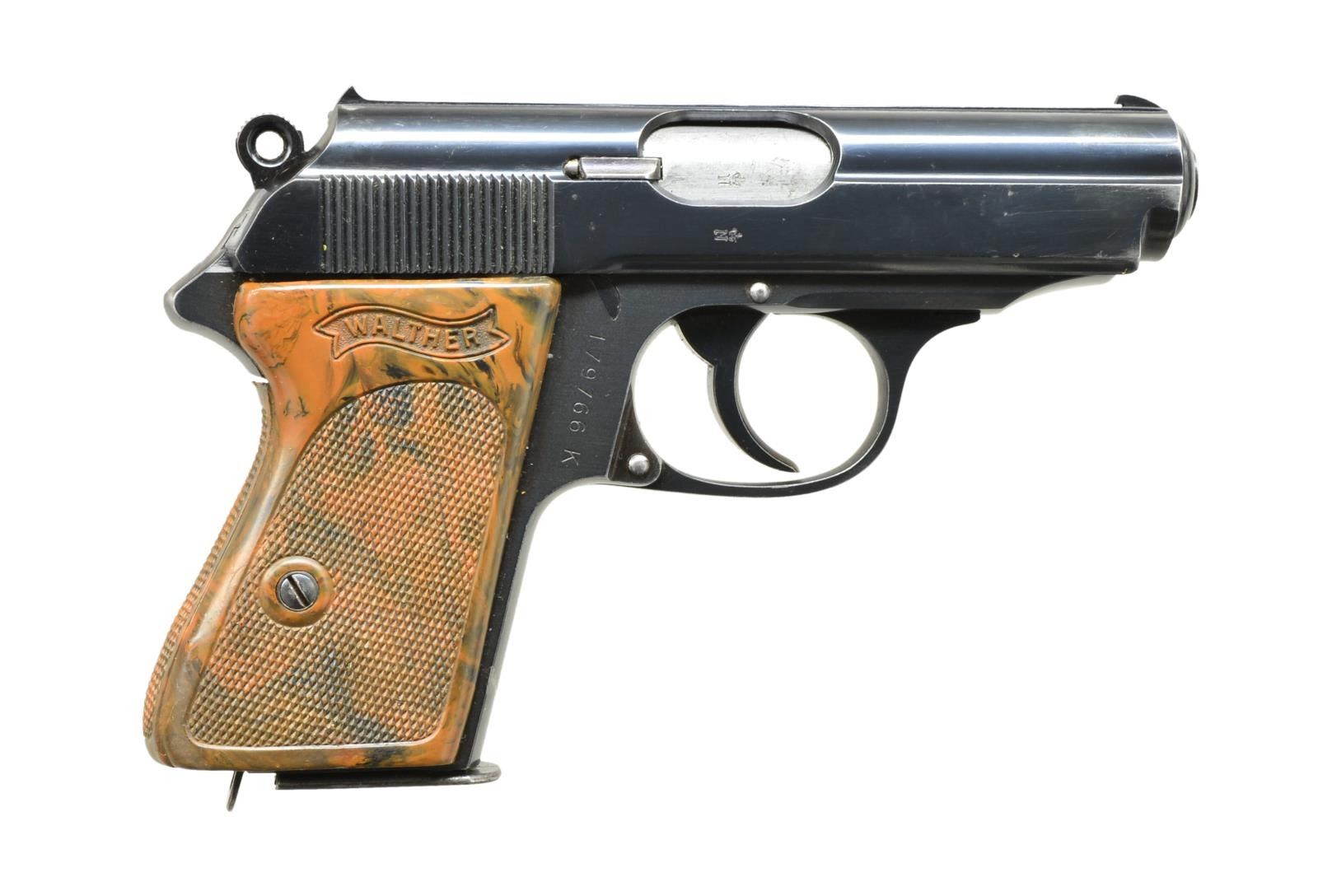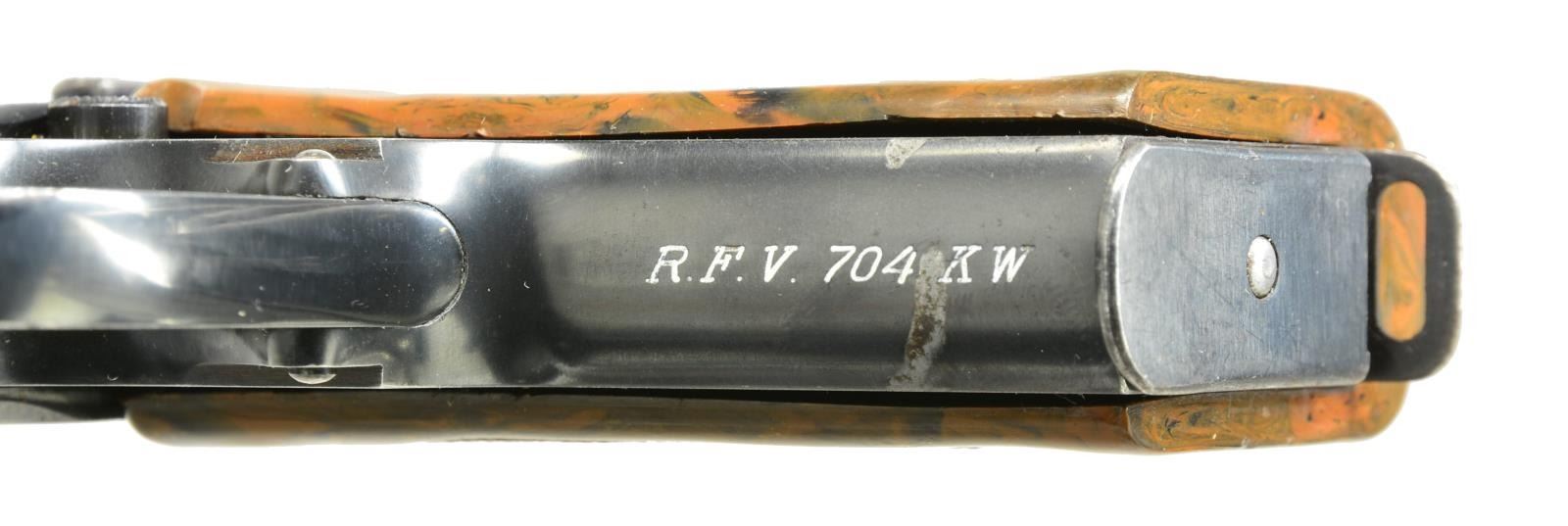 Cal. 7.65mm. S# 179766K. Standard configuration w/ crown “N” proofs on polished bolster & high gloss slide w/ usual Walther marks on left side. Scratch number on slide matches frame. Satin finish frame w/ brown plastic wraparound grip is engraved on front strap “R.F.V. 704KW” (Reich Finance Administration). UNATTACHED ACCESSORIES: black leather commercial type holster. CONDITION: very good – fine. Metal parts retaining 80% blue, silvered on muzzle & sharp edges w/ considerable scattered pitting mostly on left side of slide. Grips are fine w/ some epoxy repair above banner on left side. Shiny bore, mechanically good. Mag. w/ wear matching pistol. Holster leather is very good & repolished. (20-3209/MGM). CURIO. $1,500-2,200.