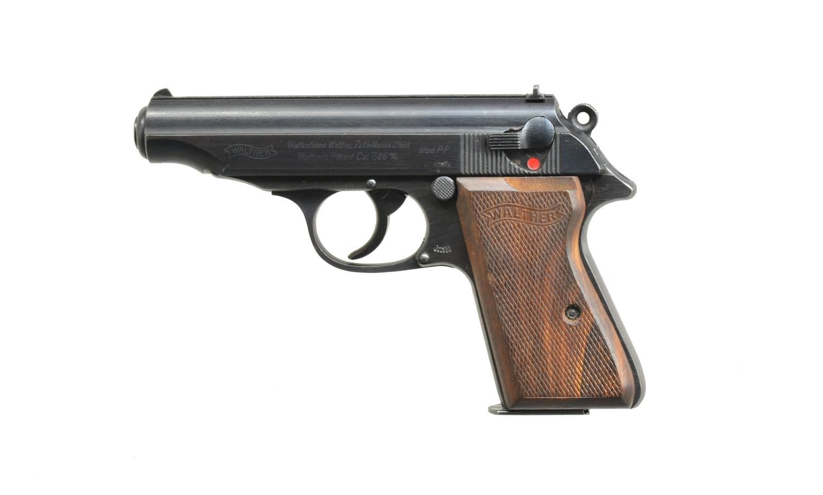 BEECH WOOD GRIPS & WAFFENAMT PROOFS. Cal. 7.65mm. S# 360364P. 1944 Production standard configuration w/ eagle “N” proofs on blued bbl. & serial numbered slide. Bbl. & frame have matching Waffenamt “WaA 368”. Steel base mag. w/ banner is marked “PP 7.65MM”. CONDITION: very fine. All metal parts retaining over 90% original blue w/ some scattered flecking & a couple of sm. spots of light pitting. Grips are very fine w/ compression on right side near assembly screw. Sharp, shiny bore. (20-3310/MGM). CURIO. $1,200-1,800.