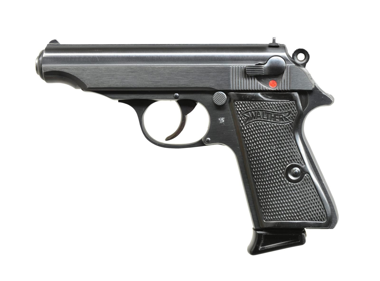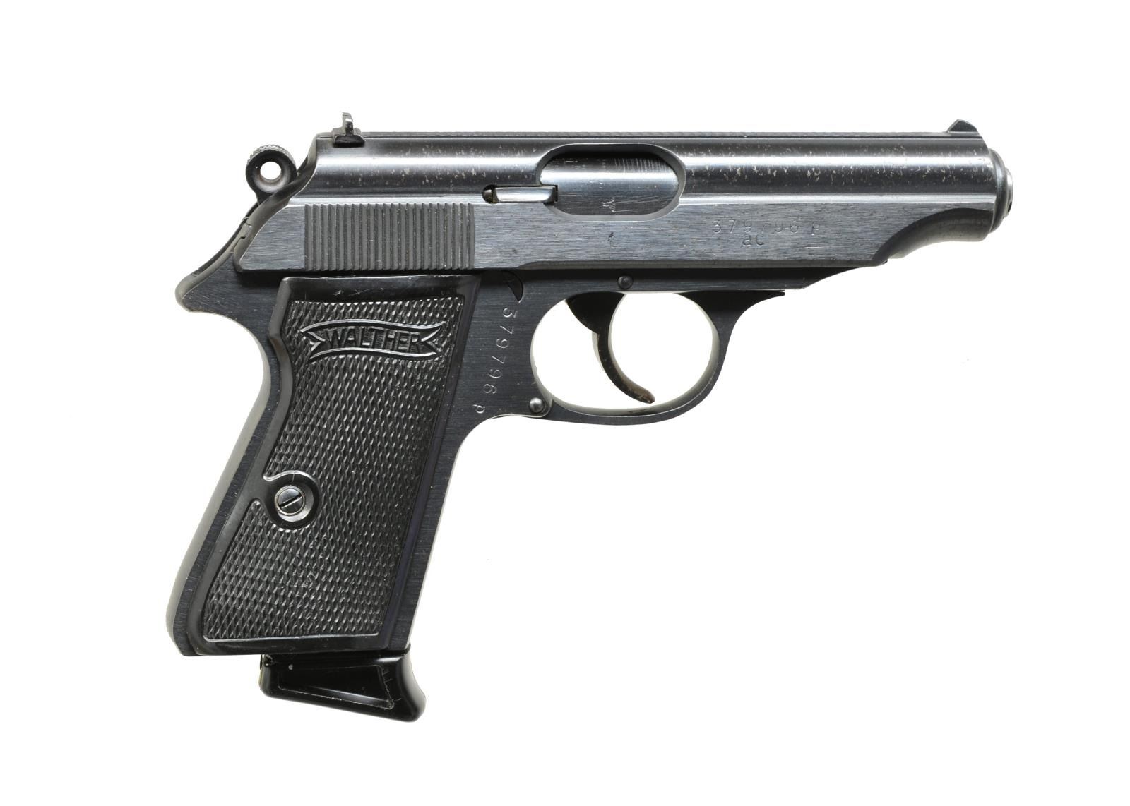 ARSENAL REFINISHED PP. Cal. 7.65mm. S# 379796p. Standard configuration, 1944 production, most likely refinished for police use. Blued bbl. has eagle “N” proof w/ remnants of proof under ejection port, serial numbered & “ac” marked slide. No Walther markings on left side. Left side of frame is stamped w/ "eagle F” proof. Black hard rubber grips. Walther banner mag. marked “PP 7.65m/m” has black plastic extension. CONDITION: very fine as arsenal refinished w/ over 95% blue over some pitting on all metal surfaces. Slide & frame resurfaced at factory. Lettering & proofs quite light except subsequent eagle “F” proof on left side of frame. Shiny bore, mechanically good. (20-3326/MGM). CURIO. $1,200-1,800.