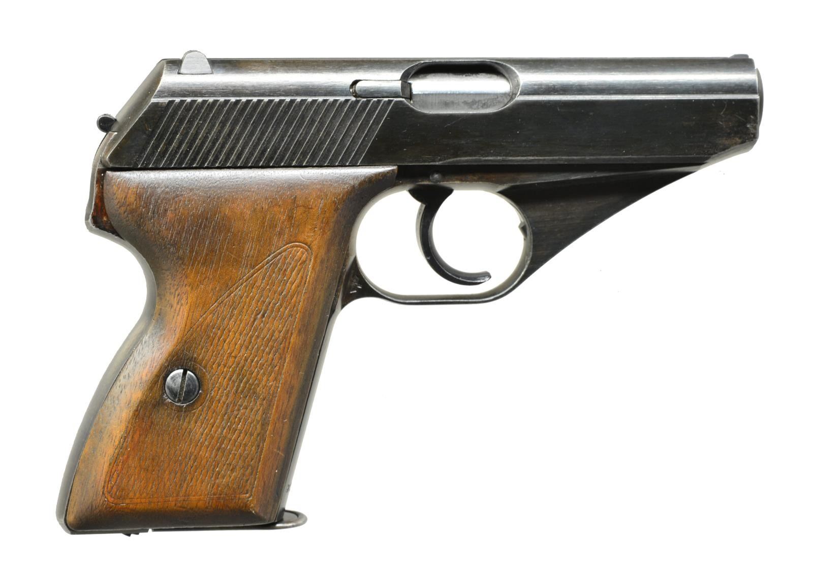 SEMI AUTO PISTOL. Cal. 7.65mm. S# 914718. Bbl. 3 1/4”. This very scarce Kriegsmarine variation is 1 of only 4,500 examples. Tiny eagle “M/3” acceptance proof on left trigger web. Matching numbers. Checkered walnut grips. Eagle proofed slide & frame. One of the hardest to find Kriegsmarine marked collectible pistols. MAGS: 1-7 rd. zinc bodied unmarked blued base mag. CONDITION: nice example showing some honest wear on high edges, muzzle & around trigger area w/ strong bluing in other areas. Grips show light wear w/ fine handling marks. Near excellent bright shiny bore w/ nice rifling. Overall a nice example of a hard to find German Naval pistol that possibly served on the high seas. (20-3208/ZAL). CURIO. $1,500-2,000.