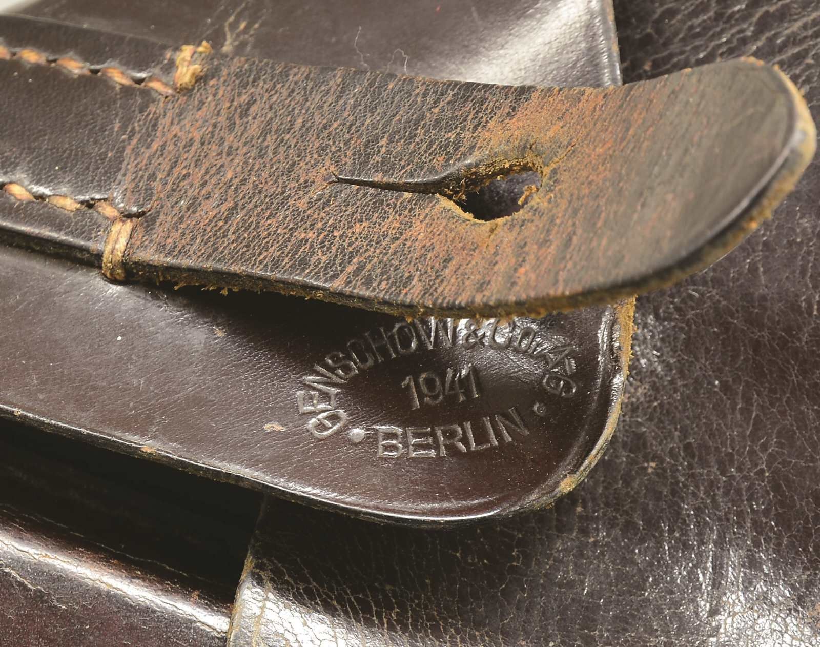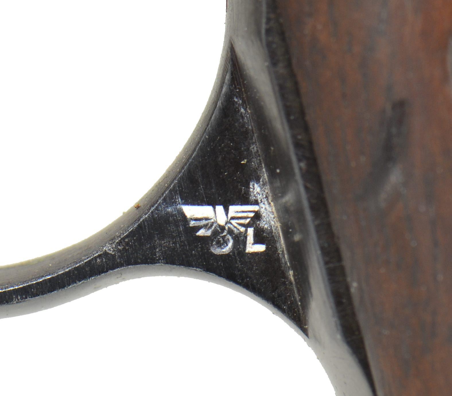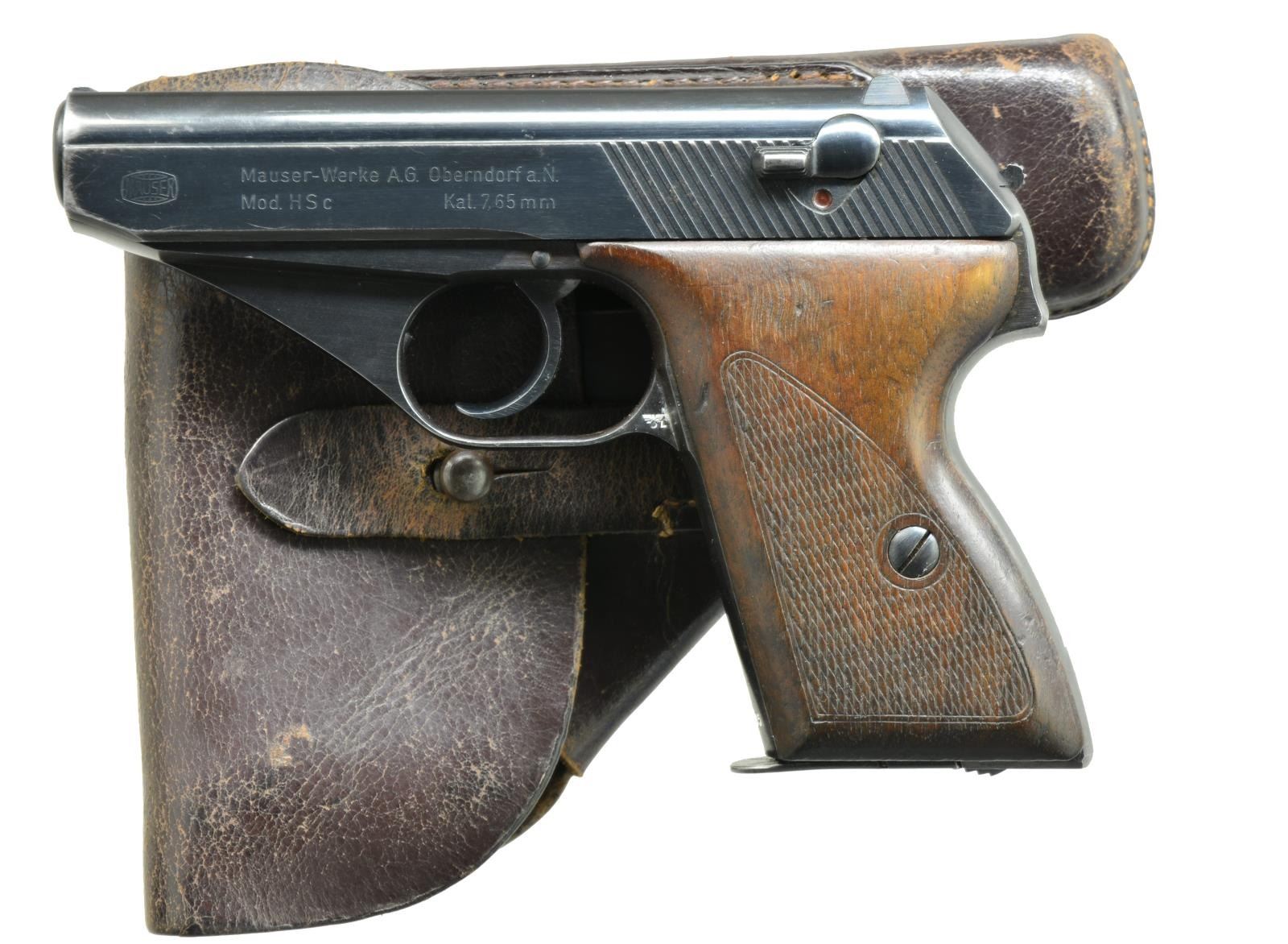 Cal. 7.65mm. S# 762885. Bbl. 3 1/4”. A nice eagle “L” police marked HSc pistol rig w/ high polish blue. Matching numbers. Eagle “N” proof on bbl., slide & frame. Checkered walnut grips. Provision for lanyard. Checkered walnut grips. MAGS: 2-7 rd. Mauser banner mags. (1 is numbered “762801”/ “1”). Extremely close to the S# of this gun. UNATTACHED ACCESSORIES: Genschow & Co. AG 1941 date Berlin mfg. brown leather flap holster. CONDITION: overall fine w/ light muzzle & high edge wear. Scattered faint handling marks w/ fine freckled mild pin prick oxidation on straps. Very good grips show scattered light handling marks & light dents. Very good plus shiny bore w/ good rifling. Very good holster w/ some scuffing, minor crinkling on flap w/ very strong markings. (20-3291/ZAL). CURIO. $1,000-1,500.
