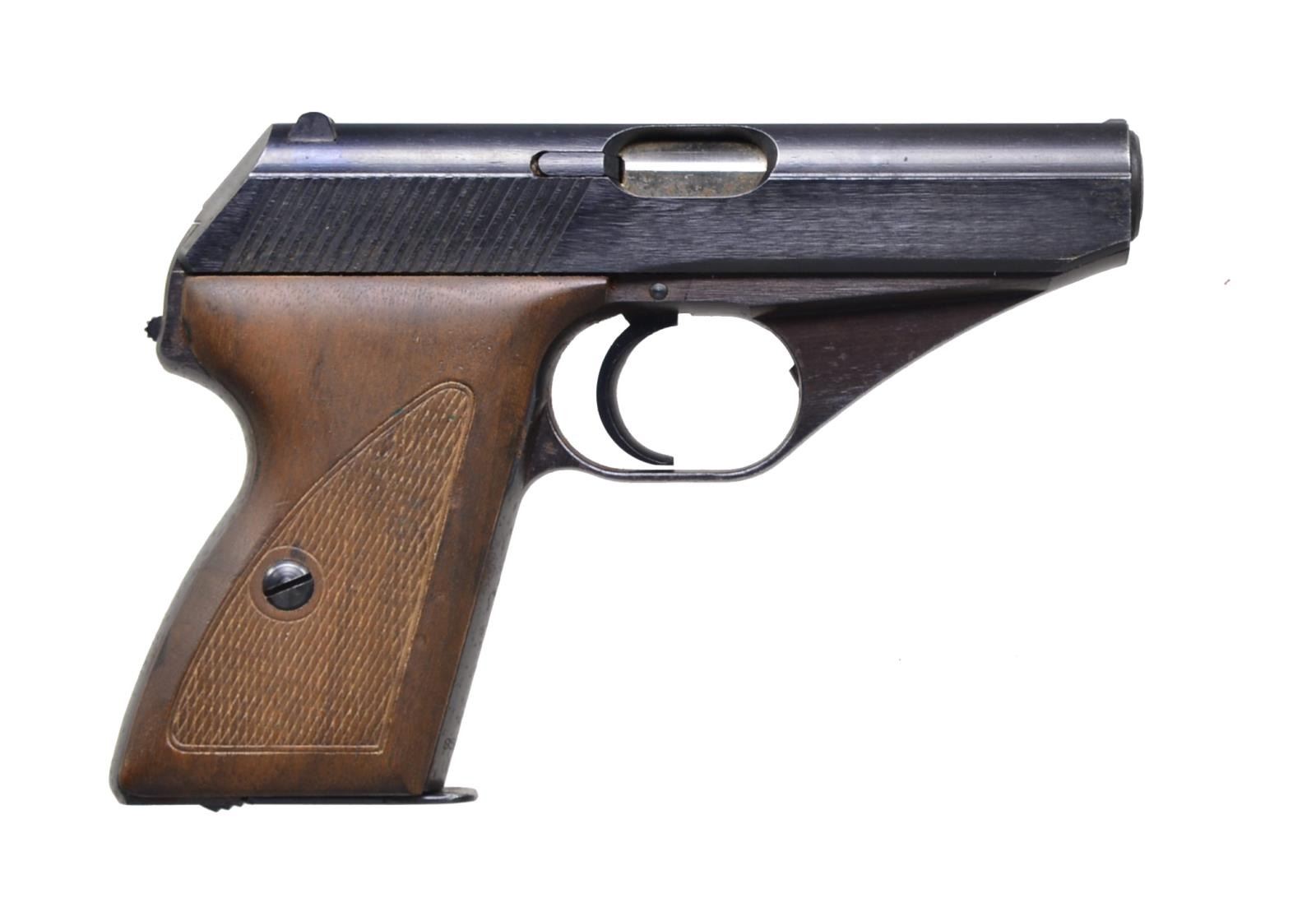 Cal. 7.65mm (32 ACP). S# 858921. Bbl. 3 1/4". Blade front sight w/ fixed square notch rear sight. Blue finish. 2 Piece checkered walnut grips. Left side of trigger guard has eagle L early Nazi police proof. MAGS: 1 detachable 8 rd. CONDITION: 90% blue showing spots of surface corrosion. Grips show light marks. Bright bore w/ strong rifling. (20-2810/DS). CURIO. $500-700.