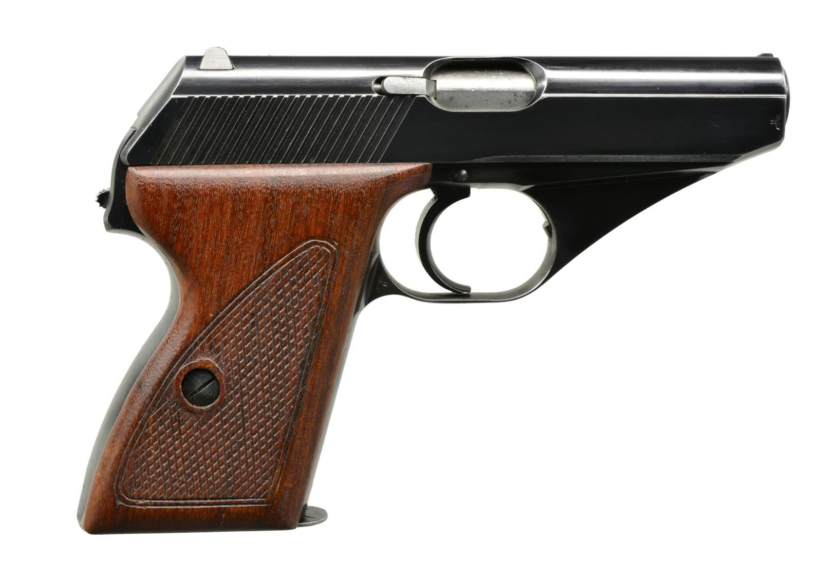 Cal. 7.65mm (32 ACP). S# 737342. Bbl. 3.4". Eagle 655 proofed on trigger guard plus eagle M on slide. Early gloss finished army model. Checkered walnut grips. MAGS: 1 very good Mauser marked 8 rd. w/ small dent in base. UNATTACHED ACCESSORIES: factory manual. CONDITION: good to very good bore w/ hint of frosting. Very good finish w/ occasional spot of pinprick oxidation & slight high edge wear. Very good grips. (20-1454/NW). CURIO. $400-600.