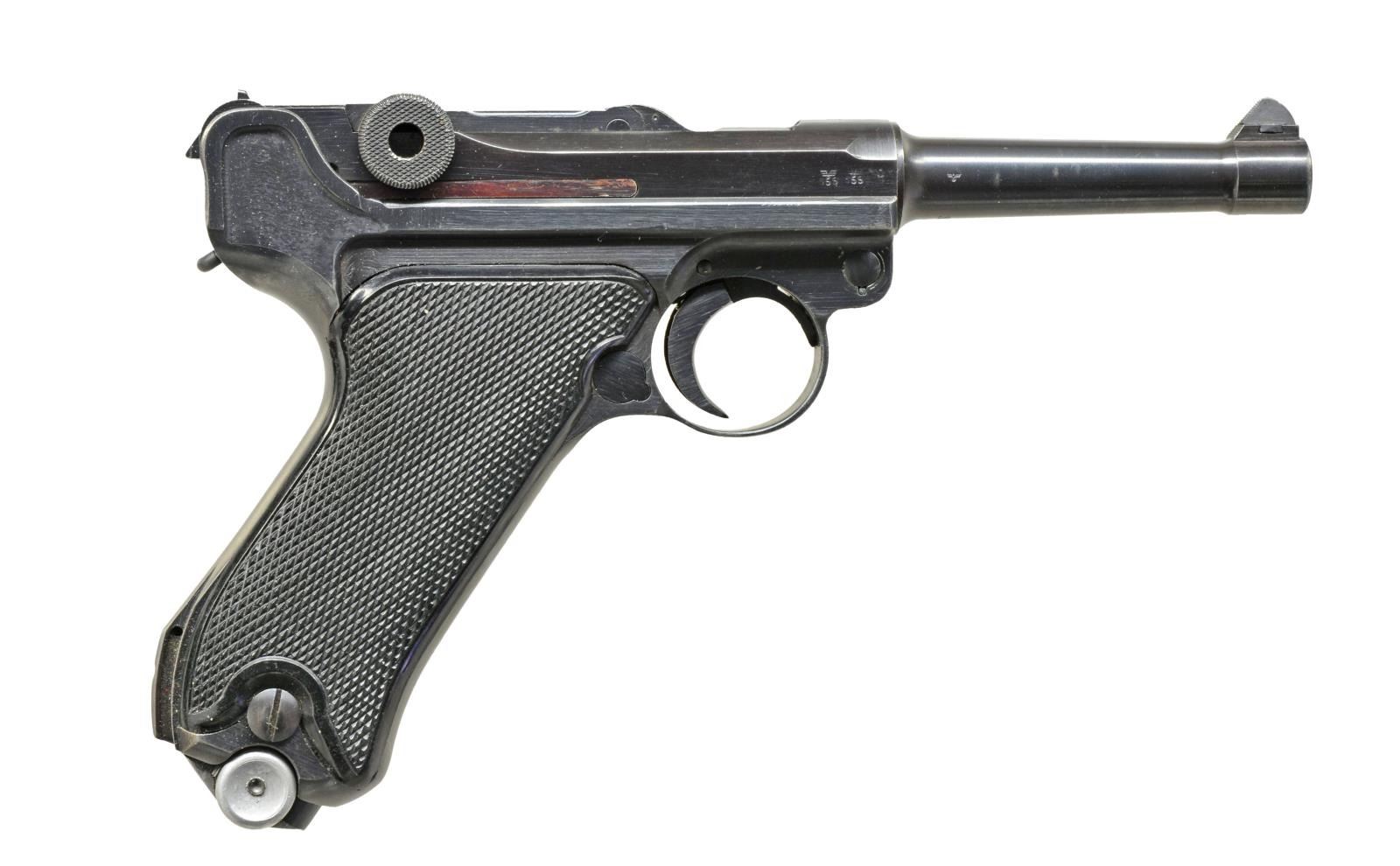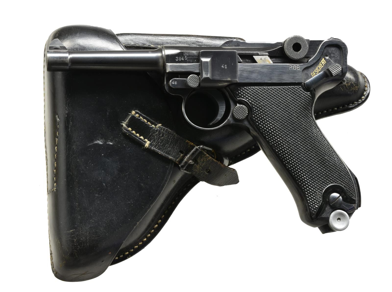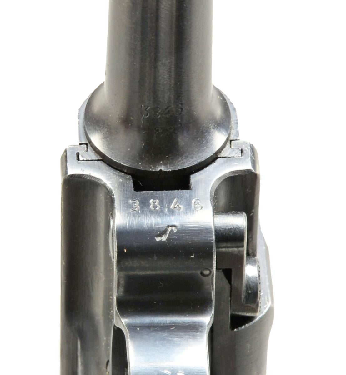 PISTOL. Cal. 9mm Luger. S# 3846r. Bbl. 4". Mfg. 1941 w/ early marks to include: eagle "655" proof. Approx. 25,000; mfg. 3,300n to 1,000. Proper all blue finish w/ P.08 on left frame flat. All matching #s including rear toggle pivot. MAGS: correct early fxo eagle 37 P.08 extruded mag. w/ early aluminum base numbered 3846r rather than unmarked plastic base of later models. UNATTACHED ACCESSORIES: very good eagle 655 proofed loading tool. Very good plus Moll Lederwarenfabrik black leather holster marked P.08 having buckle strap retention. Between belt loops marked "cxb / 41 / eagle WaA723". CONDITION: minimal thinning at some high points such as front of frame, side plate & stock lug. Overall near excellent w/ especially clear markings & contours. Near excellent grips & bore. Especially nice collectible Black Widow w/ early matching mag. (20-3349/NW). CURIO. $2,500-3,500.