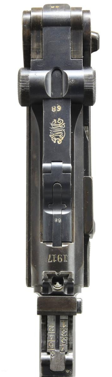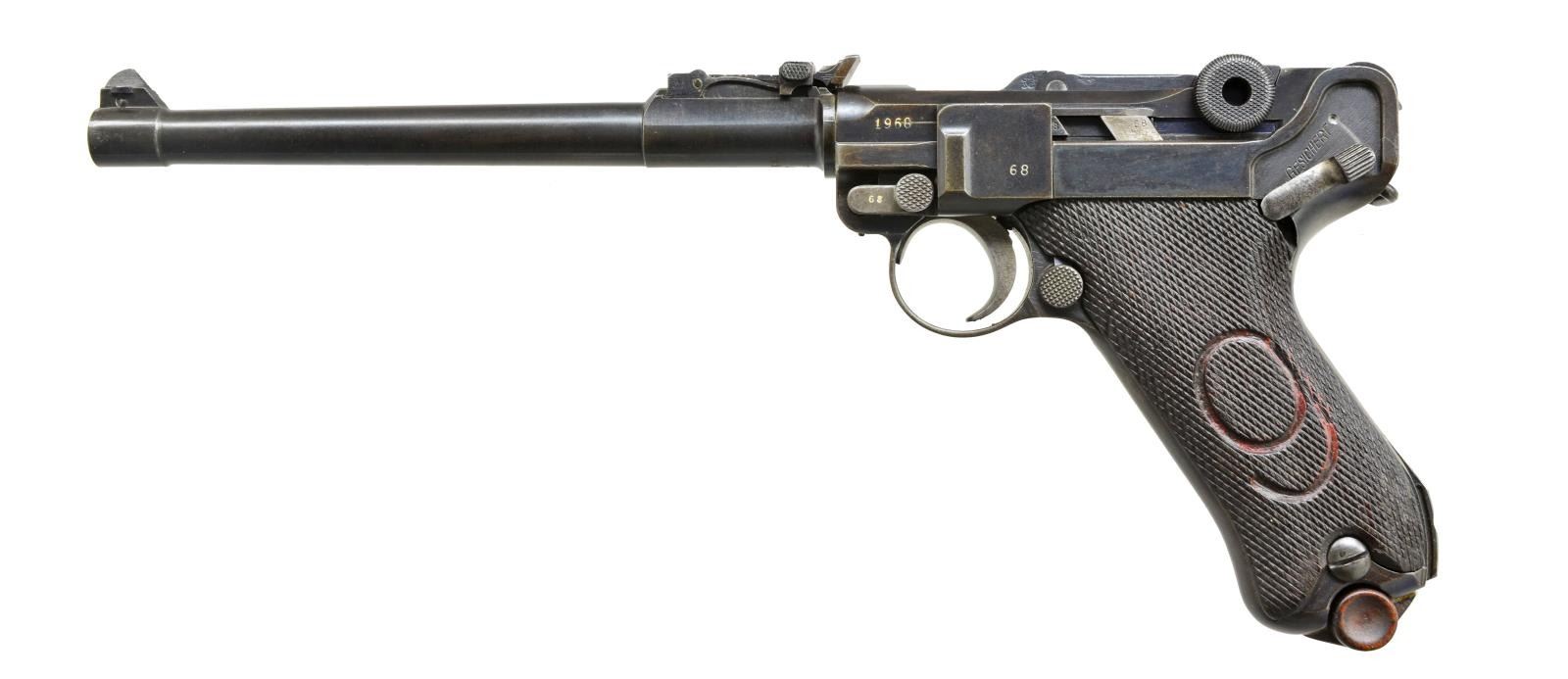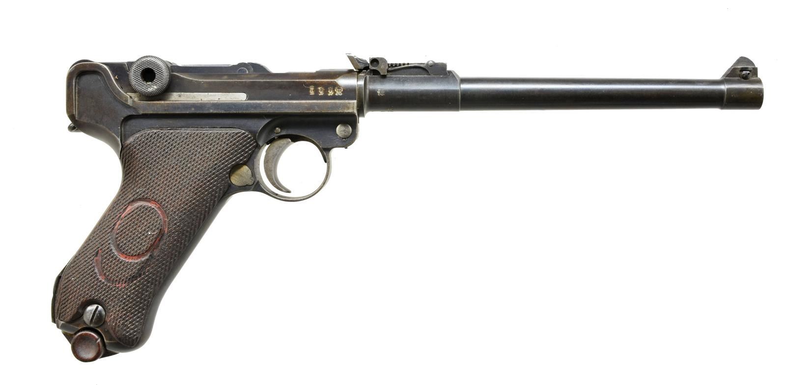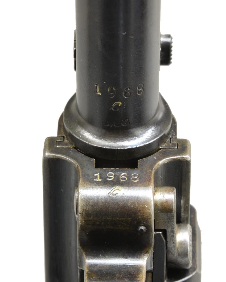 Cal. 9mm Luger. S# 1968c. Matching numbered 8" bbl., fine tune sights, receiver dated 1917 & sear. Remaining metal parts matching numbered except firing pin numbered "01". Matching numbered grips w/ faint numerals plus "N" & "W" on left; both w/ red "9" on exterior in Broomhandle style. MAGS: good plus 8 rd. w/ wood base marked front to spine on rear portion w/ faint "5929". CONDITION: very good arsenal quality refinish w/ very minimal high point wear. Somewhat gray toned straw colors & occasional spots of very faint prior pitting. Somewhat gray patina appearance to tops of frame & receiver ears. Dark hand worn grips w/ chip by safety lever. Good to very good bore w/ hint of wear & very light frosting in grooves. (20-3256/NW). CURIO. $2,000-3,000.