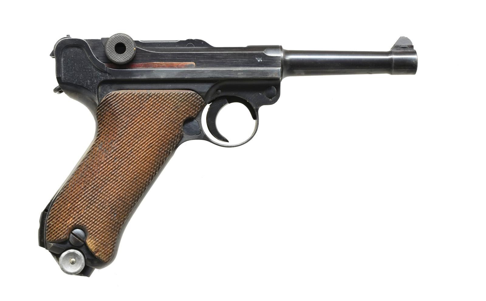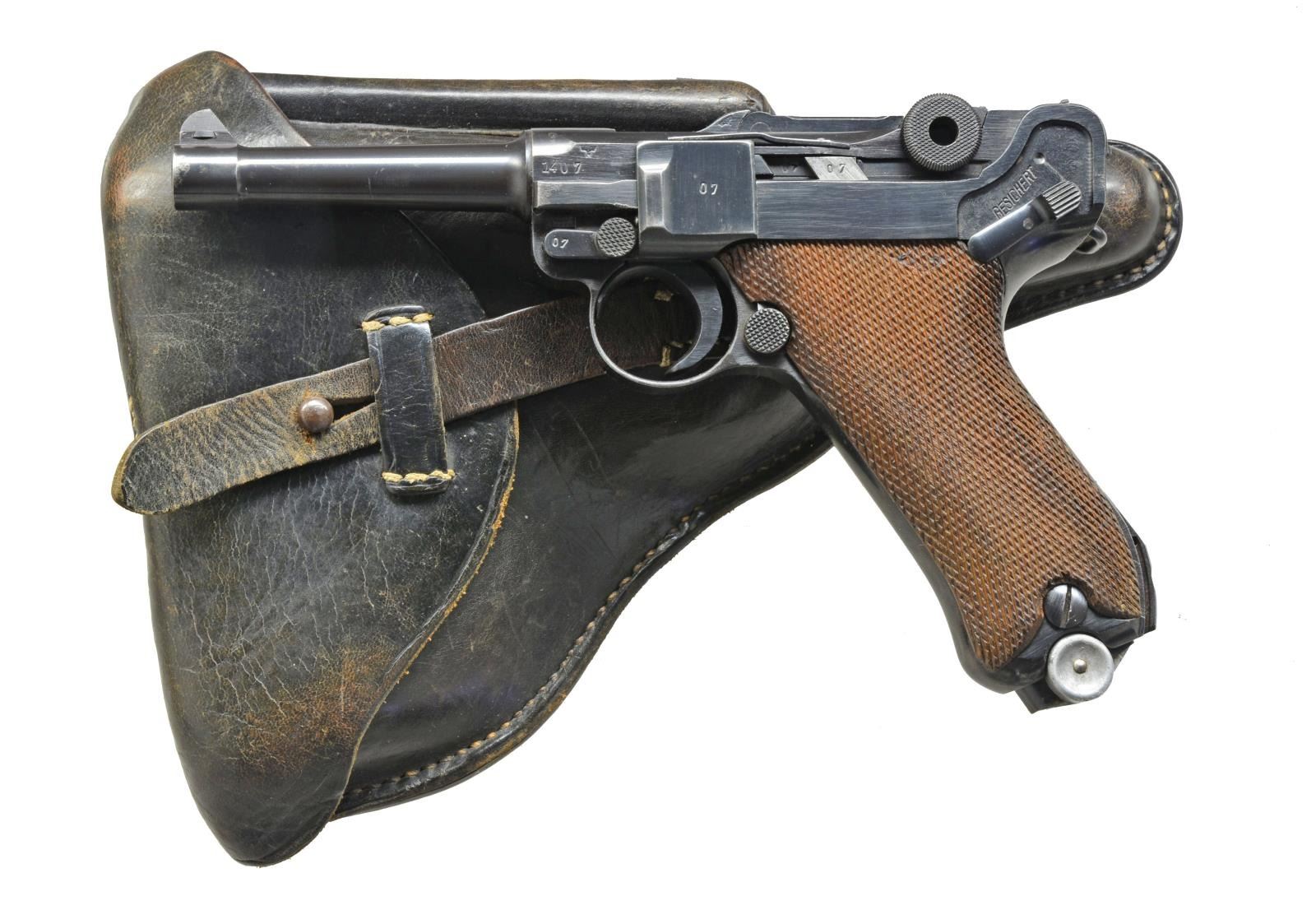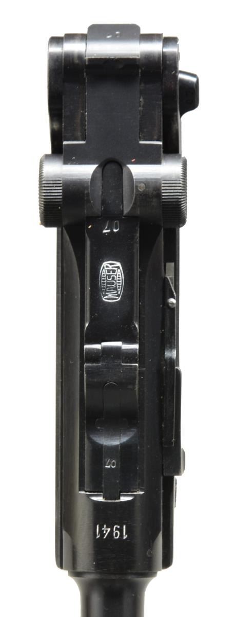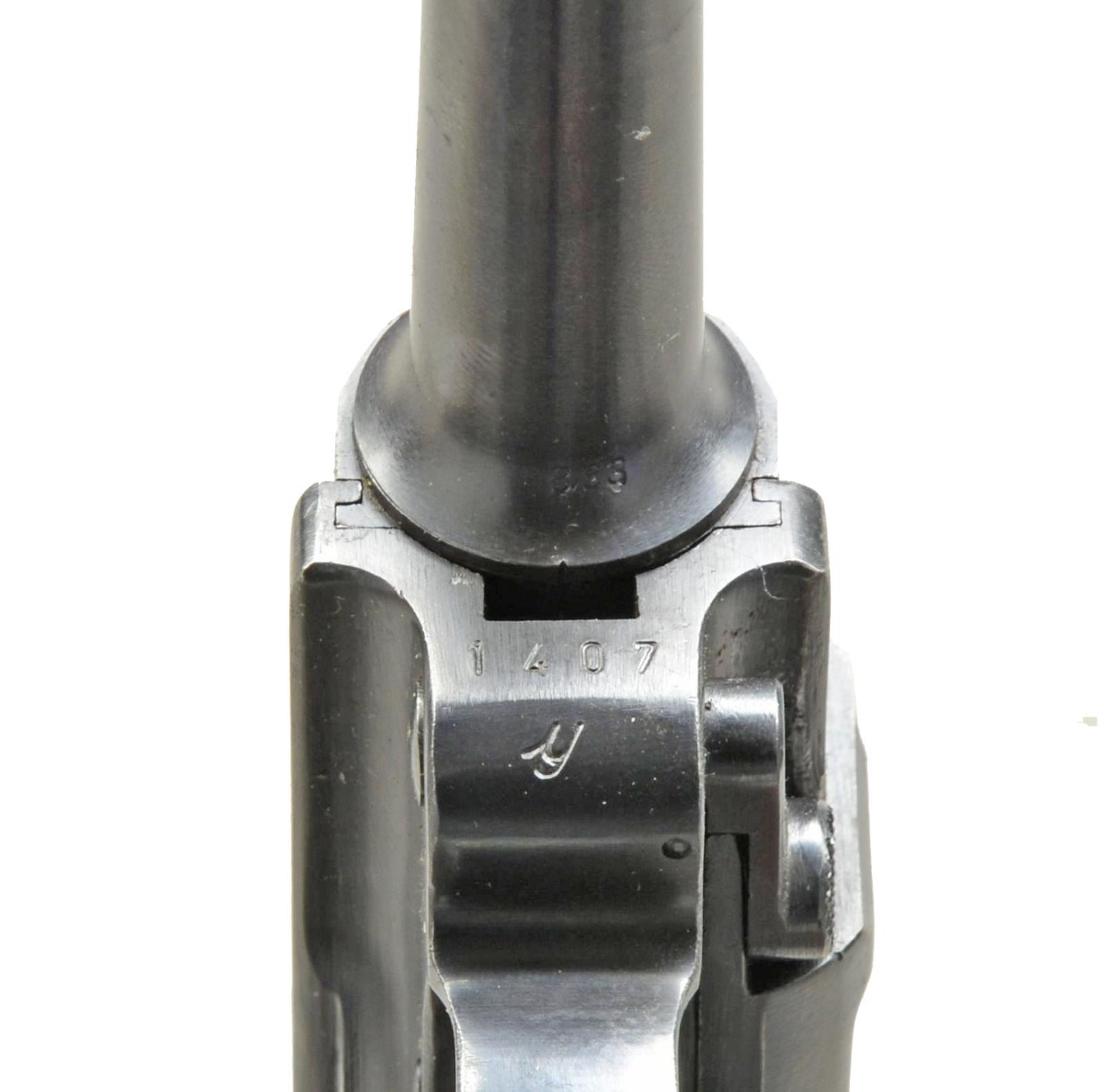 Cal. 9mm Luger. S# 1407y. Bbl. 4". Mfg. 1941 from S# 5801x to 2340y; approx. 5,915 units. Banner Police Models mfg. 1938-1942; 1939 most common & 1938 least. Correct features include: stock lug, all blue finish & eagle L receiver proof as used on 1939 & 1942 models. All matching #s (including rear toggle pivot) except 8.83 marked replacement bbl.; matching numbered checkered walnut grips having eagle 655 proofs. Above receiver S# is vertical eagle N proof. Fitted w/ police safety & not cut for mag. safety. MAGS: 2 -8 rd.: very good extruded w/ unmarked body plus matching numbered aluminum base additionally marked 2 / good lightly worn extruded fxo eagle 37 P.08 marked w/ aluminum base numbered “7386” plus sm. “42”. UNATTACHED ACCESSORIES: good plus black Otto Sindel of Berlin 1941 dated holster having eagle party symbol proof. Stud & strap retention; somewhat shiny takedown tool w/out markings having noticeable prior pitting. CONDITION: very good overall appearance w/ sharp contours & clear markings. Very light high point wear & slight functional wear. Good to very good dark grips w/ faint hand wear & some minimal damaged diamond tops. Near excellent bore. (20-3369/NW). CURIO. $2,000-3,000.